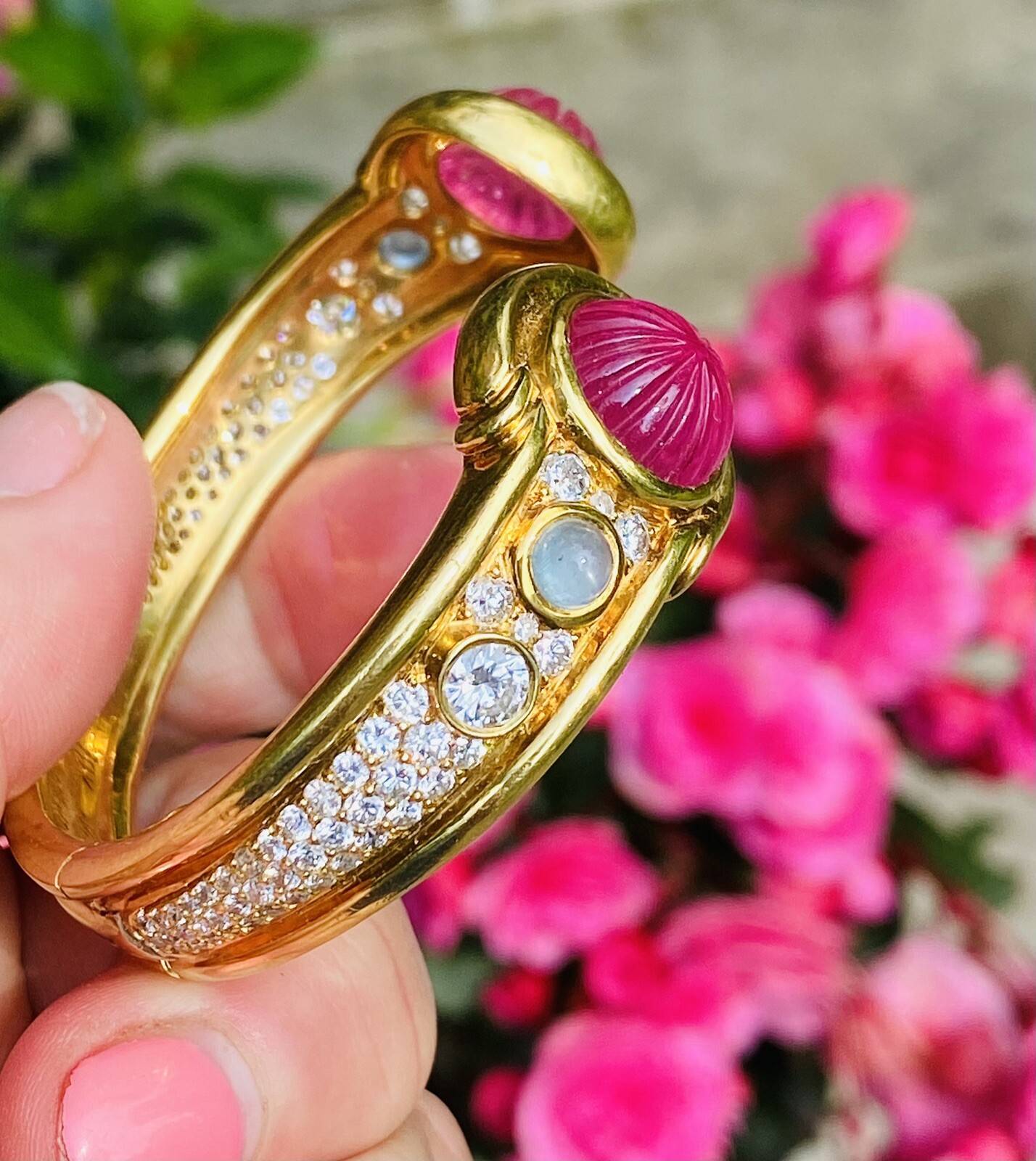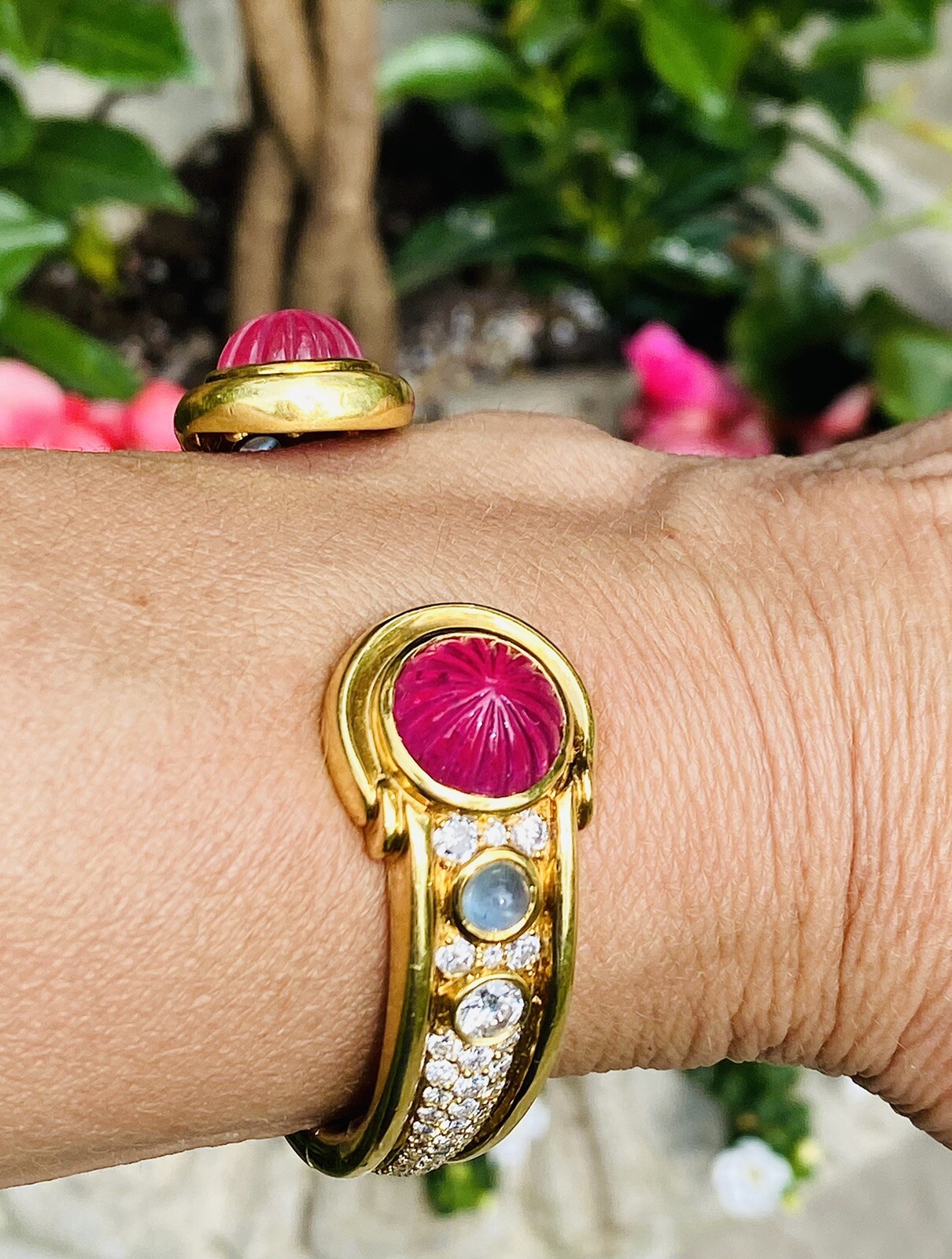 This stunning estate cuff bracelet is set in 18k yellow gold featuring two large gorgeous pink tourmaline carved cabochons at the top, followed by a dazzling array of moonstone gems and brilliant cut and pave cut white diamonds.  The total diamond weight is approximately 2.00 carats.