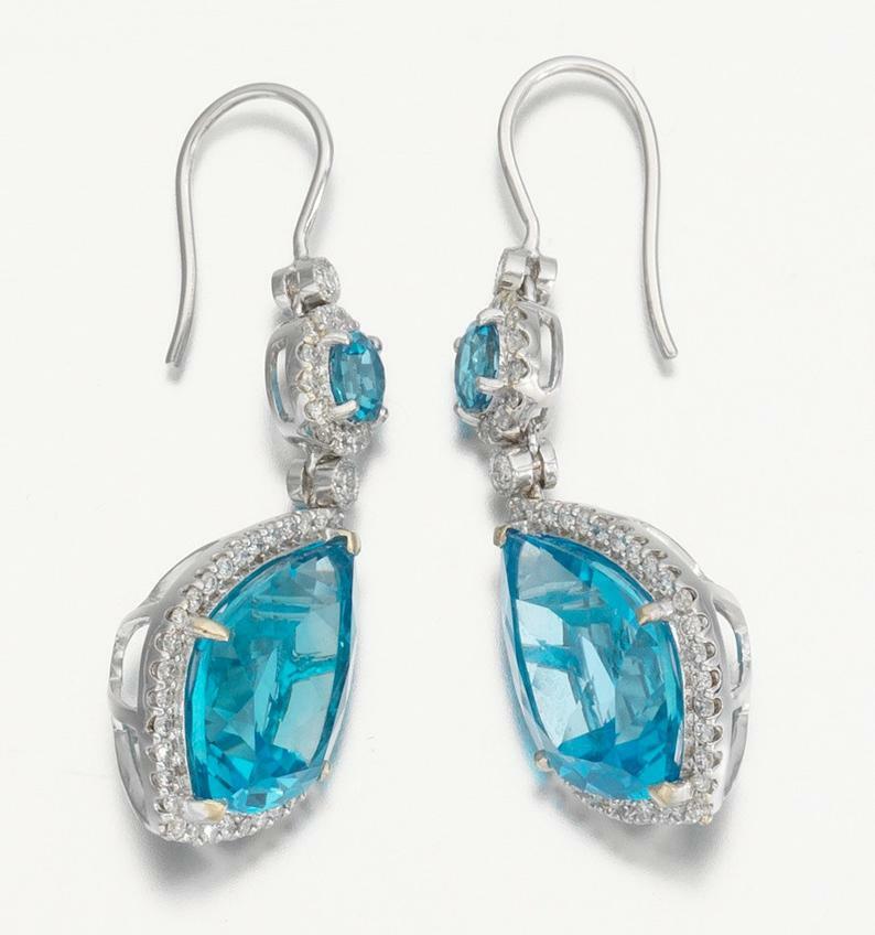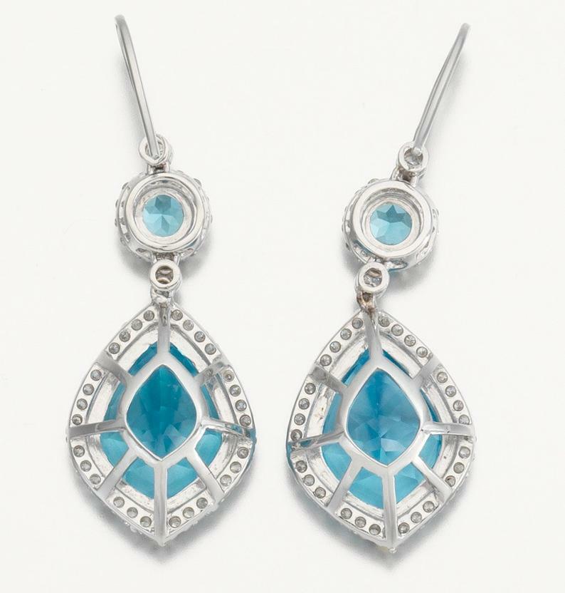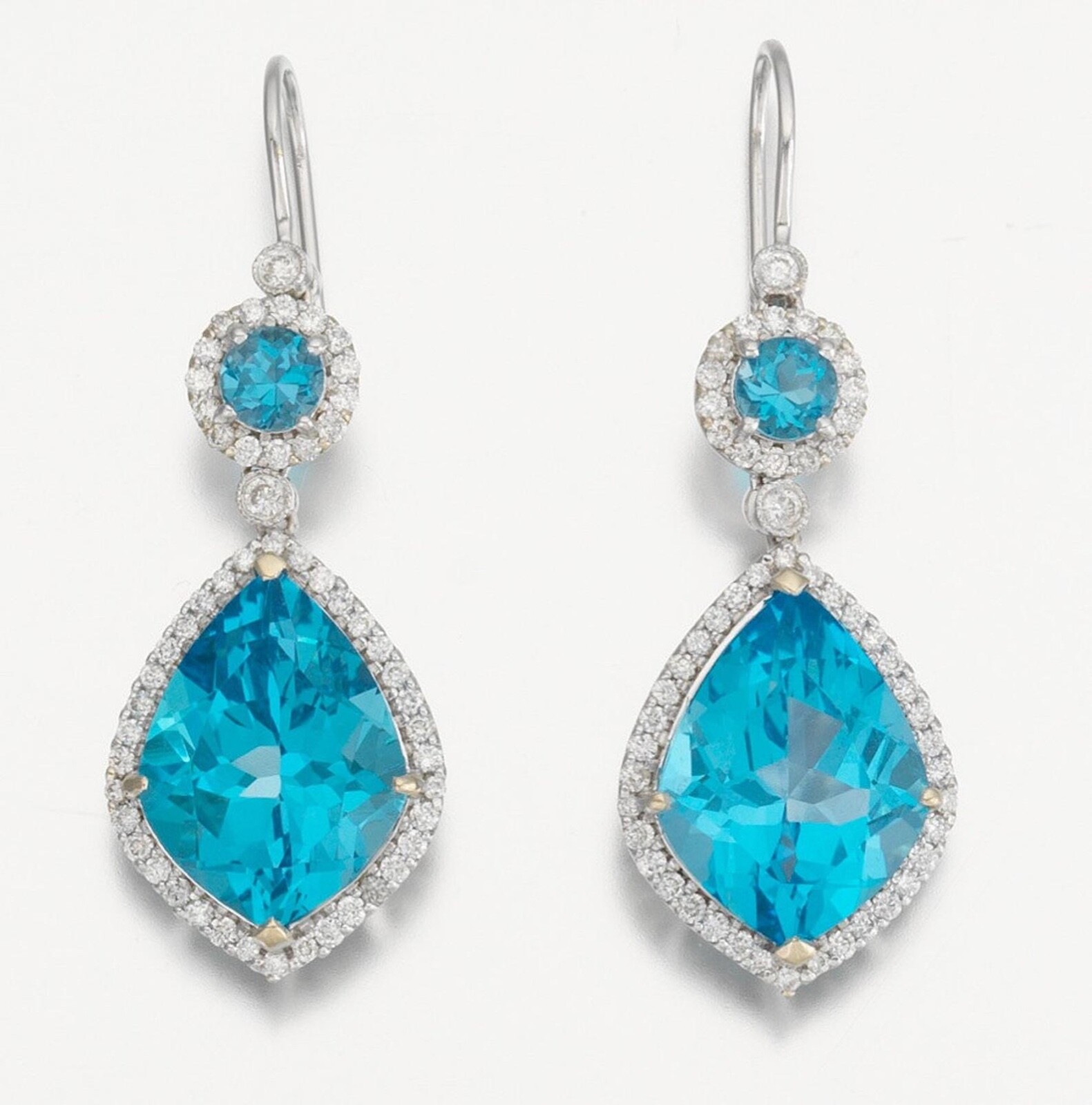 These gorgeous pendant earrings are set in 18k Gold with two oval round cut blue topaz and two pear cut blue topaz gemstones measuring 15mm x 11mm. The topaz gemstones are surrounded with diamond halos of E-F VS color and clarity, totaling approximately 1.00 carats.