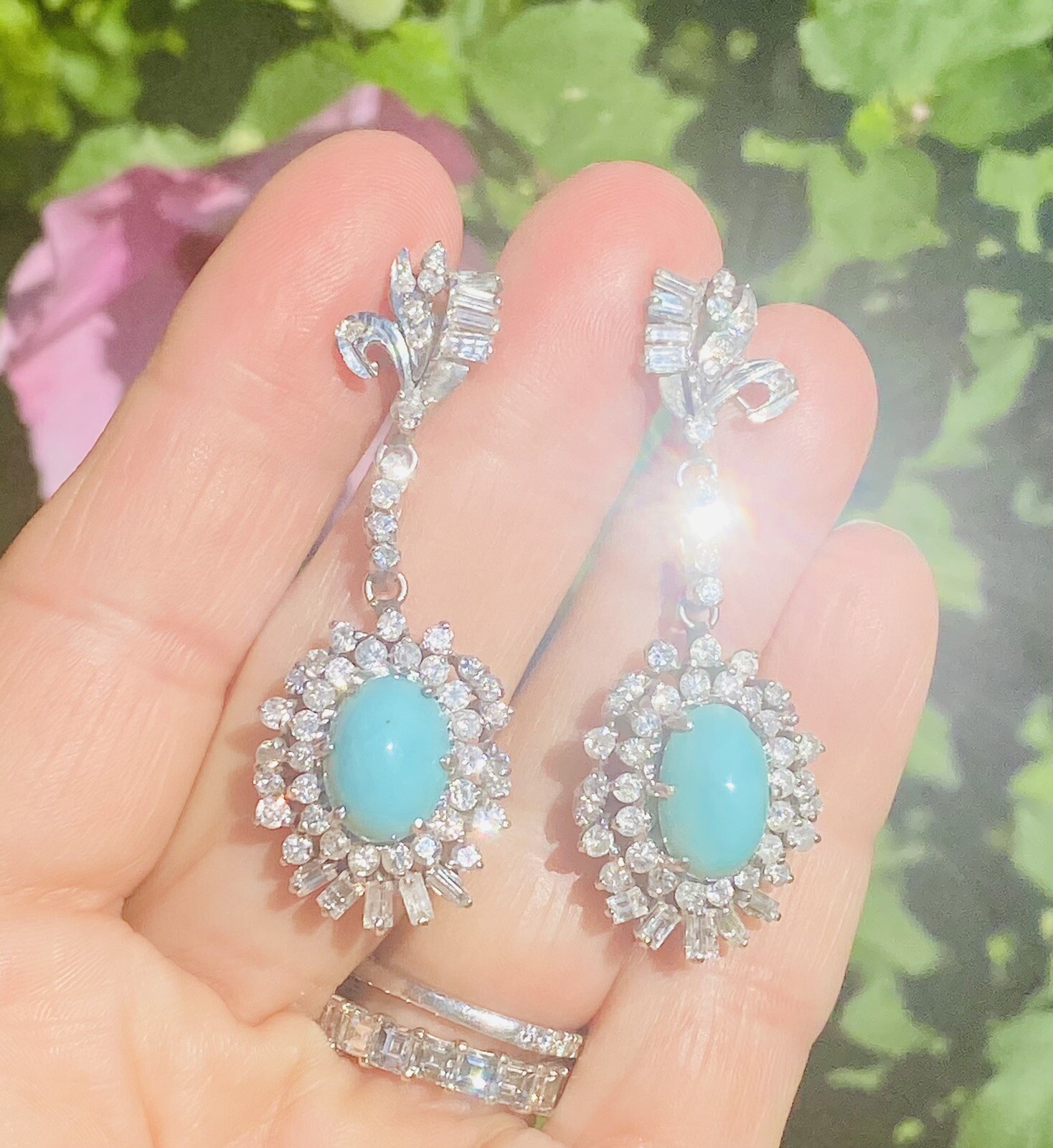 These impressive rare vintage statement earrings are set in 14K yellow gold. The pendant style earrings feature two beautiful turquoise gemstones 11.8 x 8.8 mm, surrounded with a stunning array of brilliant and baguette cut diamonds.