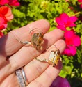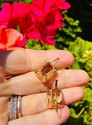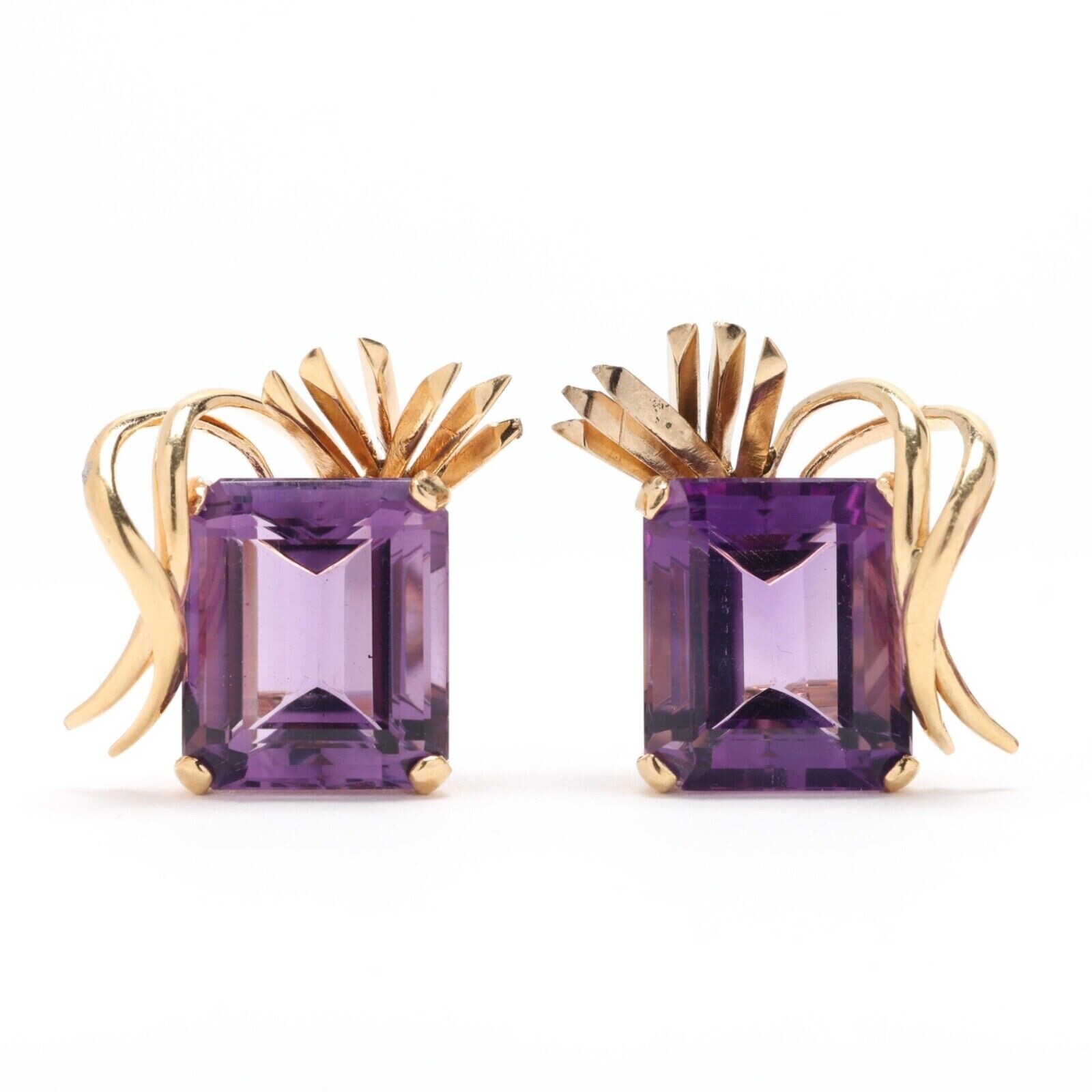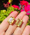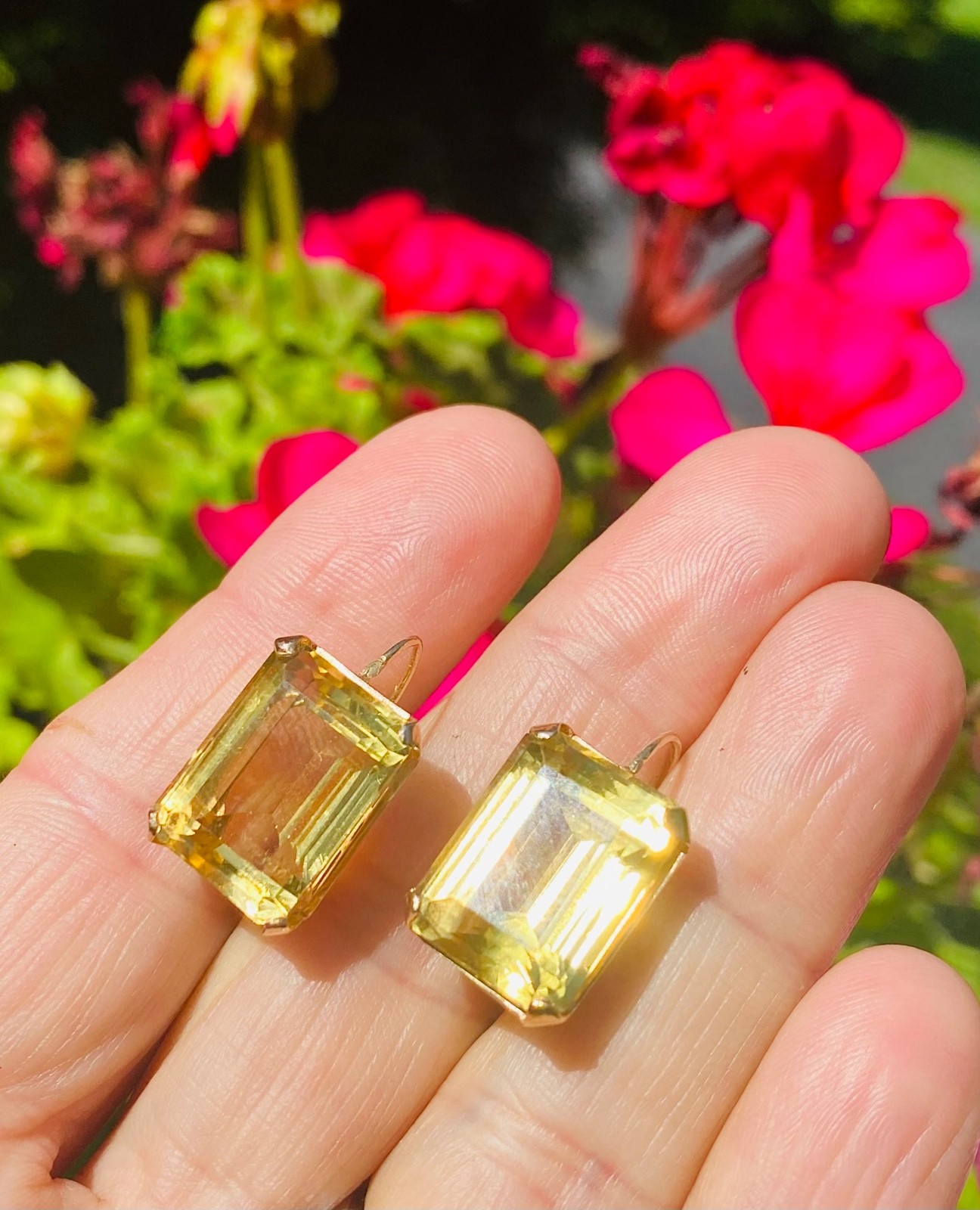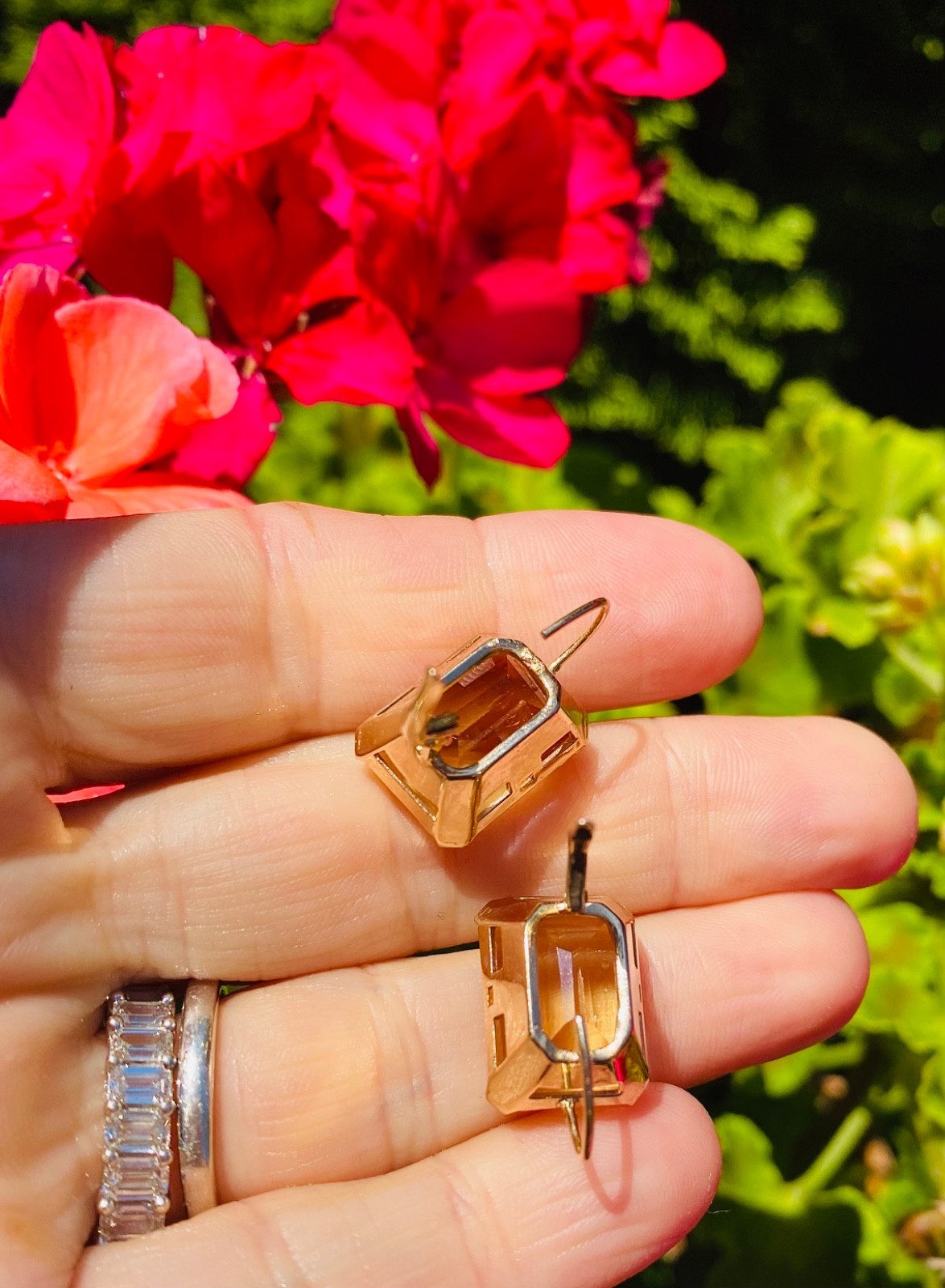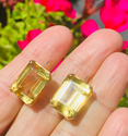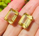 These gorgeous retro earrings are set in 14k Gold with two emerald cut Citrine gemstones.  They are prong set, backed in gold with levered wire clips - for a comfortable fit.  The citrines display a lovely yellow moderately strong saturation.  The gemstones measure approxinmately 16mm x 12mm.