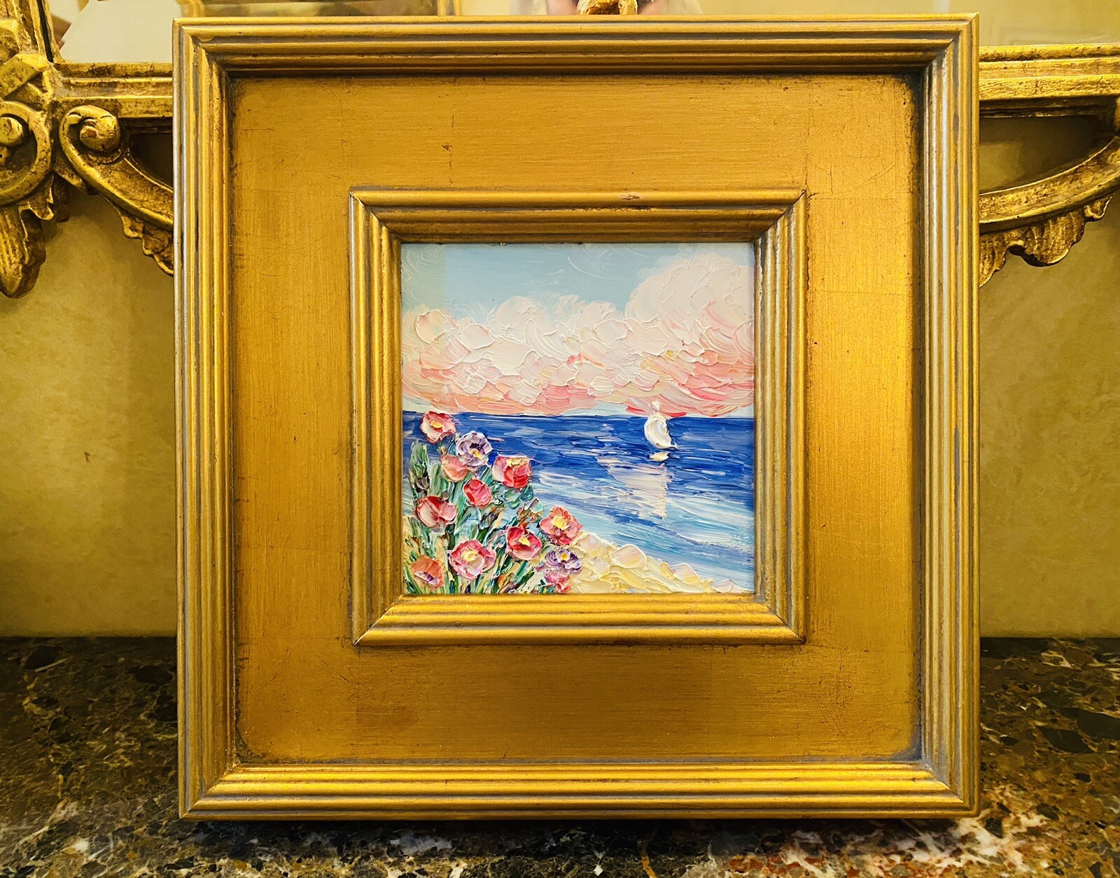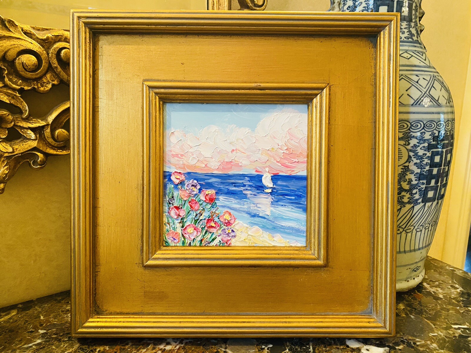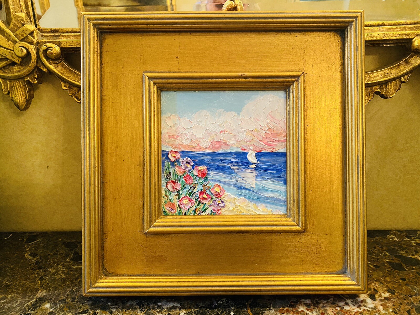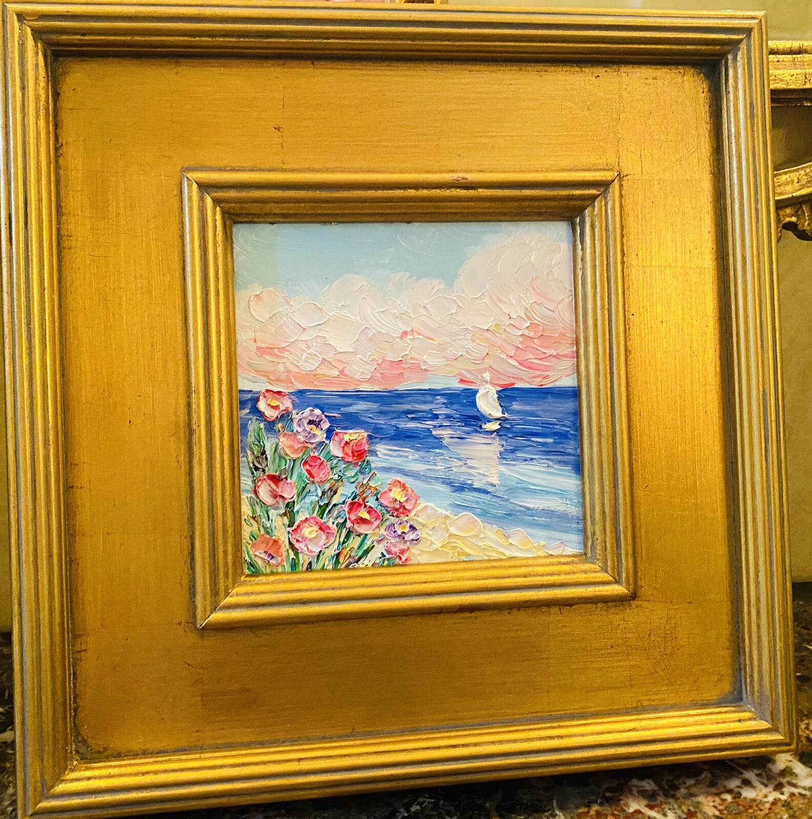 “Abstract Landscape Impasto", Original Oil Painting by artist Sarah Kadlic. Abstract rendering of colorful textured fields of flowers with sea and sailboat in the distance. Lots of movement this shimmering oil. Thick, colorful texture design is her signature style. Painted brush and palette knife. Completed with finest materials on one Canvas panel, sized 6” high by 6” wide. Framed in a stunning Gilt gold wood frame taking the size of the piece to 14”x14”. An original painting, signed by artist, not print or reproduction of any kind.