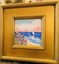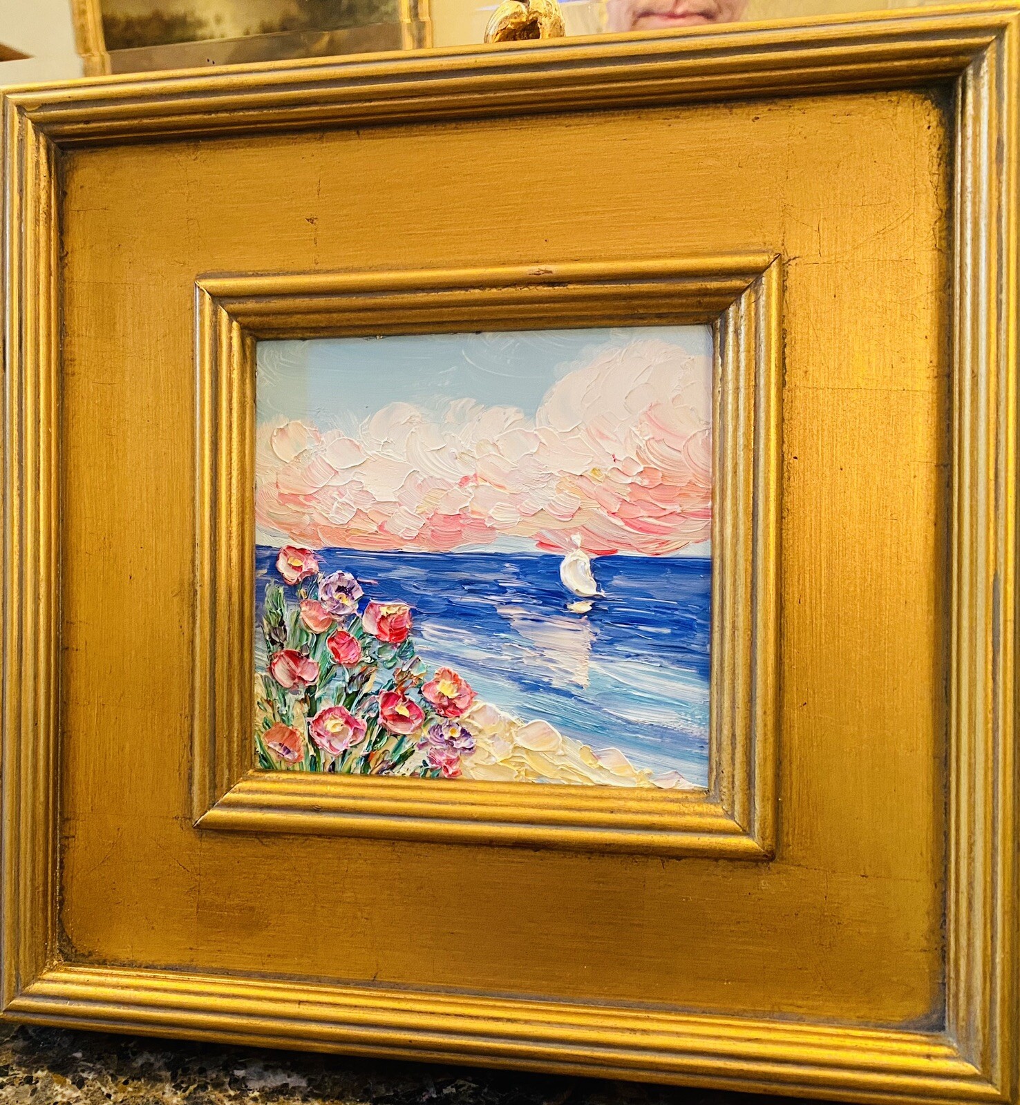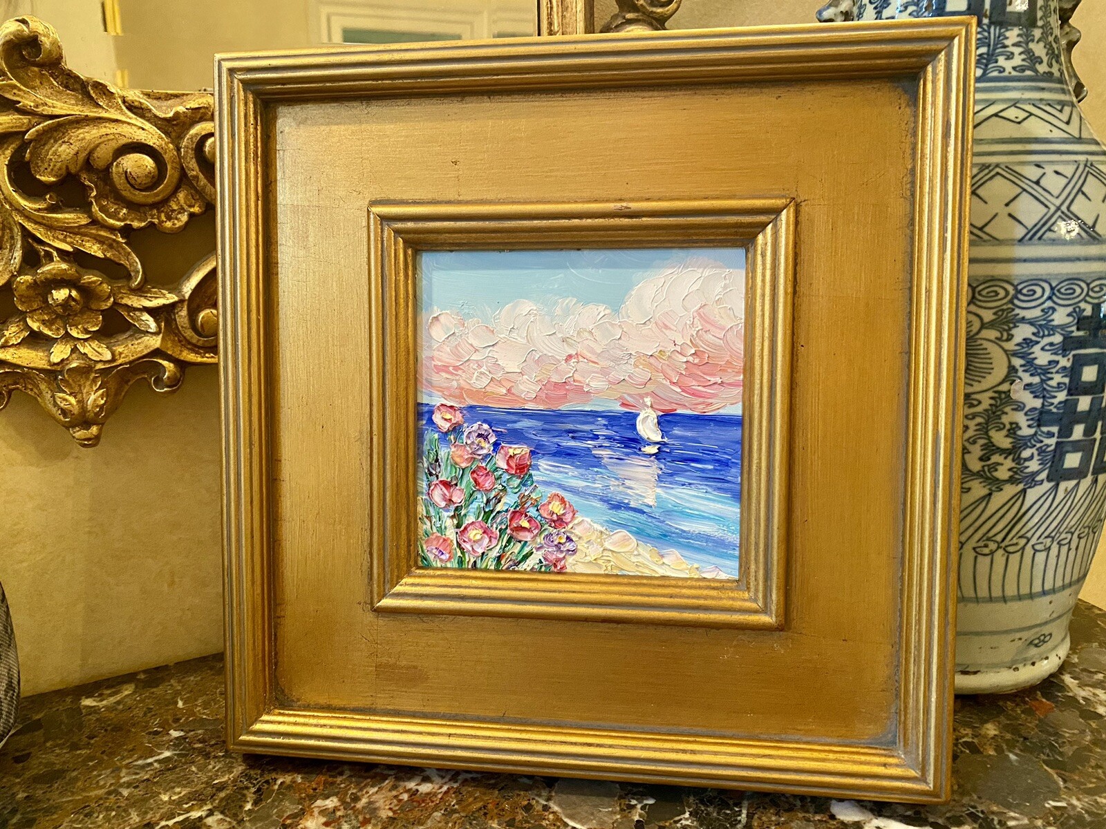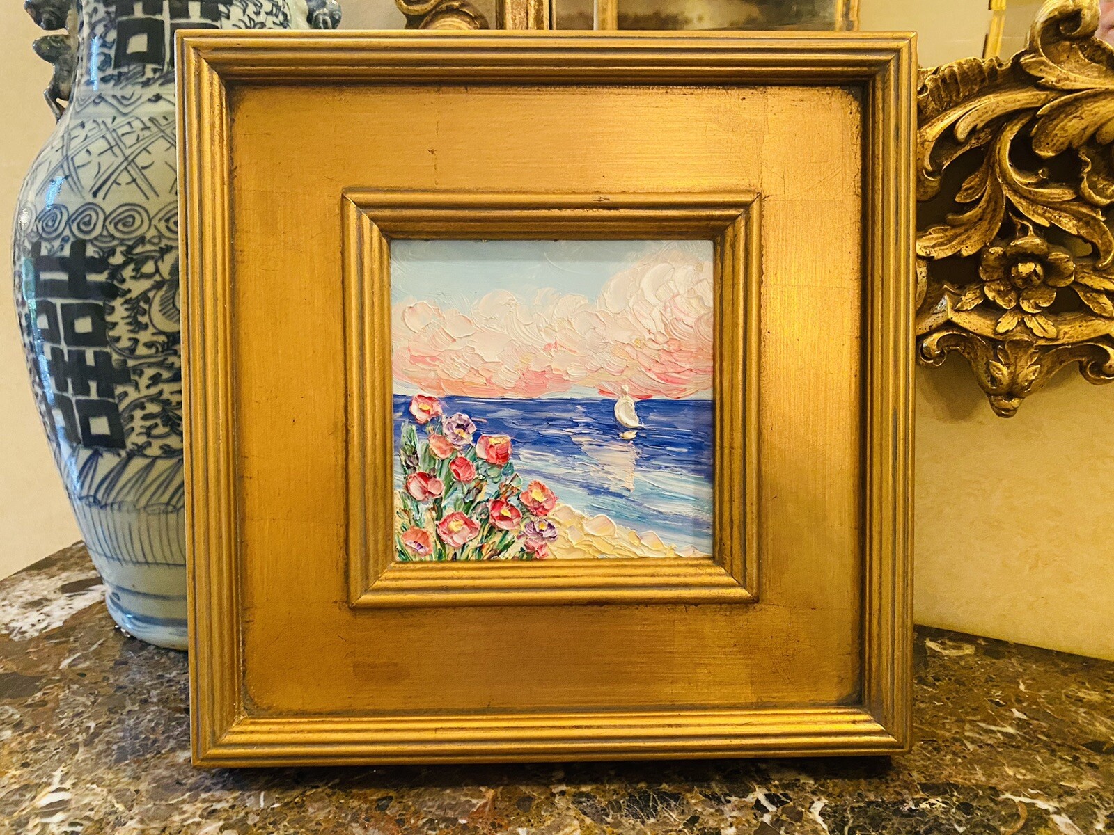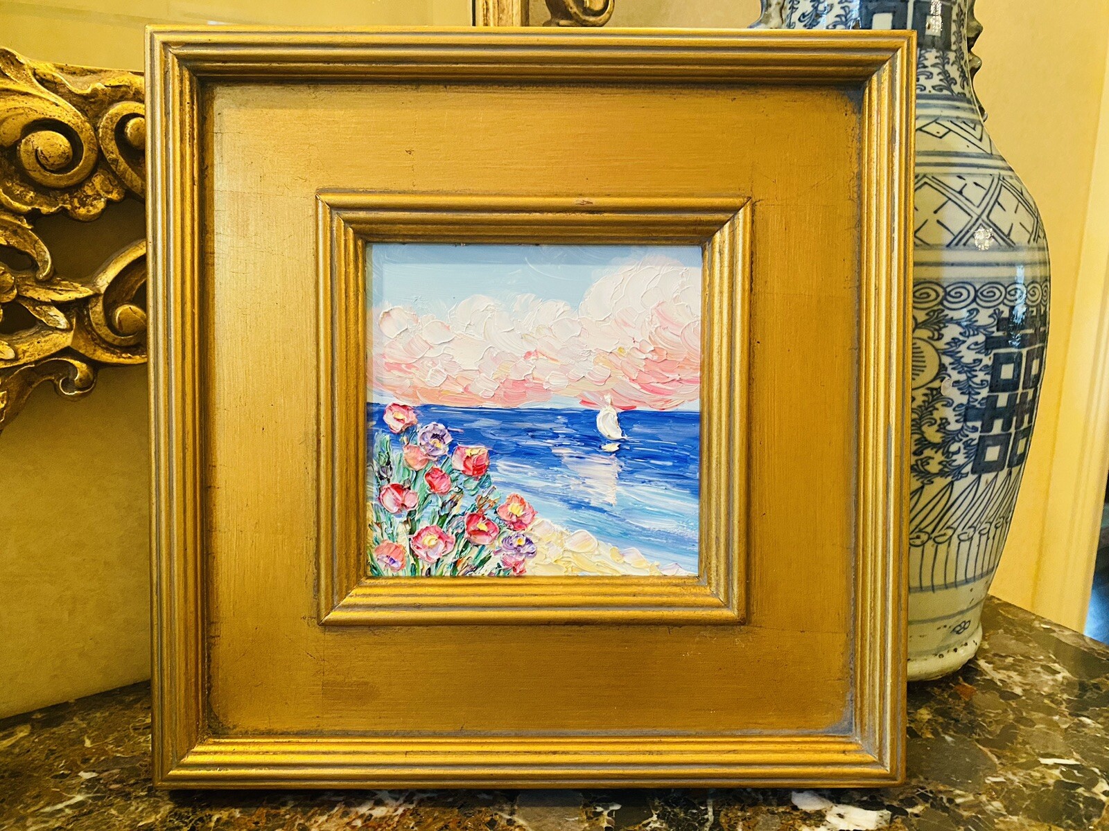 “Abstract Landscape Impasto", Original Oil Painting by artist Sarah Kadlic. Abstract rendering of colorful textured fields of flowers with sea and sailboat in the distance. Lots of movement this shimmering oil. Thick, colorful texture design is her signature style. Painted brush and palette knife. Completed with finest materials on one Canvas panel, sized 6” high by 6” wide. Framed in a stunning Gilt gold wood frame taking the size of the piece to 14”x14”. An original painting, signed by artist, not print or reproduction of any kind.