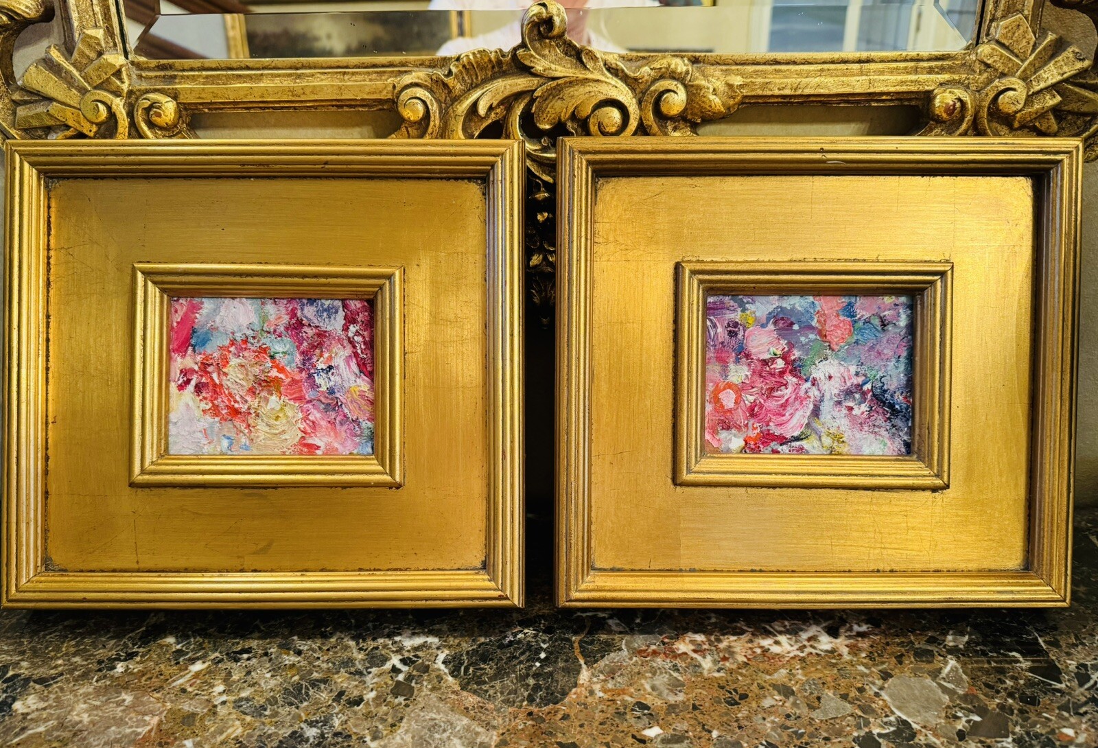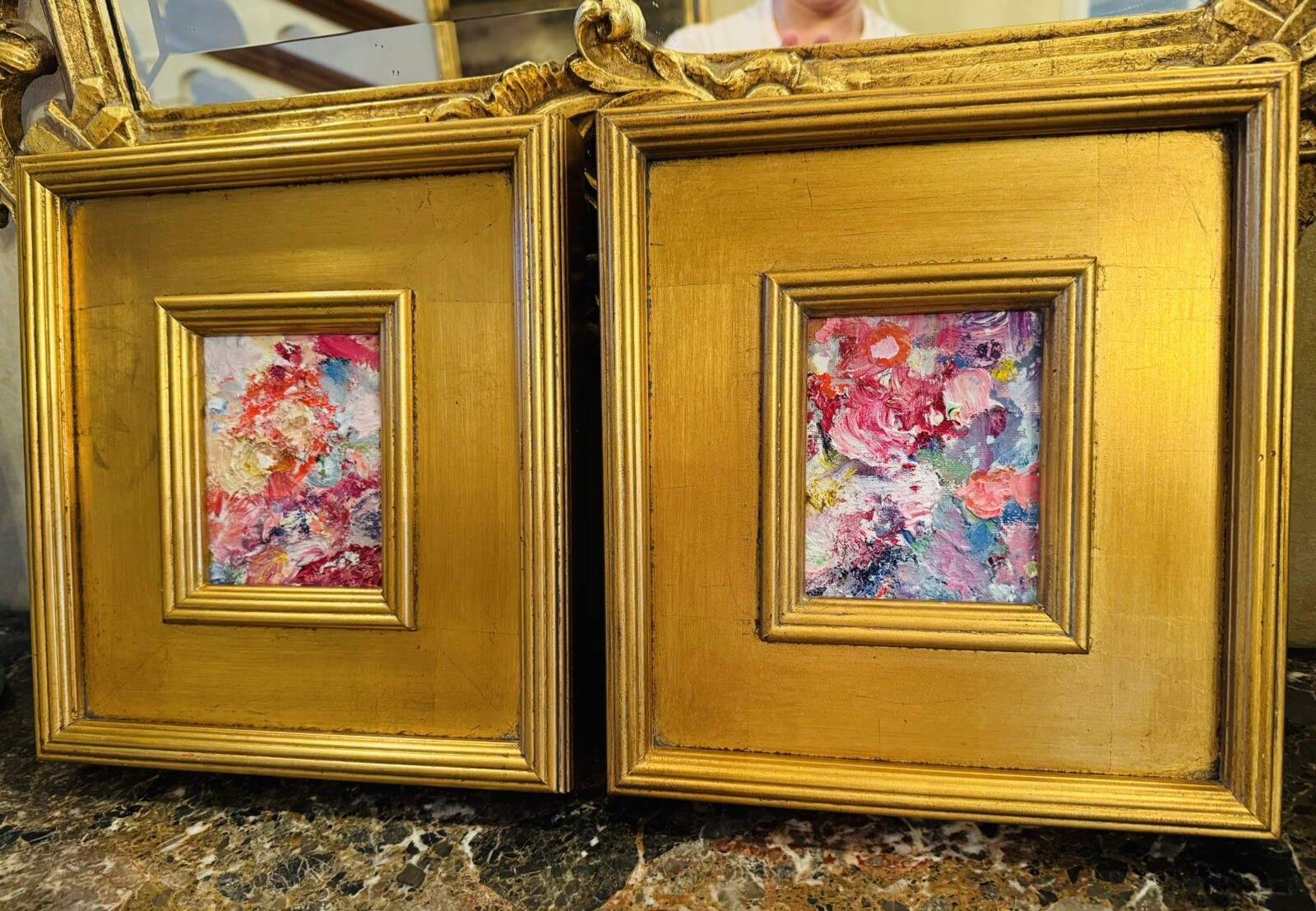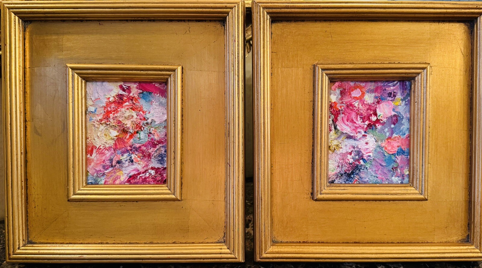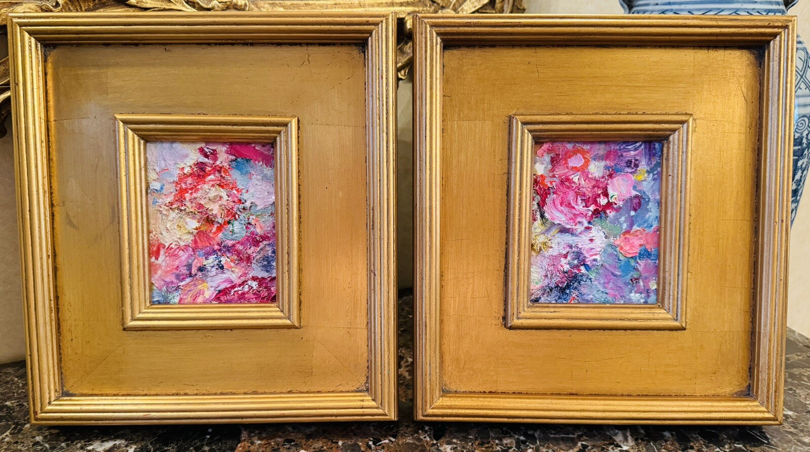 “Abstract Pair of Landscape Impastos", Original Oil Painting by artist Sarah Kadlic. Abstract rendering of colorful impasto countryside landscapes. Lots of movement this shimmering oil. Thick, colorful texture design is her signature style. Painted brush and palette knife. Each piece is completed with finest materials on one Canvas panel, sized 4” high by 5”wide. Framed in a stunning Gilt gold wood frame taking the size of each piece to approximately 10” x 11”. An original painting, signed by artist, not print or reproduction of any kind.