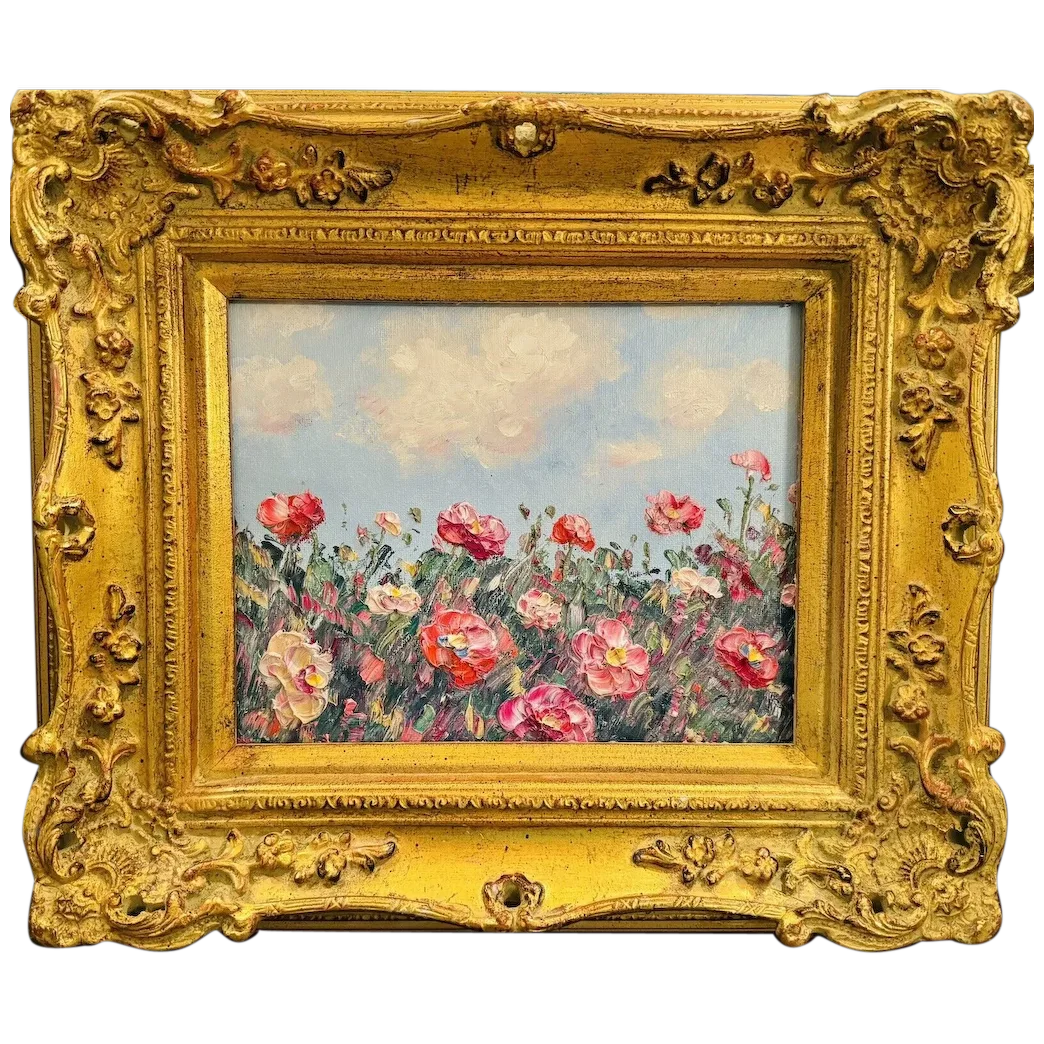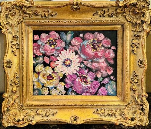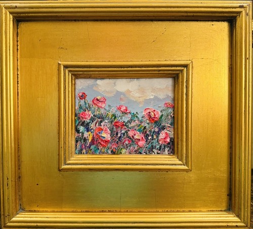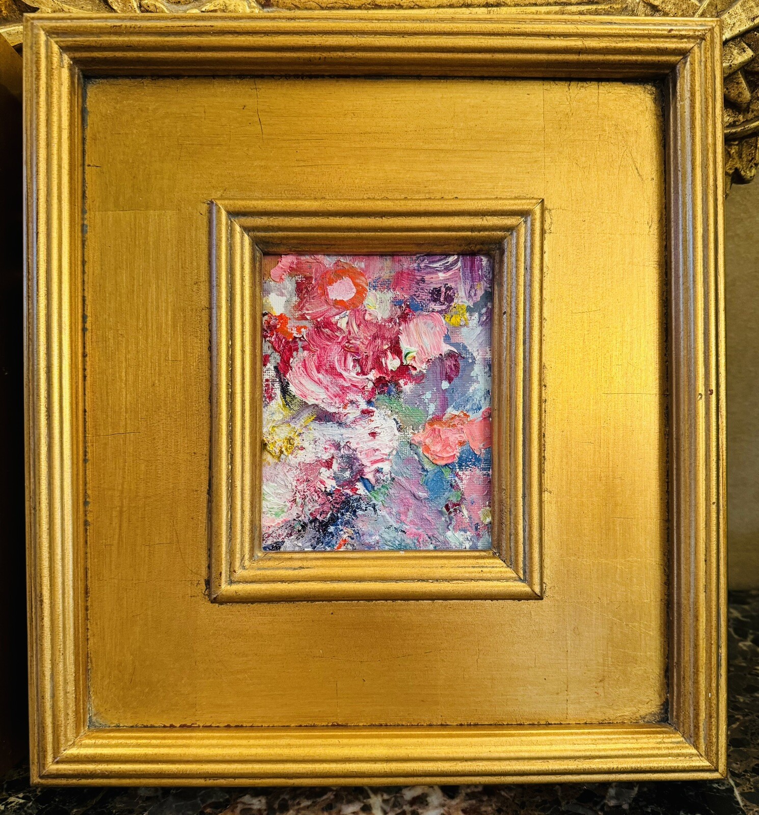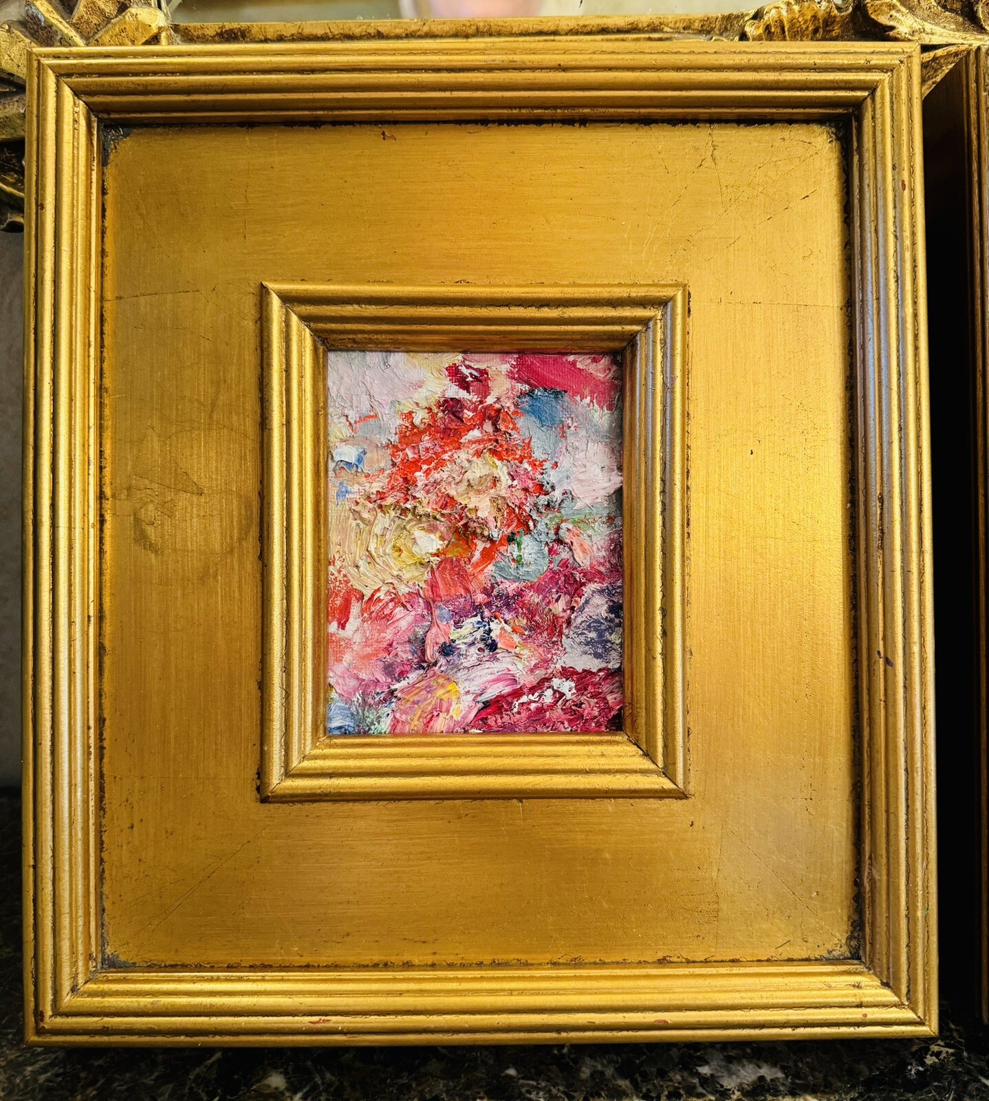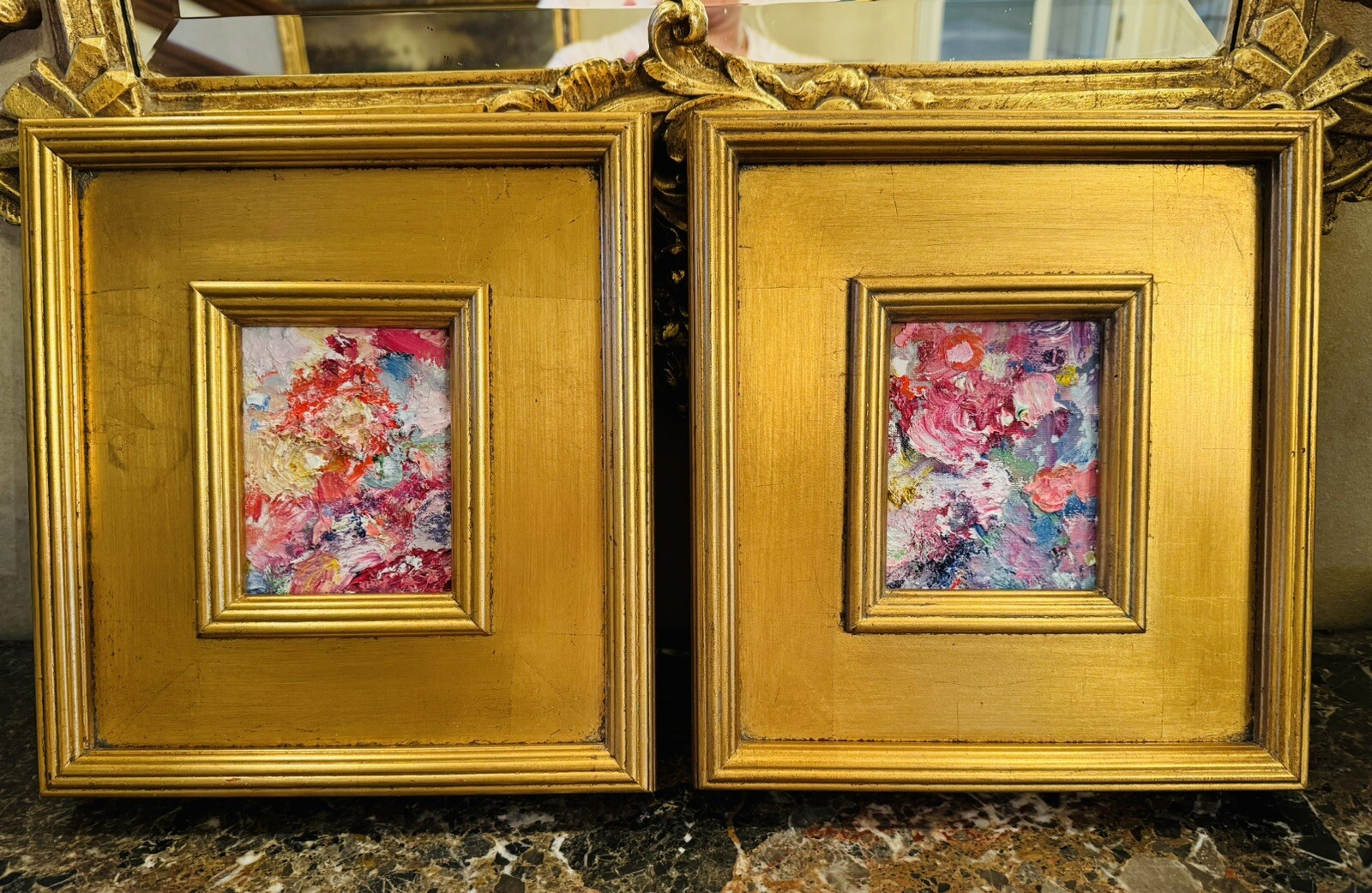 “Abstract Pair of Landscape Impastos", Original Oil Painting by artist Sarah Kadlic. Abstract rendering of colorful impasto countryside landscapes. Lots of movement this shimmering oil. Thick, colorful texture design is her signature style. Painted brush and palette knife. Each piece is completed with finest materials on one Canvas panel, sized 4” high by 5”wide. Framed in a stunning Gilt gold wood frame taking the size of each piece to approximately 10” x 11”. An original painting, signed by artist, not print or reproduction of any kind.