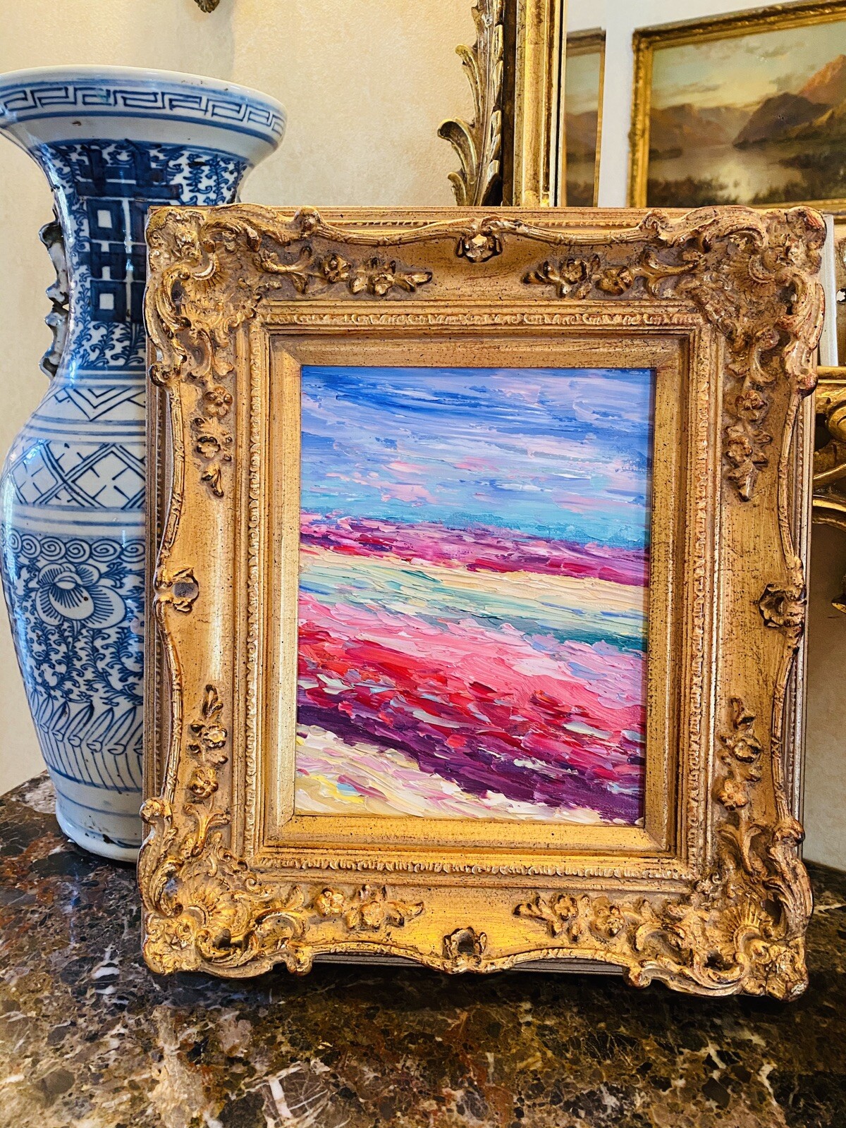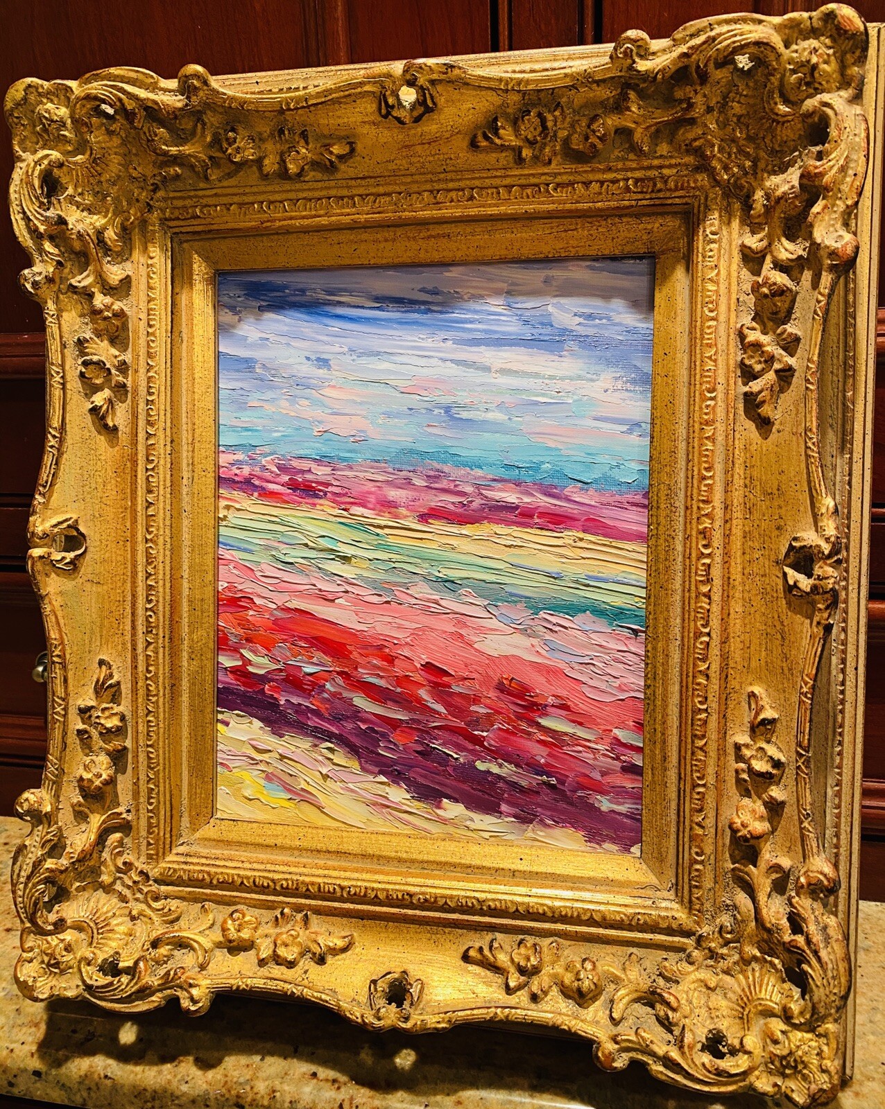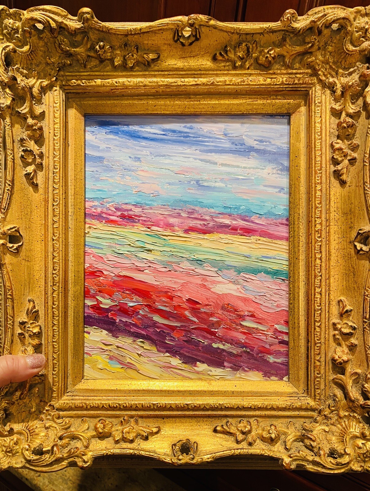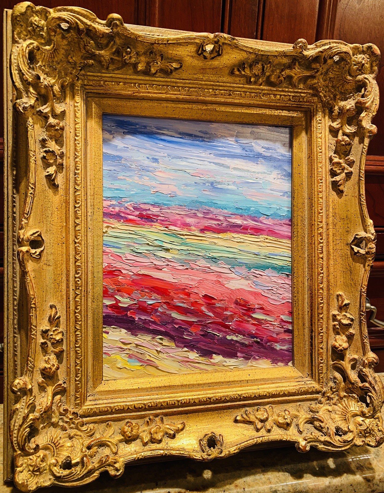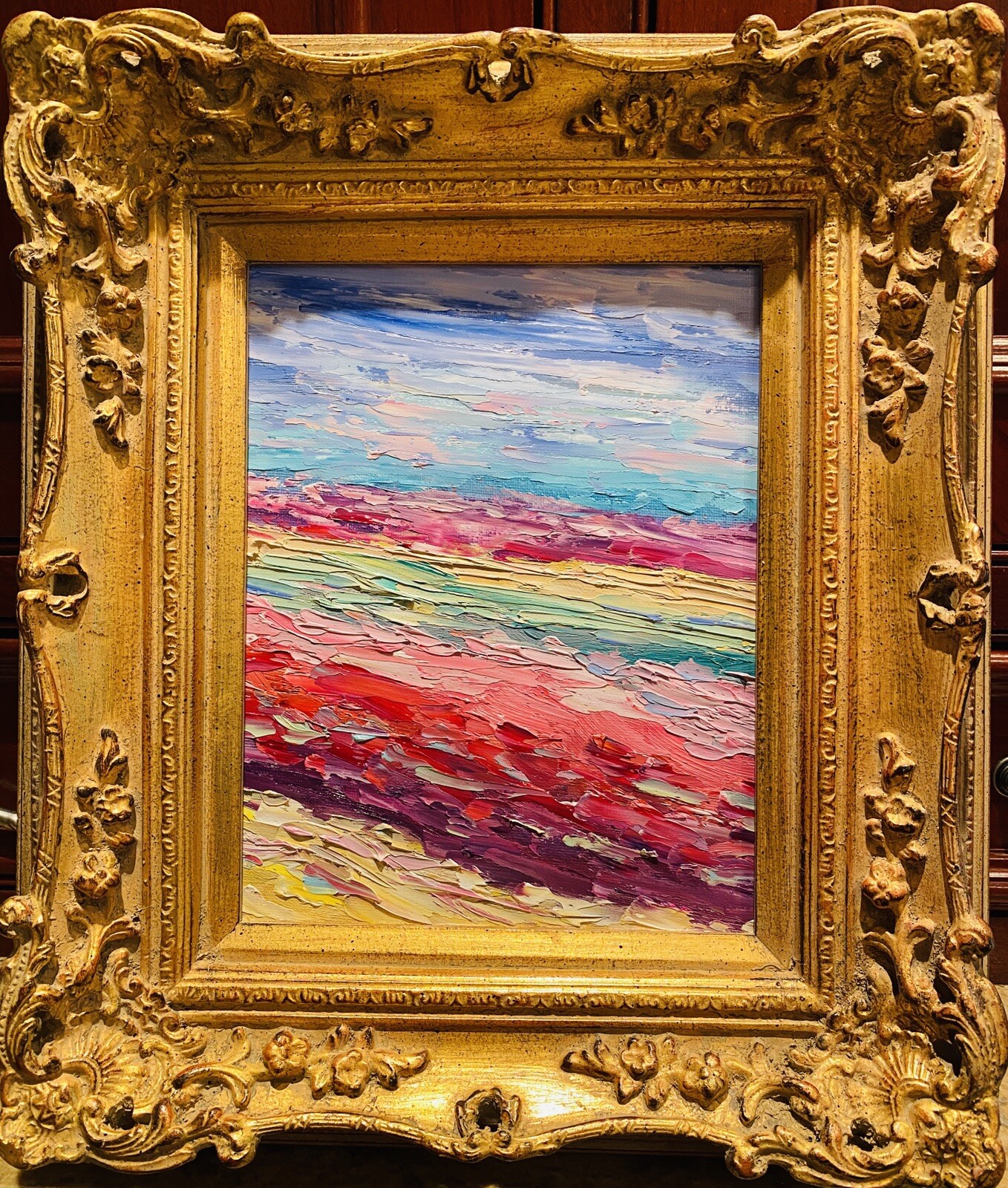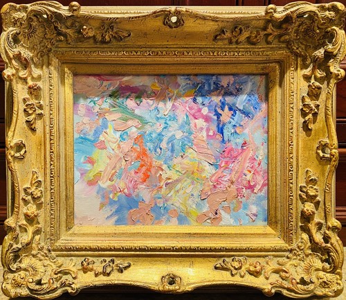 Abstract Expressionist Impasto Palette", Original Oil Painting by artist Sarah Kadlic. Abstract impasto chunks from the painter's palette with lots of movement this shimmering oil. Thick, colorful texture design is her signature style. Painted brush and palette knife. Completed with finest materials on one Canvas panel, sized 8" high by 10" wide. Framed in a stunning European Carved French Frame with Gilt highlights that takes the piece to 13"x15". An original painting, signed by artist, not print or reproduction of any kind.