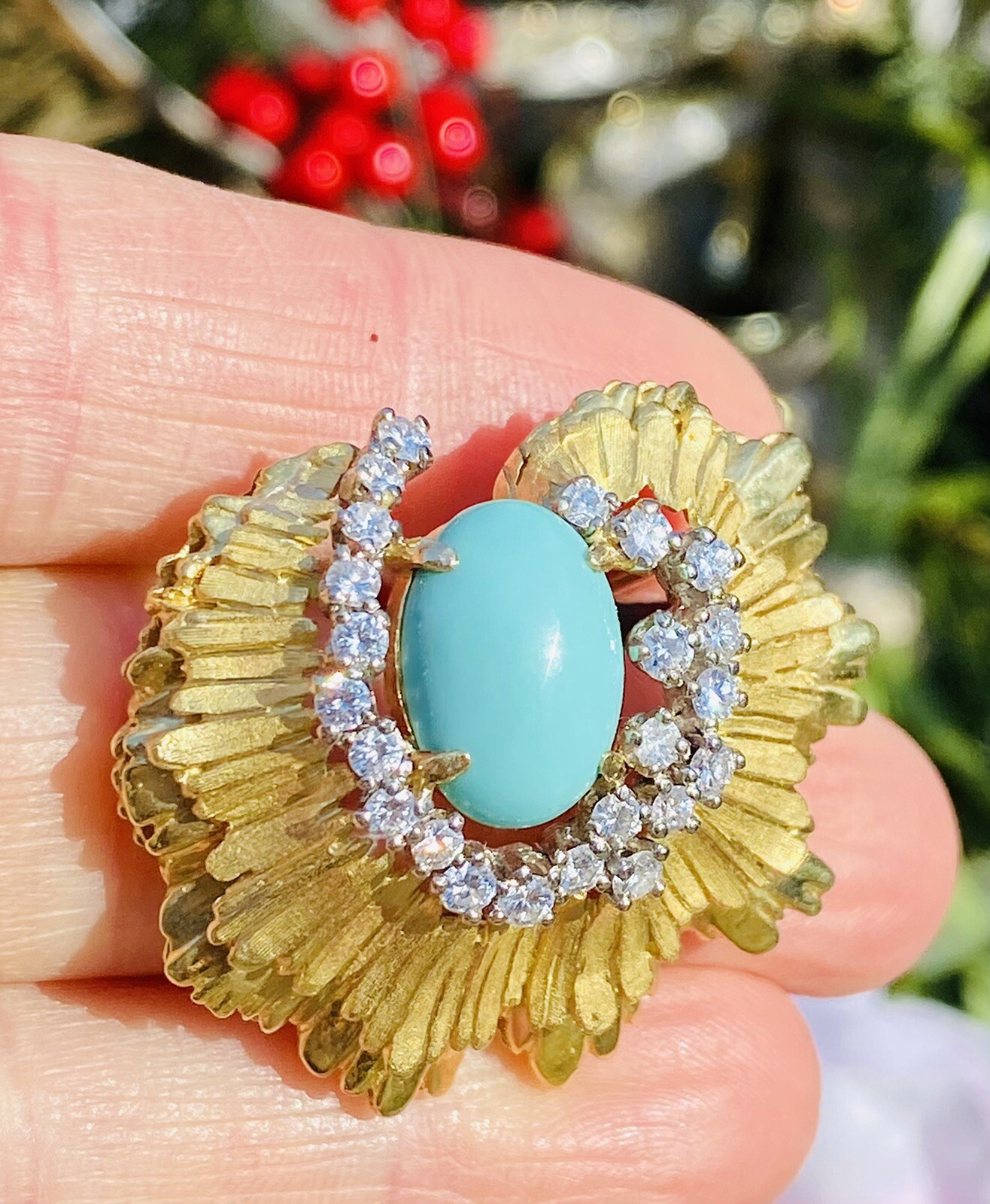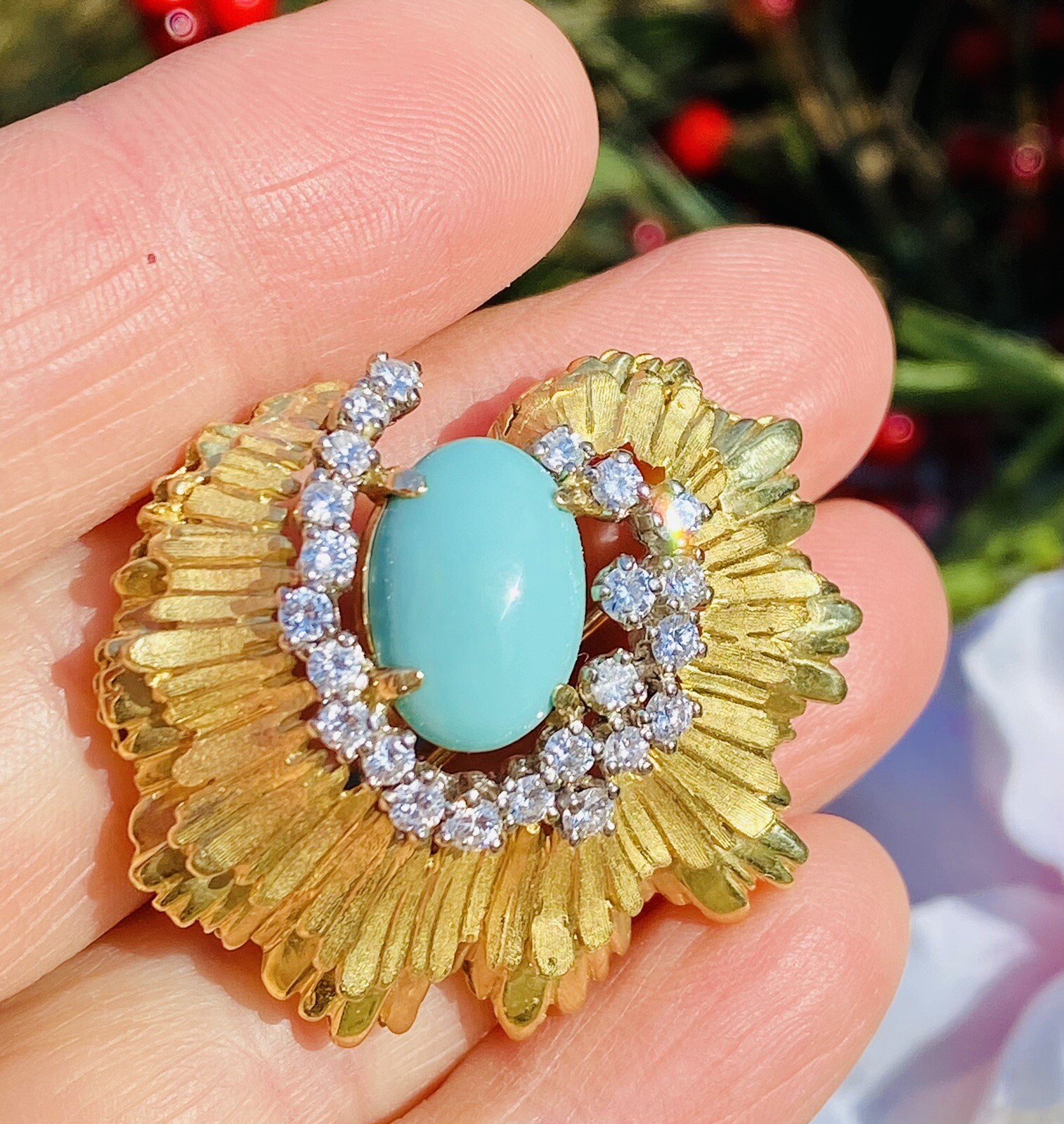 This beautiful pendant piece is set in rich polished and brushed 14k yellow gold with a stunning sunburst design centering a swirl of fine diamonds around a central oval turquoise gemstone. The turquoise measures approximately 14mm x 10mm and the total diamond weight is approximately 1.25 carats. The piece features several pendant loupes on the back for your favorite chain or omega as well as a pin attachment.