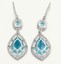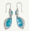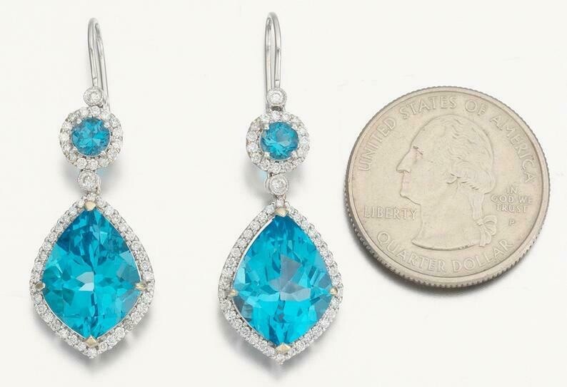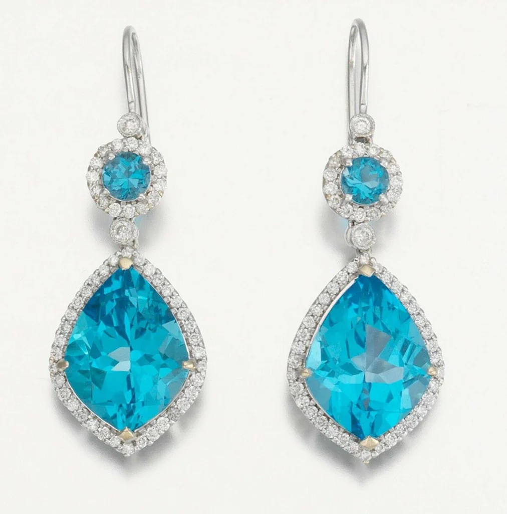 These gorgeous pendant earrings are set in 18k Gold with two oval round cut blue topaz and two pear cut blue topaz gemstones measuring 15mm x 11mm.  The topaz gemstones are surrounded with diamond halos of  E-F VS color and clarity, totaling approximately 1.00 carats.