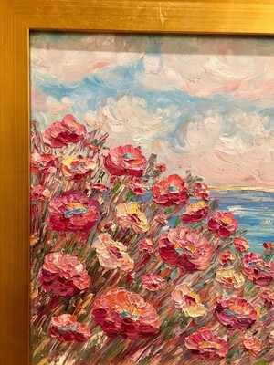 "Mediterranean Wildflowers Seascape", Original Oil Painting by artist Sarah Kadlic. Pink, yellow and mauve flowers frame this sailboat seascape, with lots of movement this shimmering oil. Thick, colorful texture design is her signature style. Painted brush and palette knife. Completed with finest materials on one Gallery Wrapped Canvas with painted sides, sized 18" high by 24" wide and framed in a wonderful gilt wood frame that adds about 4" to all sides. An original painting, signed by artist, not print or reproduction of any kind.