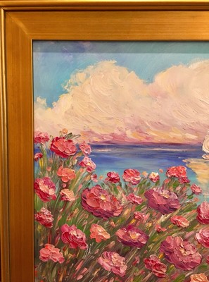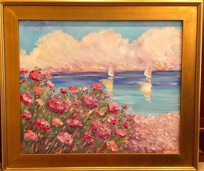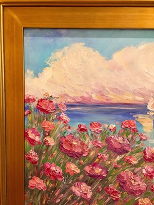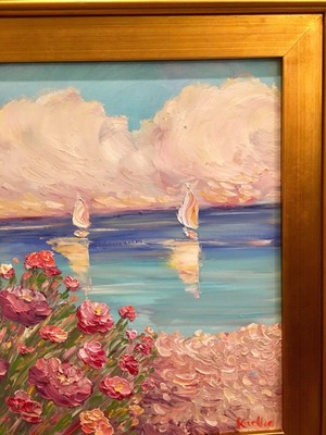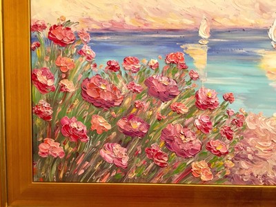 "Wildflowers Seascape", Original Oil Painting by artist Sarah Kadlic. Pink, yellow and mauve flowers frame this sailboat seascape, with lots of movement this shimmering oil. Thick, colorful texture design is her signature style. Painted brush and palette knife. Completed with finest materials on one Gallery Wrapped Canvas with painted sides, sized 20" high by 24" wide and framed in a wonderful gilt wood frame that adds about 4" to all sides. An original painting, signed by artist, not print or reproduction of any kind.