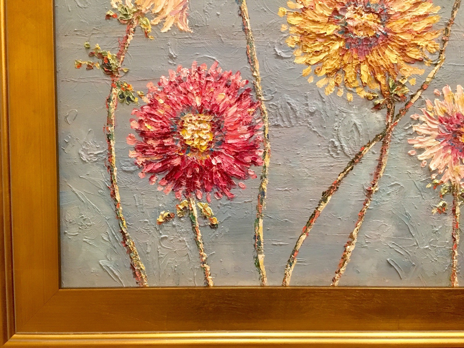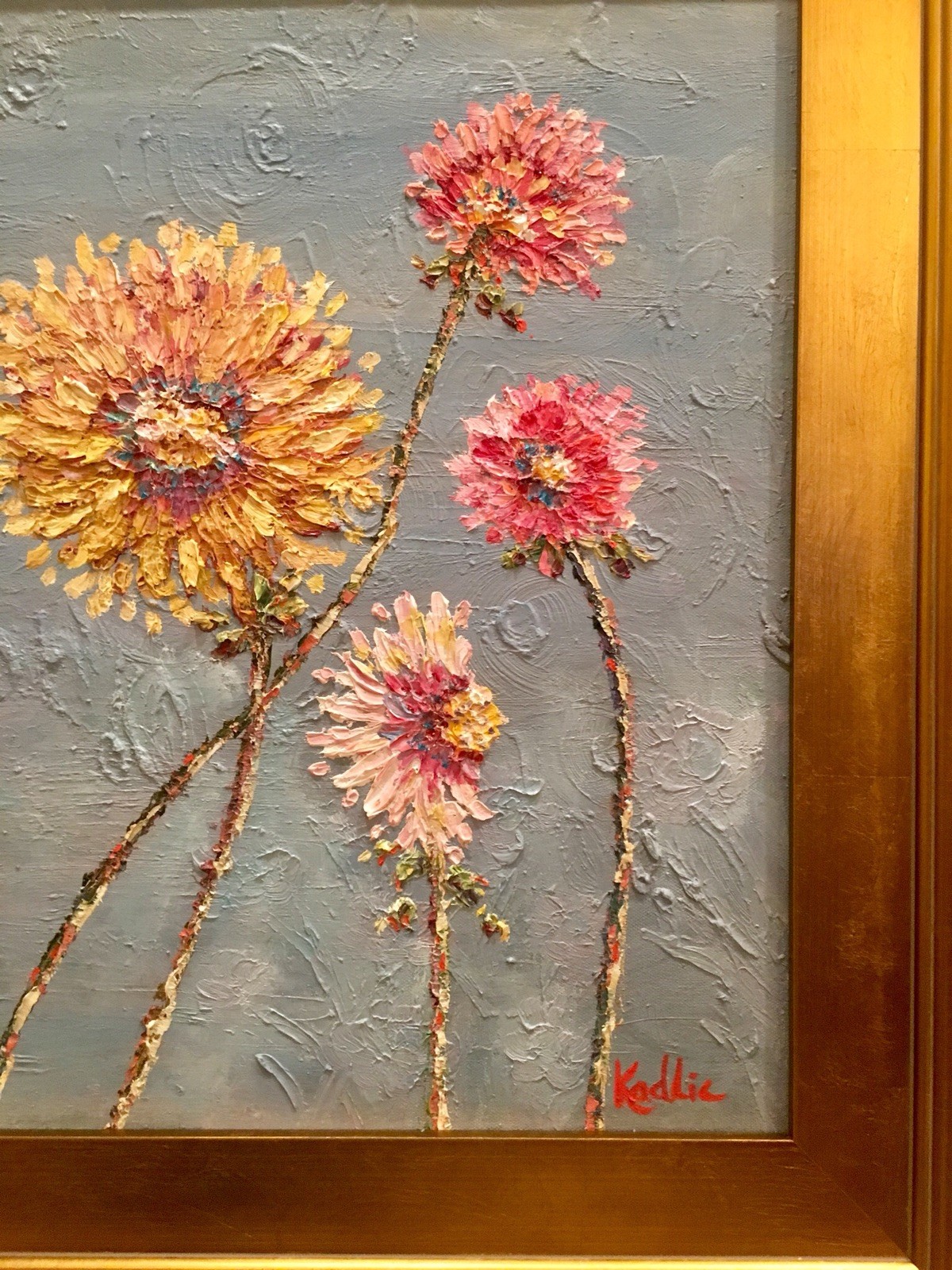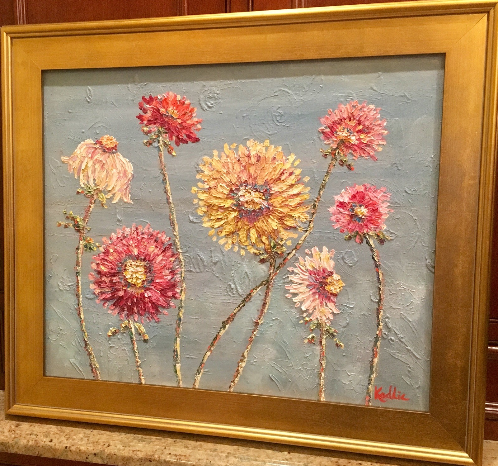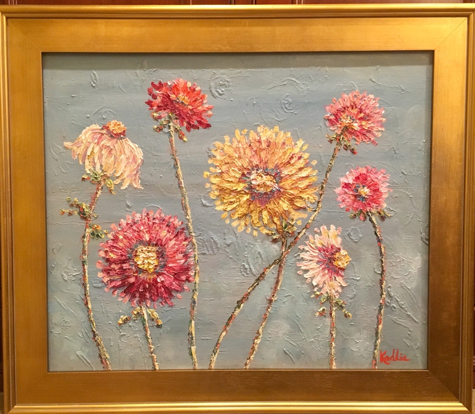 "Summer Wildflowers", Original Oil Painting by artist Sarah Kadlic. Chubby impasto flowers in shades of pink, yellow, white and mauve with lots of movement this shimmering oil. Thick, colorful texture design is her signature style. Painted brush and palette knife. Completed with finest materials on one Gallery Wrapped Canvas with painted sides, sized 20" high by 24" wide and framed in a wonderful gilt wood frame that adds about 4" to all sides. An original painting, signed by artist, not print or reproduction of any kind.