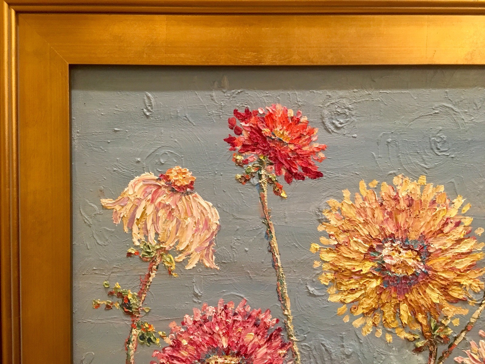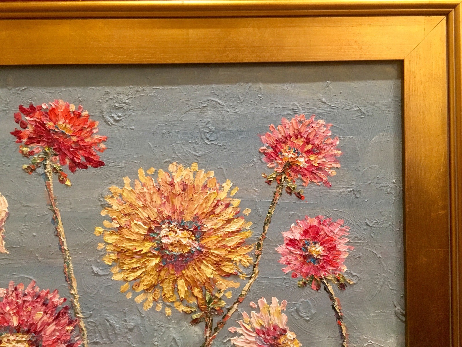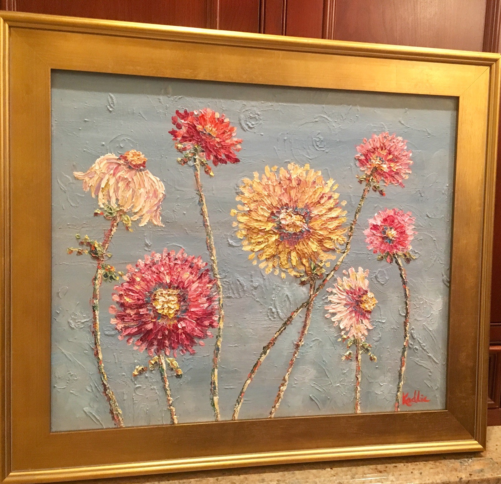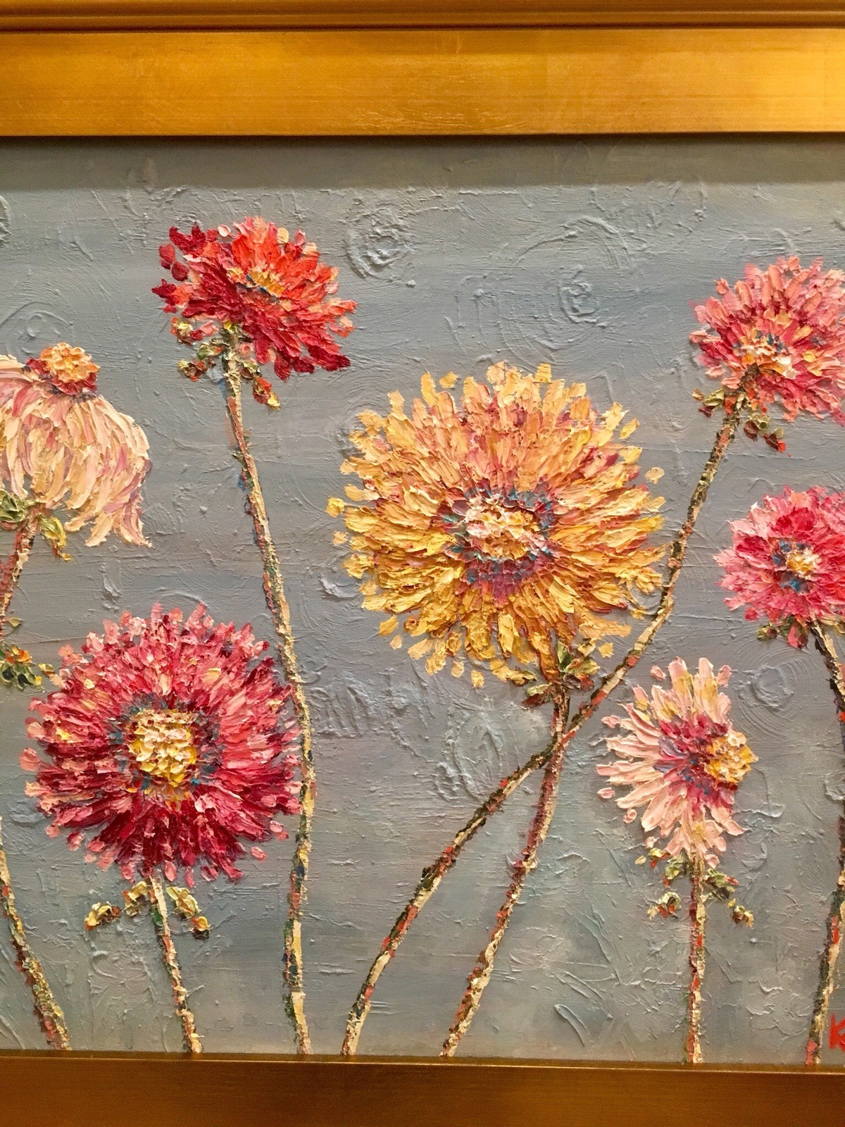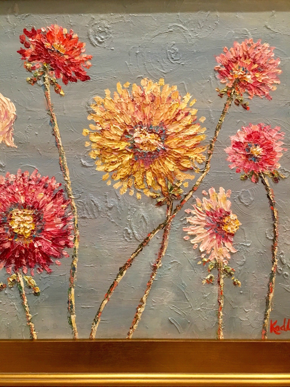 "Summer Wildflowers", Original Oil Painting by artist Sarah Kadlic. Chubby impasto flowers in shades of pink, yellow, white and mauve with lots of movement this shimmering oil. Thick, colorful texture design is her signature style. Painted brush and palette knife. Completed with finest materials on one Gallery Wrapped Canvas with painted sides, sized 20" high by 24" wide and framed in a wonderful gilt wood frame that adds about 4" to all sides. An original painting, signed by artist, not print or reproduction of any kind.