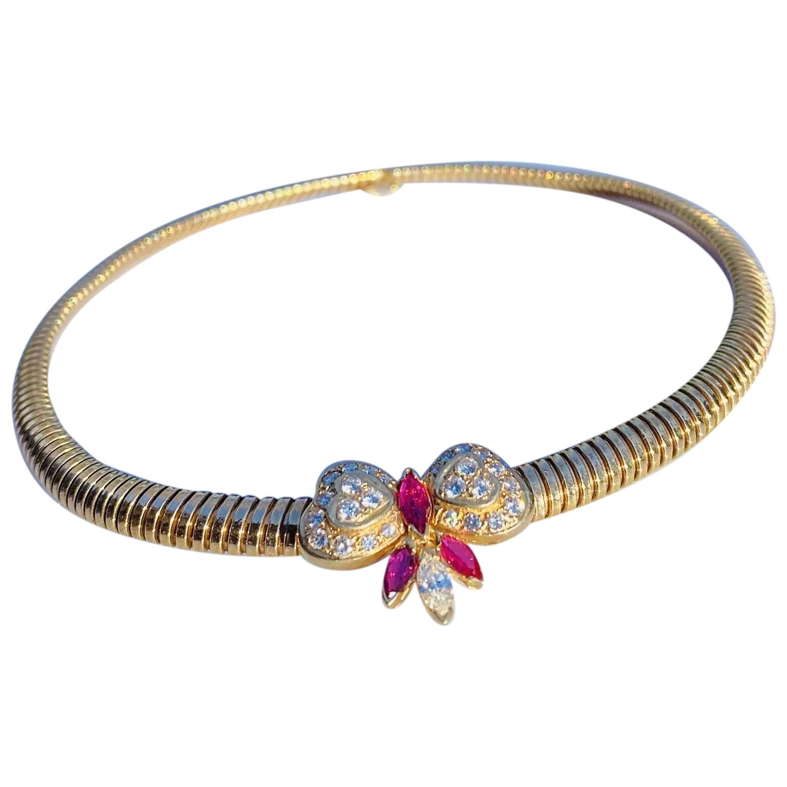 Vintage Estate 14k Gold Tubogas Choker Necklace G VS Ruby Diamond Pendant