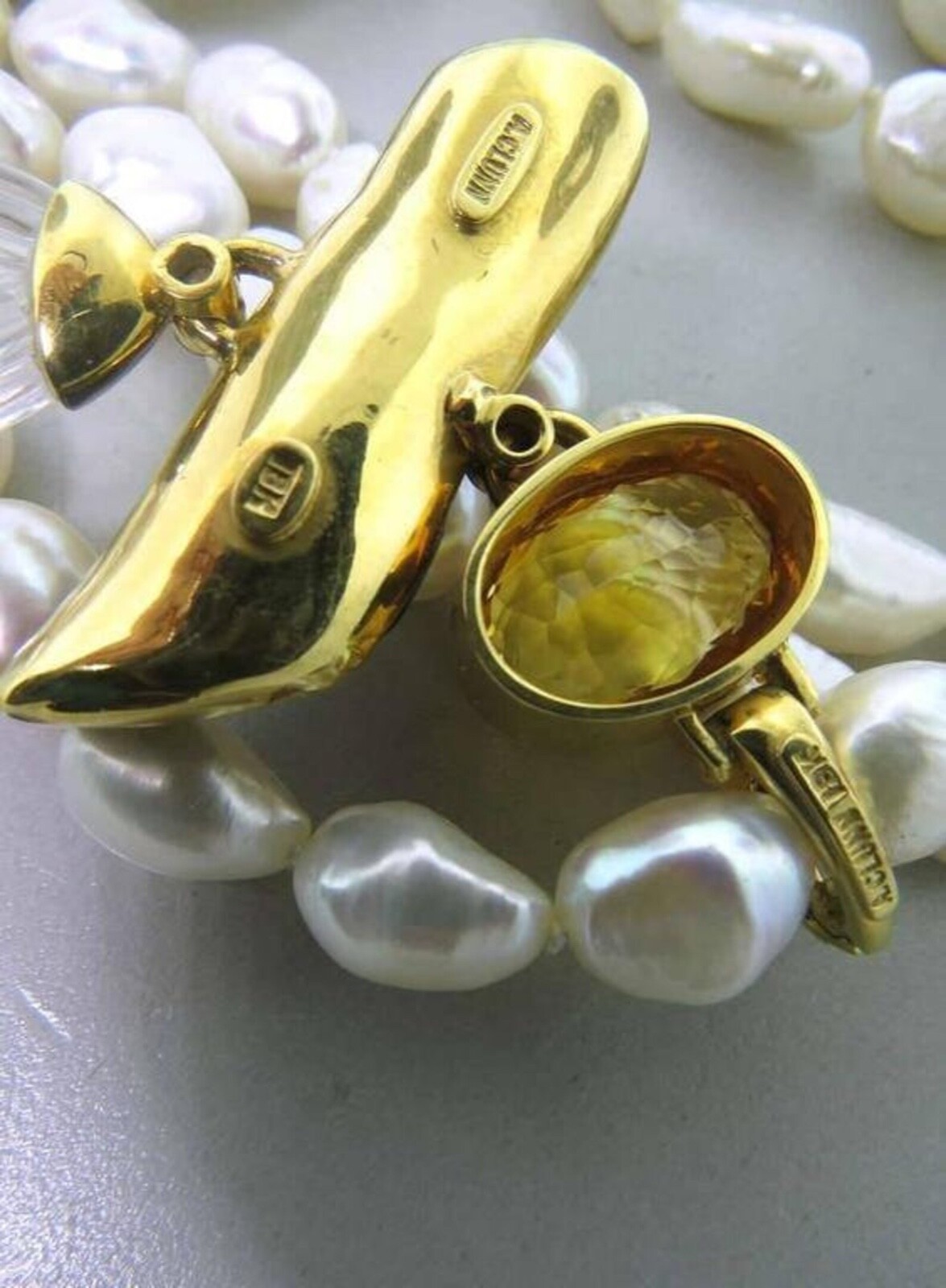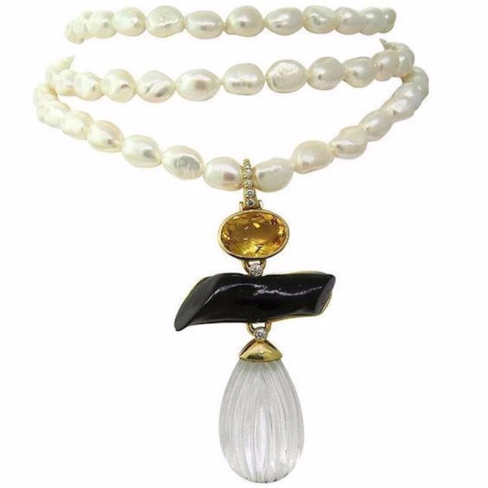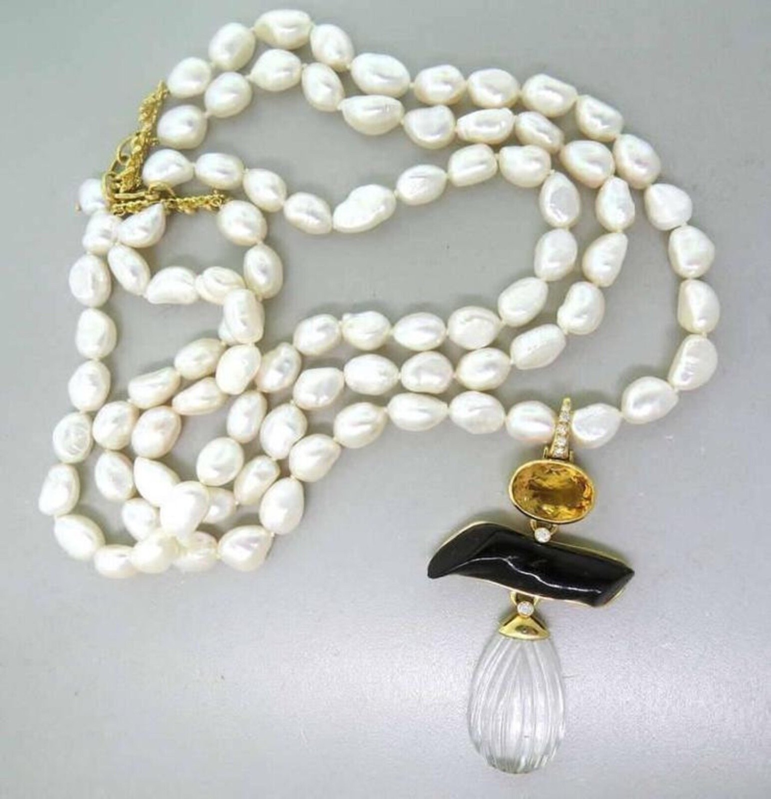 Andrew Clunn Triple Strand Pearl Necklace Citrine Diamond Onxy Pendant Necklace
