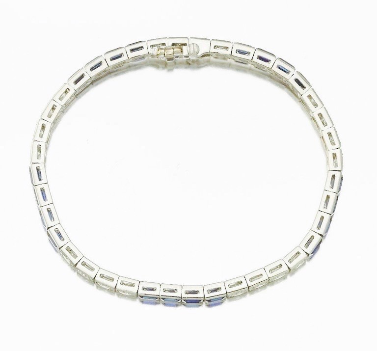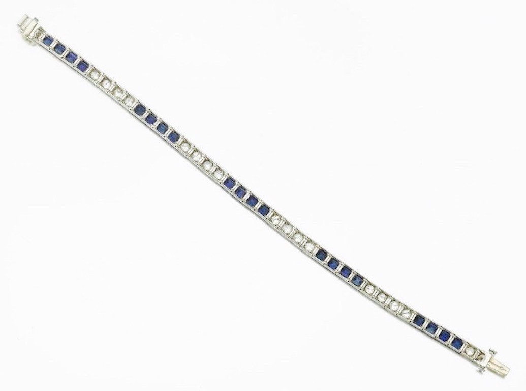 The synthetic sapphires of this era are still very collectible and valuable, they come quite close to resembling the naturally occurring ones and were very well done - most jewelers struggle a bit to determine between the two I have been told. Lovely in its own right and terrific to stack this with other diamond bracelets to add a flash of blue color!