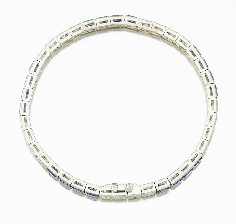 Stunning Art Deco Platinum, Diamond and Synthetic Sapphire Straight-Line Bracelet measuring a perfect length of 7 ¼". The platinum articulated link bracelet is set with alternating round brilliant cut G-H VS quality diamonds (2.40 carats total) and approximately 9 carats of rectangular cut synthetic sapphires. There is a slide-in clasp and the overall weight is 19.7 gm. The bracelet is in very condition.