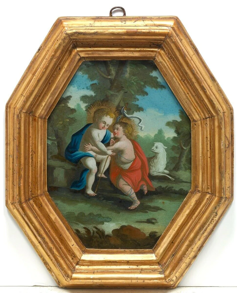 Vintage Antique 18th Century Baby Jesus, St. John the Baptist Reverse Oil Origin