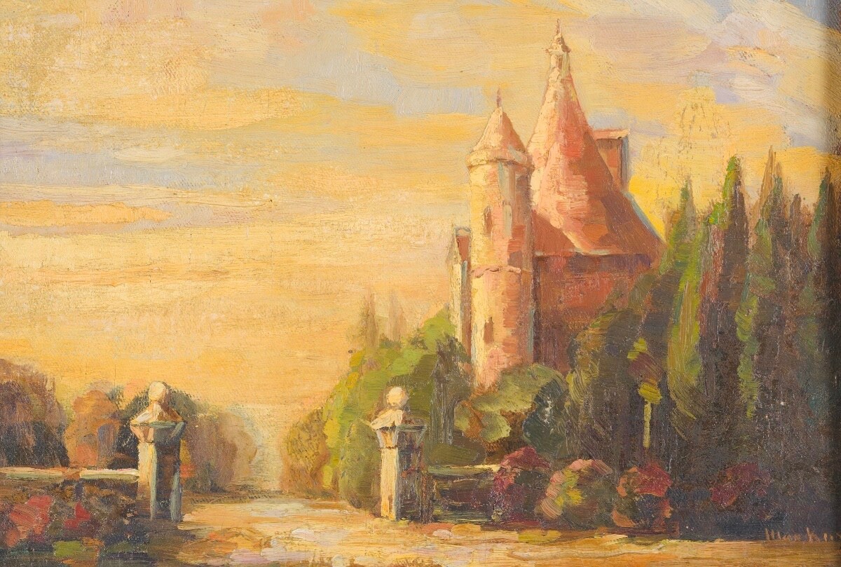 Castle in Landscape. Oil on canvas laid down to board, illegibly signed lower right, in decorative gold frame, overall 17" x 22".