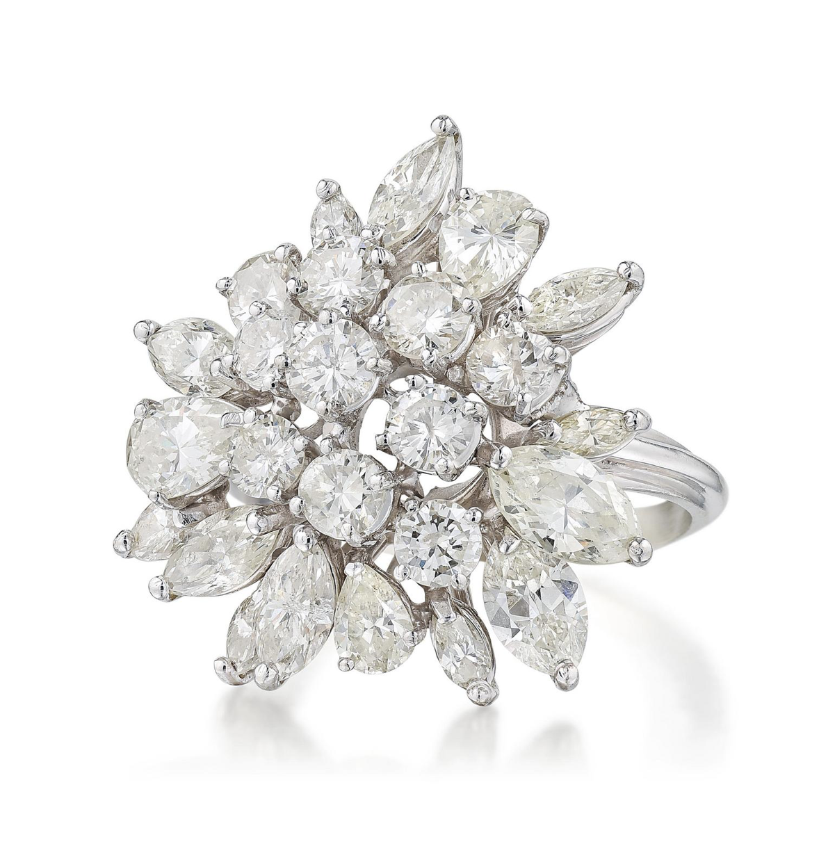 This impressive ring is crafted in 14K white gold and set with an impressive large array of multi cut diamond stones in mnarquise, pear and round brilliant-cut diamonds.  The total diamond weight is approximately 4.00 carats.   The diamonds are near colorless for most (G-H) with some J-K color grades too.  The clarity is VS2-SI1-SI2. The diamonds are very large so the ring emanates a ton of fire and scintillation; extremely sparkly! The ring top measures approximately 7/8 x 7/8 inch.