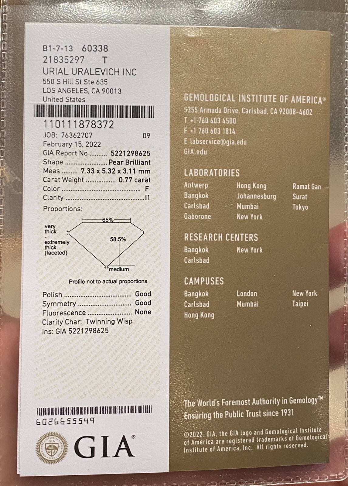 This GIA certified 0.77 carat pear cut diamond is a stunning addition to any jewelry collection. With a natural stone creation and a beautiful F/I 1 color rating, this diamond is sure to impress. The cut of the diamond is impeccable, allowing it to sparkle and shine in any light.