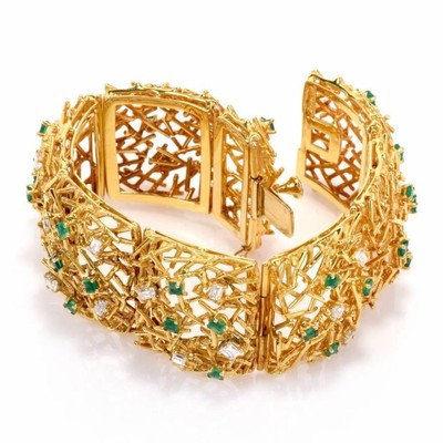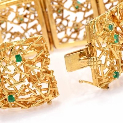 Impressive Heavy 1970's Estate 18k Gold Emerald Diamond Bracelet, 96.7 g