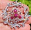 This beautiful vintage platinum brooch is comprised of two gemstone settings together with the outer designed as a floral openwork circle set featuring round brilliant cut diamonds. The total diamond weight is approximately 1.85 carats of G VS quality. The inner brooch piece is set in openwork platinum topped with 14k gold and features four stunning lively oval cut red rubies and bezel set old mine-cut diamonds. The diamonds are extremely white and glowing, estimated at G-H color and VS clarity. Estimated ruby weights 2.00 carats and diamond weight is 1.65 carats. The total diamond weight is 3.50 carats.