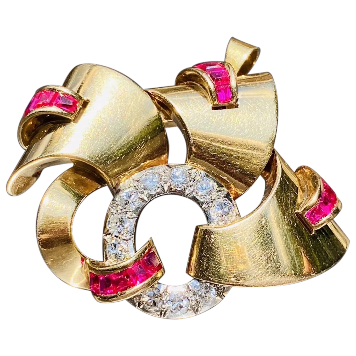 Vintage Art Deco 1940s 18k Gold Platinum Retro Ruby Diamond Brooch Pin Pendant