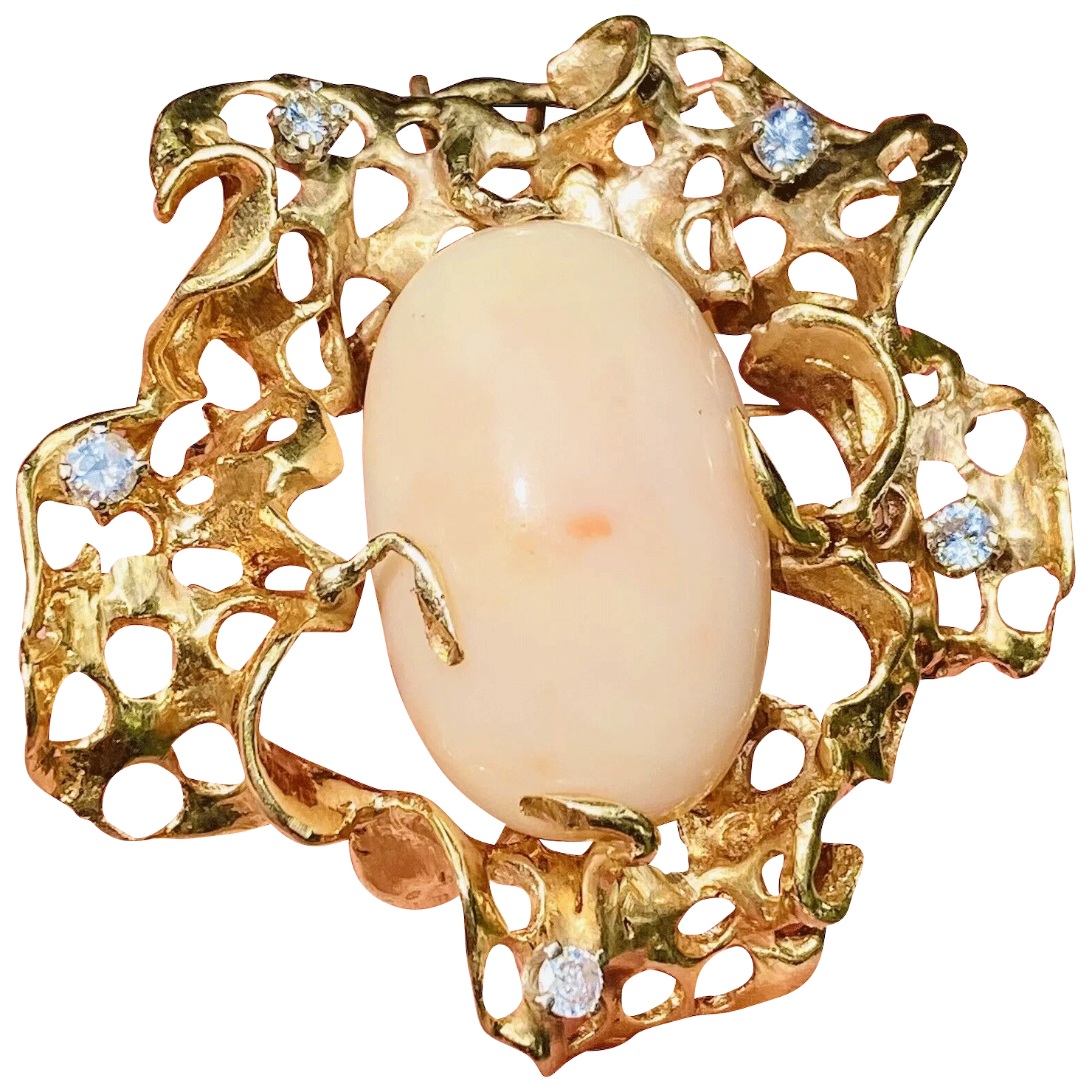 Vintage Freeform Brutalist 14k Gold Angel Skin Coral Diamond Pendant Brooch