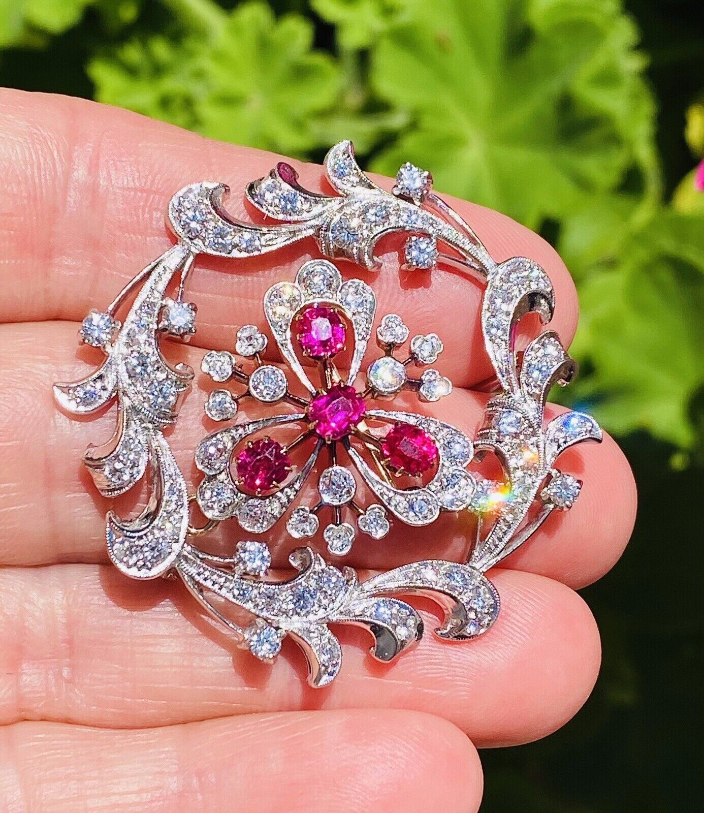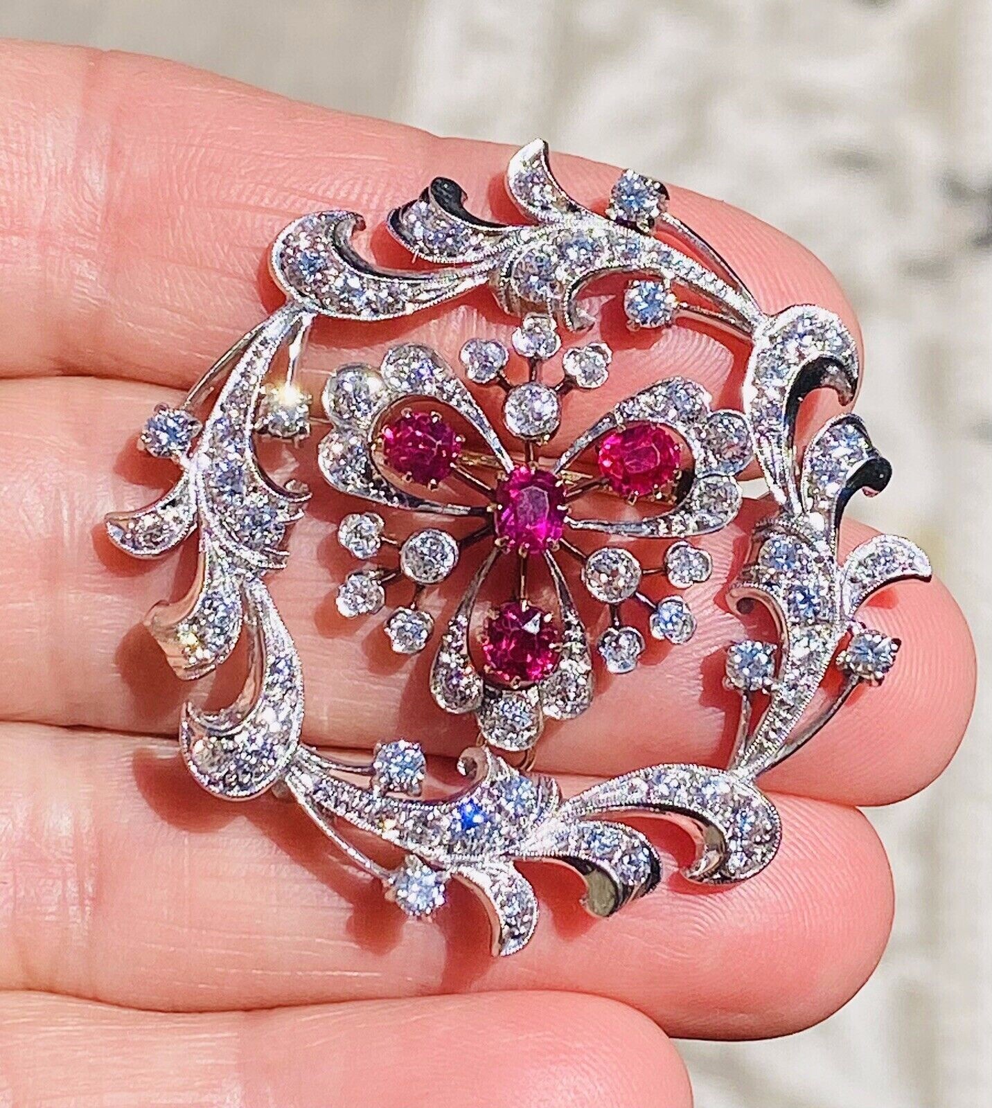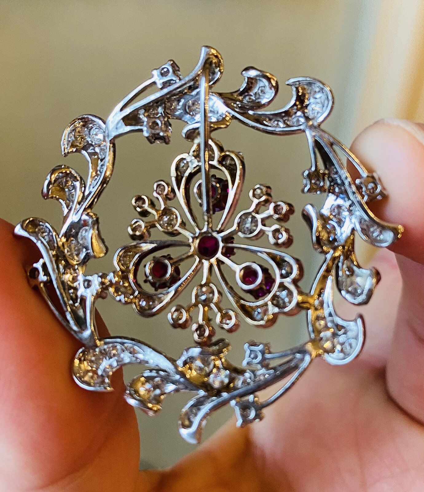 Vintage Estate Platinum & 14k Gold 5.50ctw Diamond Ruby Brooch / Pin