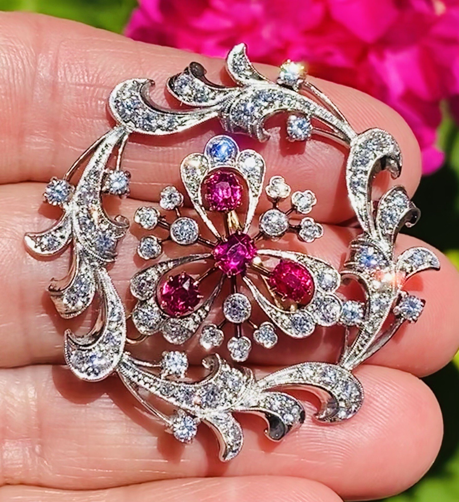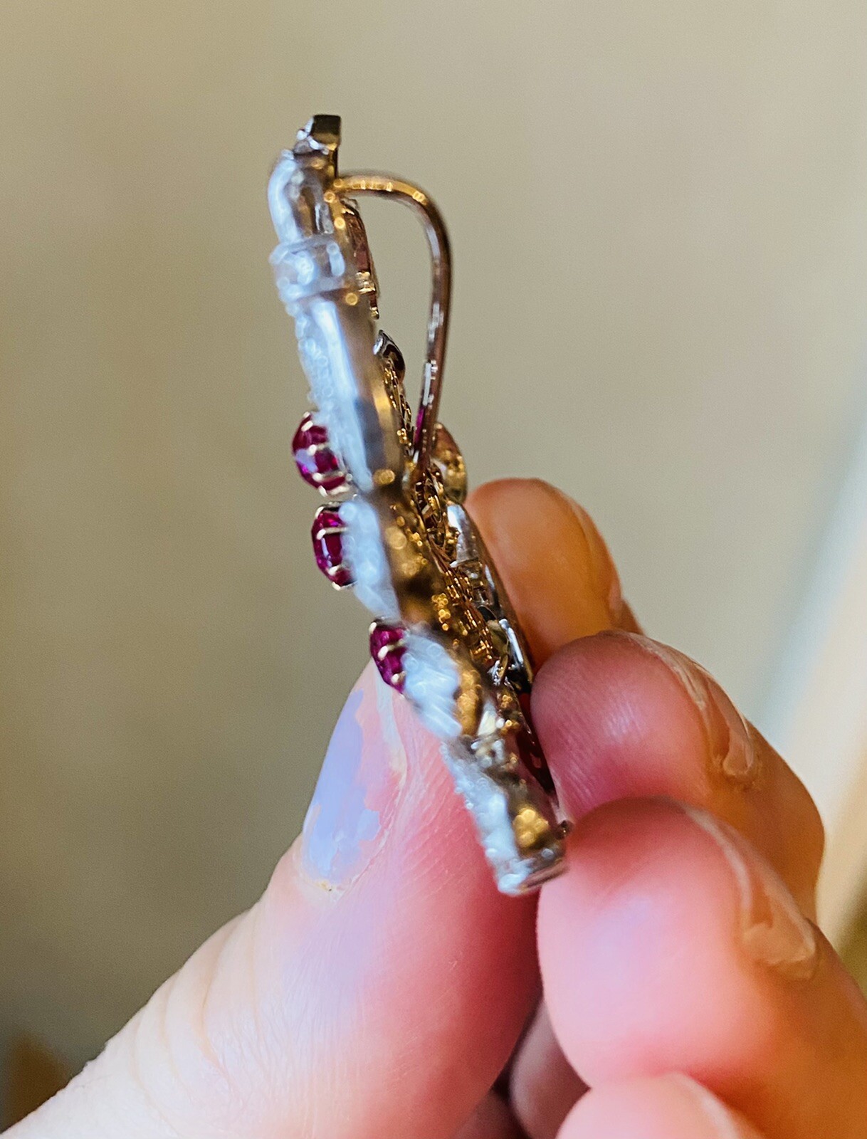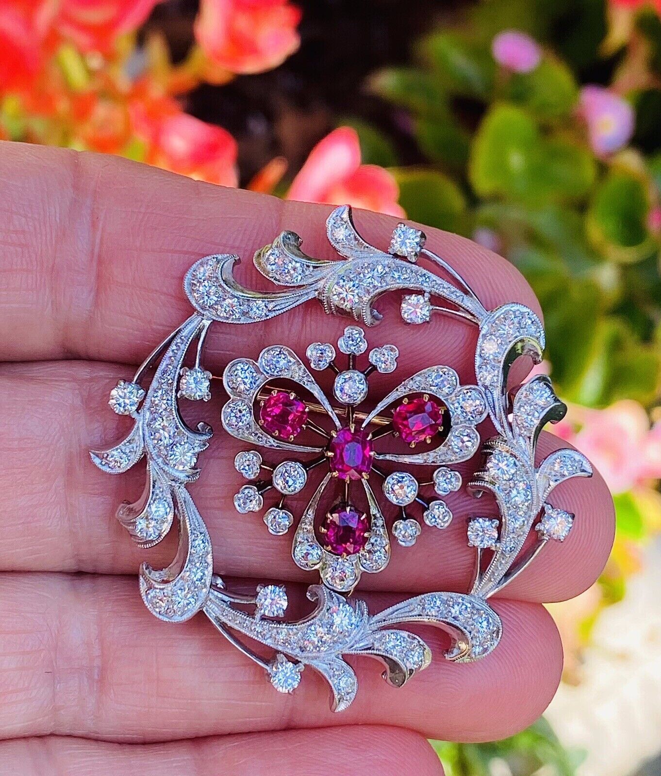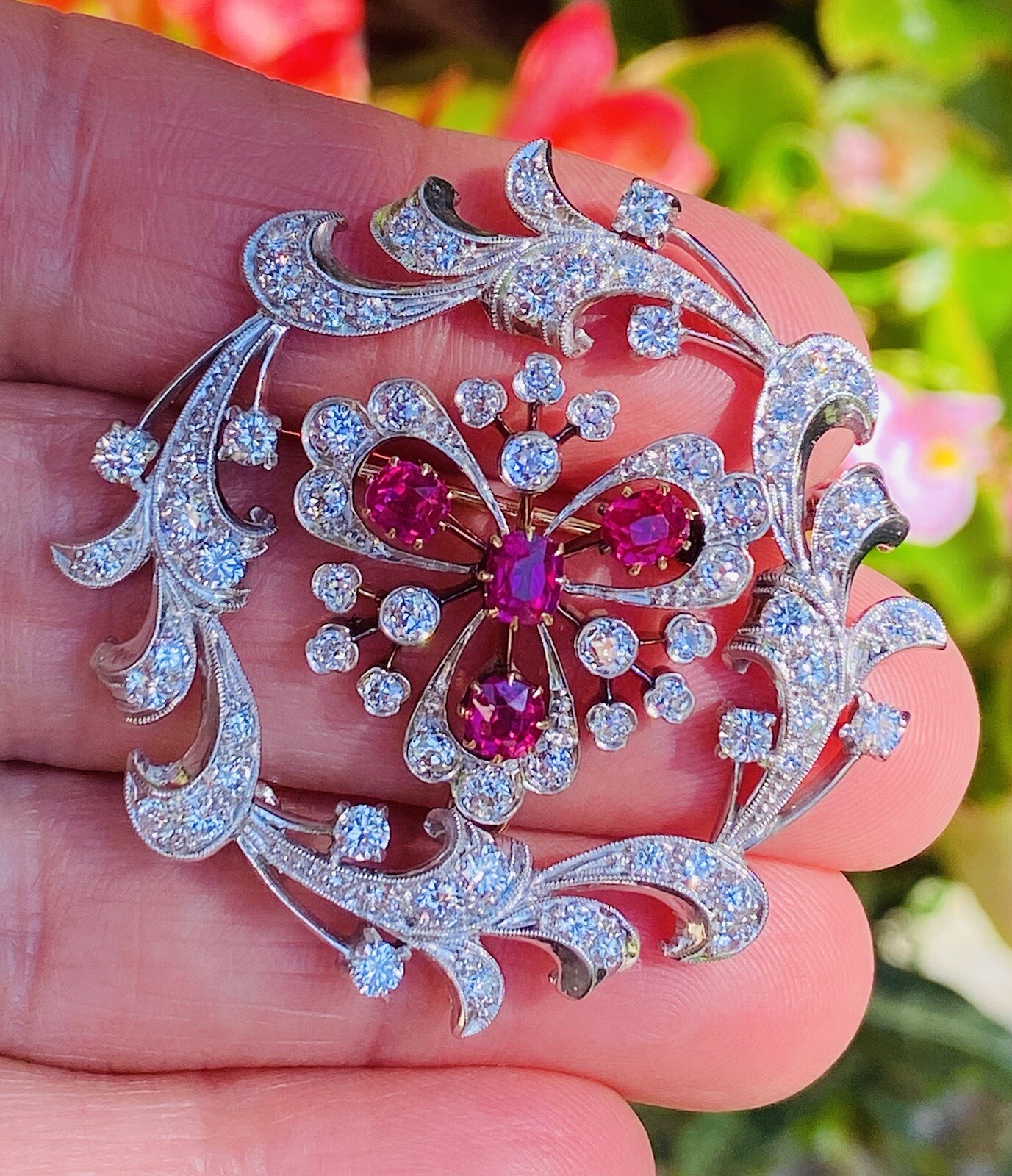 Vintage Estate Platinum & 14k Gold 5.50ctw Diamond Ruby Brooch / Pin