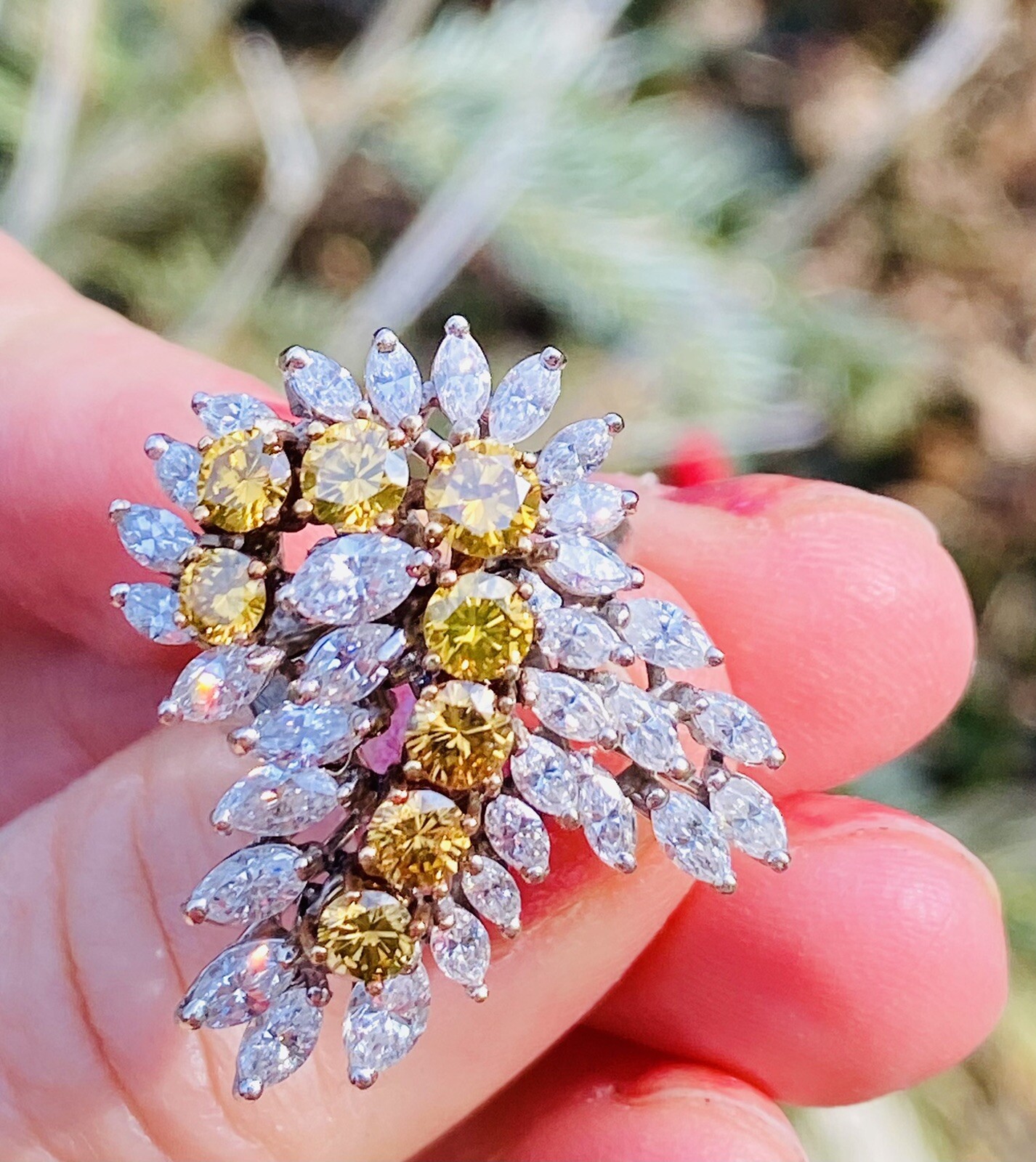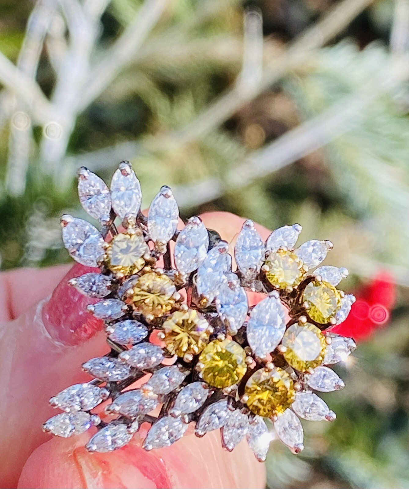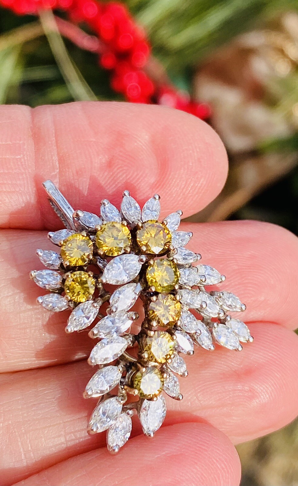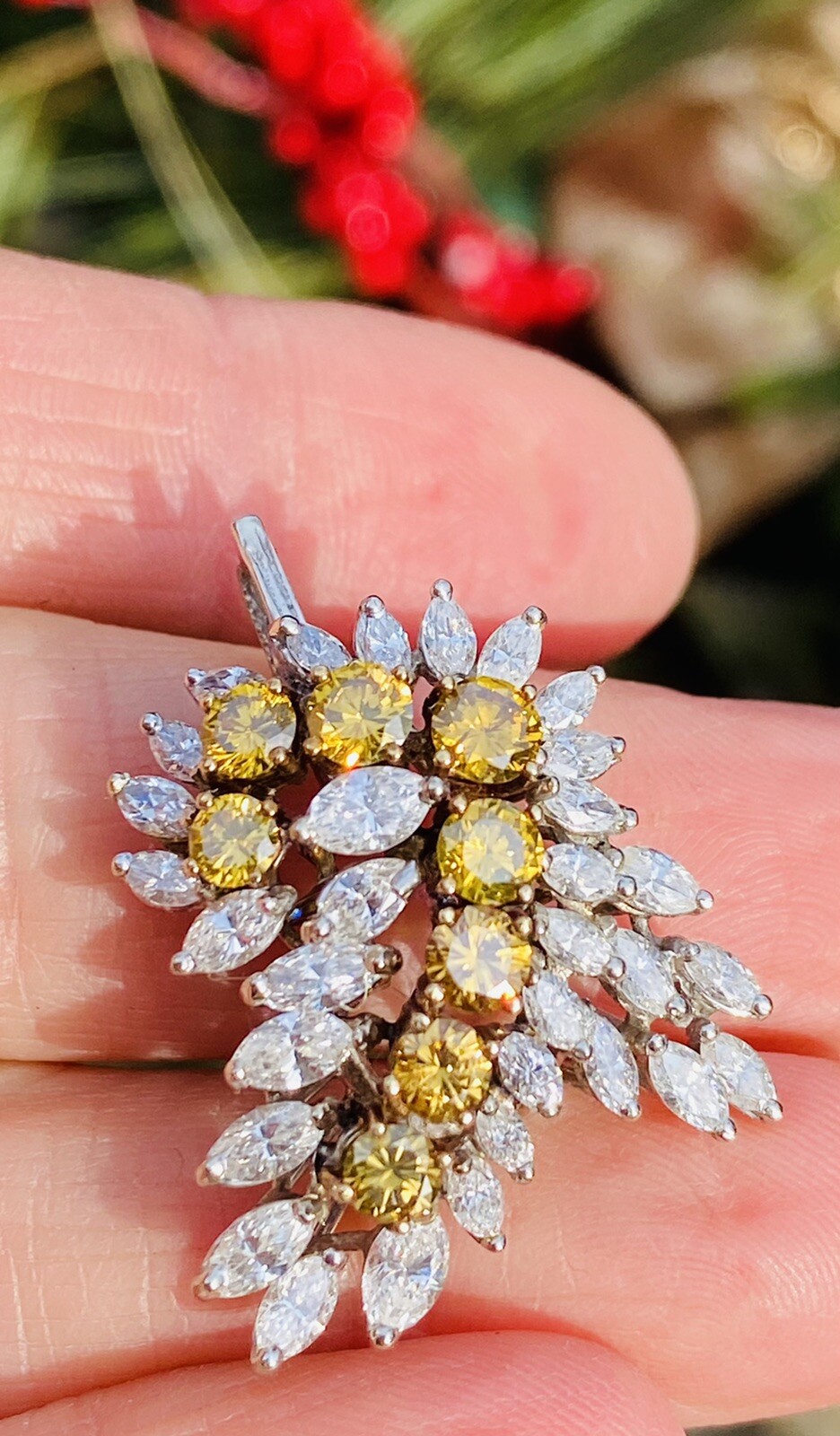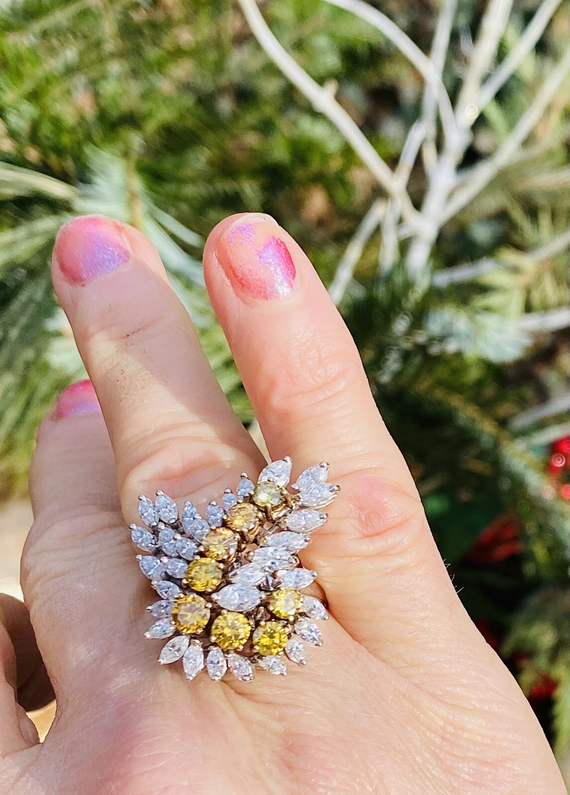 This impressive vintage 1960s Ring-Pendant style ring features a stunning large diamond waterfall design, featuring 32 marquise cut diamonds weighing 2.50 carats as well as 8 large round brilliant cut diamonds weighing 1.85 carats. The diamonds are of excellent VS1 clarity, and G-H for the white diamonds, while a rich golden amber for the colored diamonds. The total diamond weight is approximately 4.35 carats.