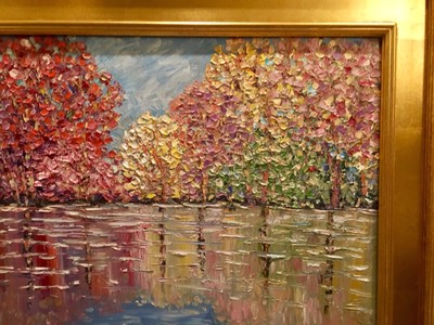 "Abstract Autumn Trees Impasto Landscape", Original Oil Painting by artist Sarah Kadlic. Abstract rendering of intense and pale shades of color blocking highlighted with acrylic paint impasto. Pinks, golds, and pale blues contrast against deeper blues, browns and purples. Lots of texture this shimmering oil. Thick, colorful texture design is her signature style. Painted brush and palette knife. Completed with finest materials on one stretched Gallery Wrapped canvas sized 24" wide by 20" high. Framed in a custom chunky solid wood gilt leaf frame that extends the piece by 4" on all sides. An original painting, signed by artist, not print or reproduction of any kind.