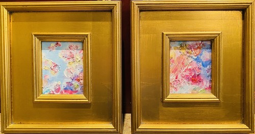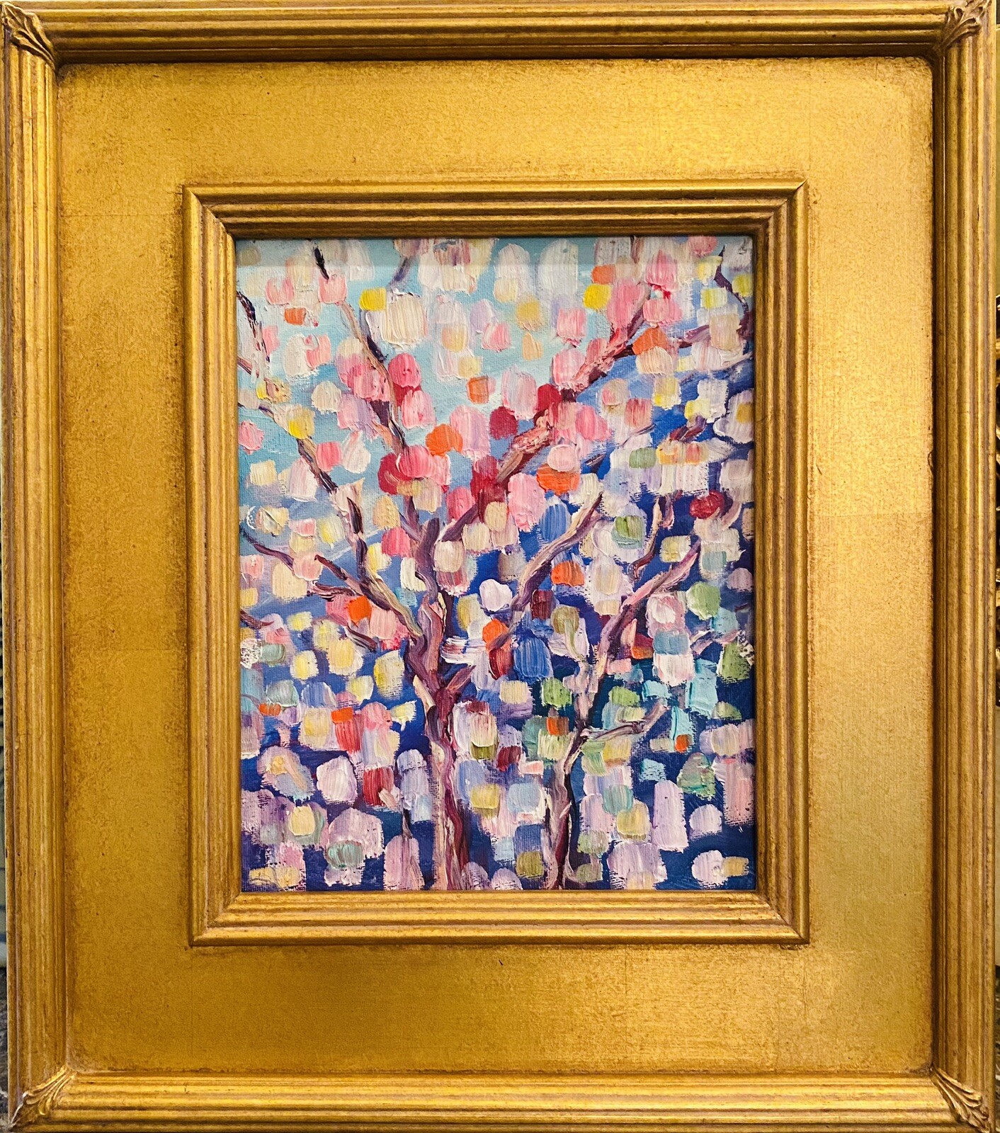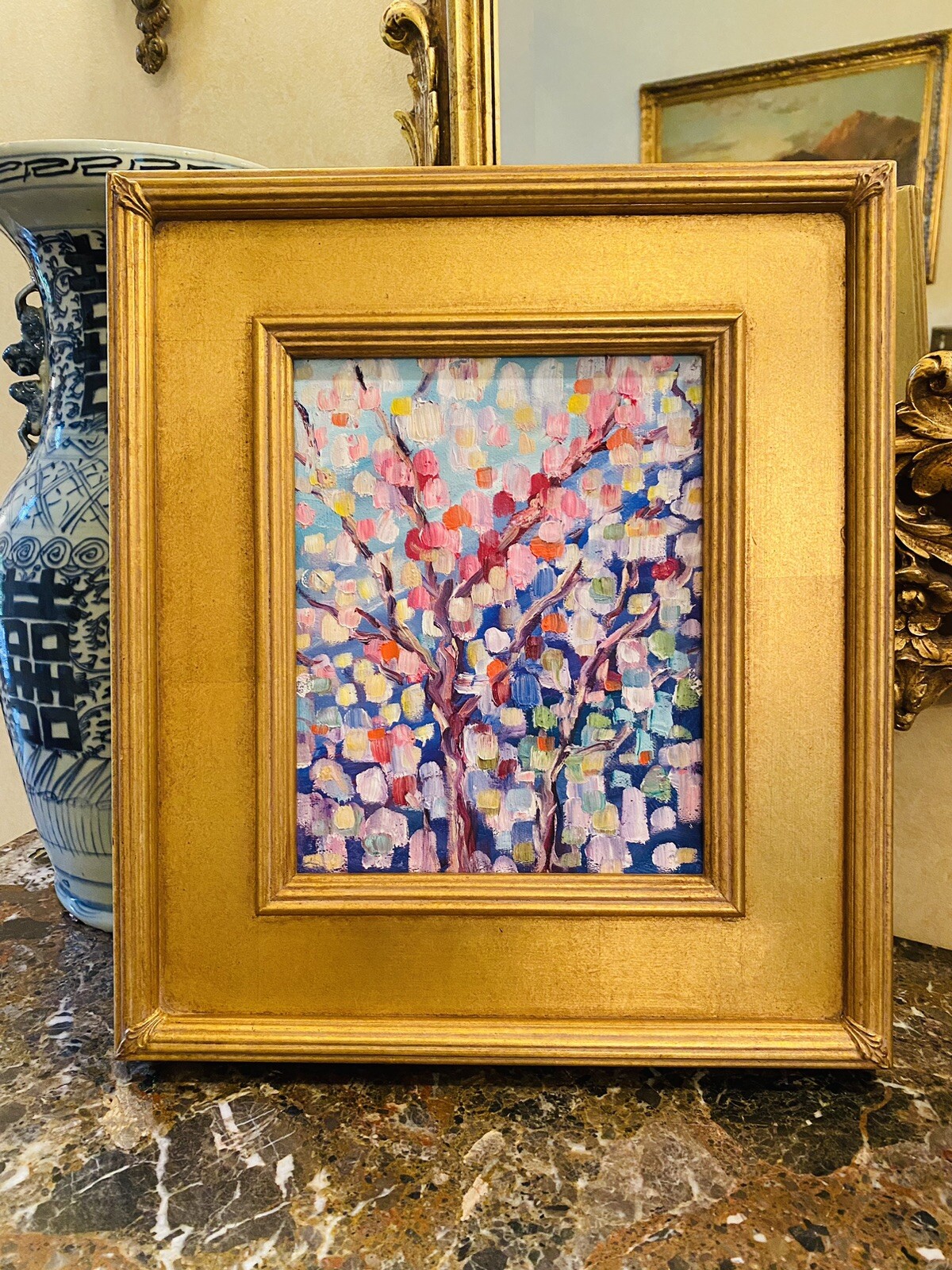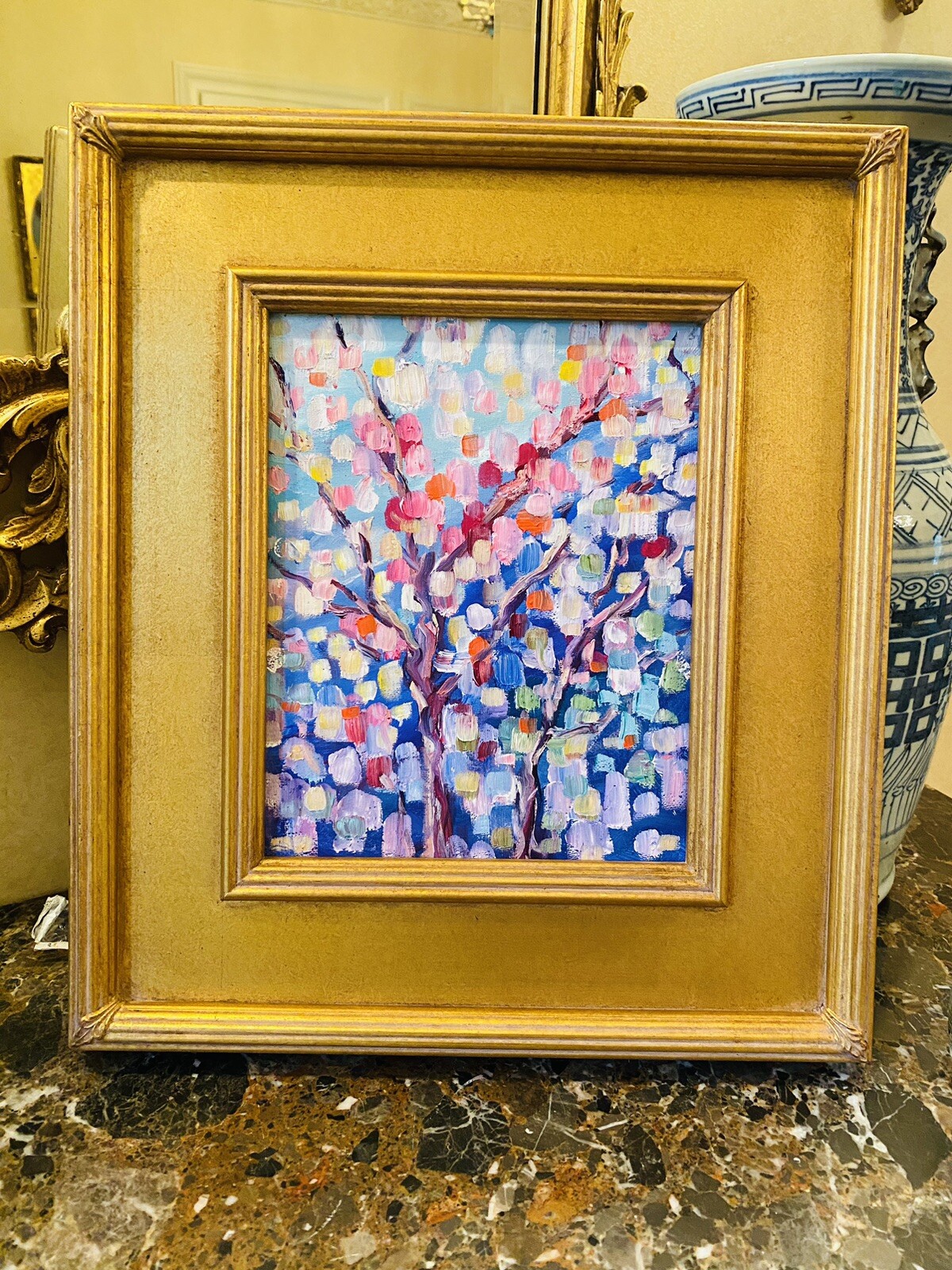 “Abstract Color Impasto", Original Oil Painting by artist Sarah Kadlic. Abstract rendering of colorful impasto. Lots of movement this shimmering oil. Thick, colorful texture design is her signature style. Painted brush and palette knife. Completed with finest materials on one Canvas panel, sized 10” high by 8”wide. Framed in a stunning Gilt gold wood frame taking the size of the piece to 16”x14”. An original painting, signed by artist, not print or reproduction of any kind.