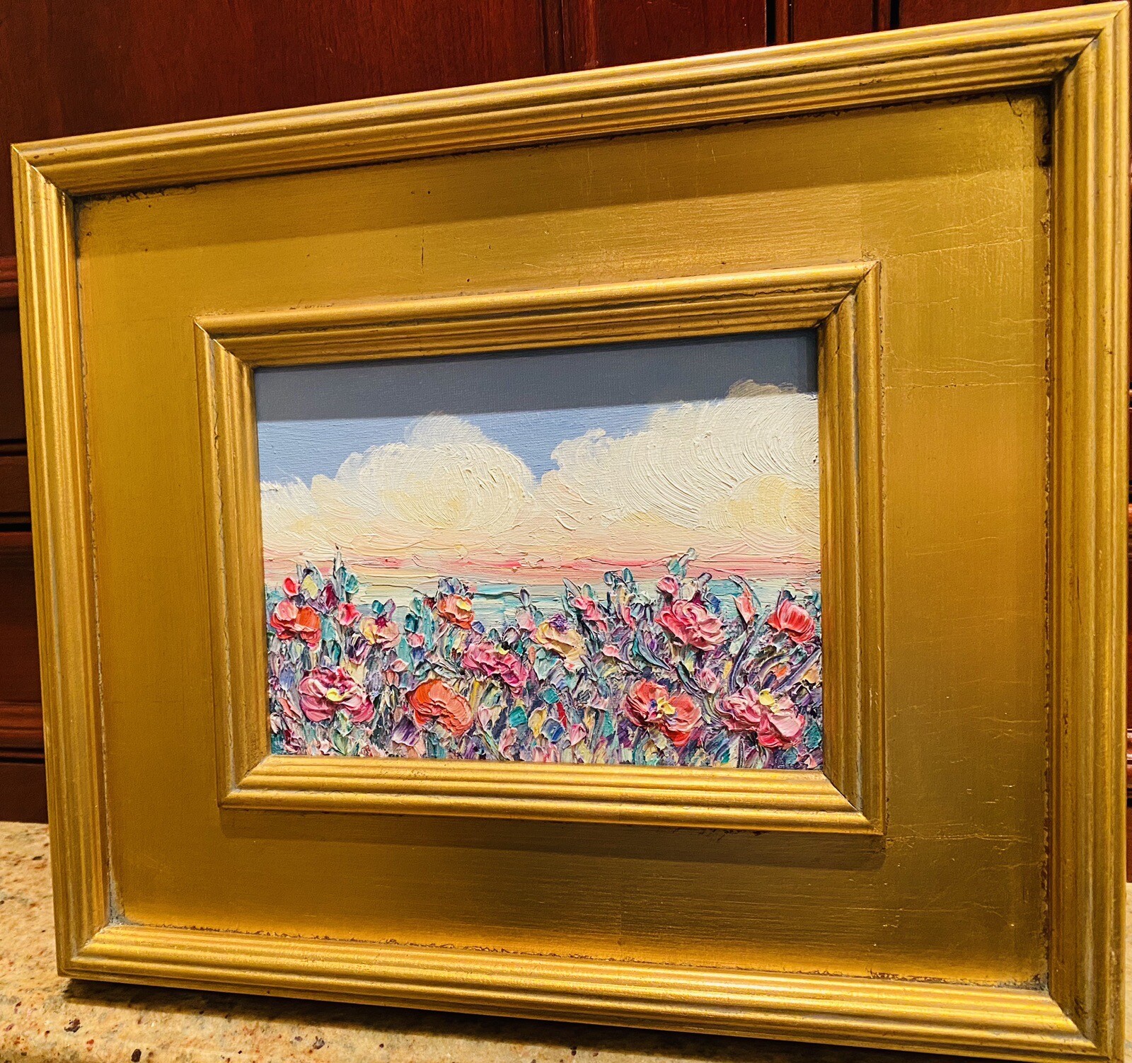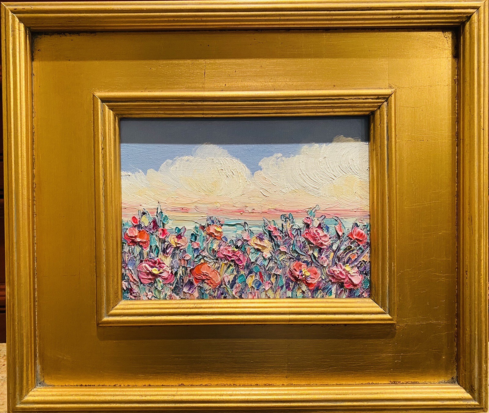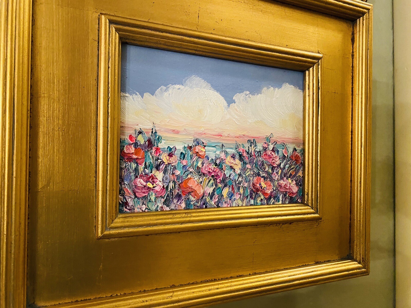 “Abstract Landscape Impasto", Original Oil Painting by artist Sarah Kadlic. Abstract rendering of colorful textured fields of flowers with mountains in the distance. Lots of movement this shimmering oil. Thick, colorful texture design is her signature style. Painted brush and palette knife. Completed with finest materials on one Canvas panel, sized 5” high by 7” wide. Framed in a stunning Gilt gold wood frame taking the size of the piece to 11” x13”. An original painting, signed by artist, not print or reproduction of any kind.