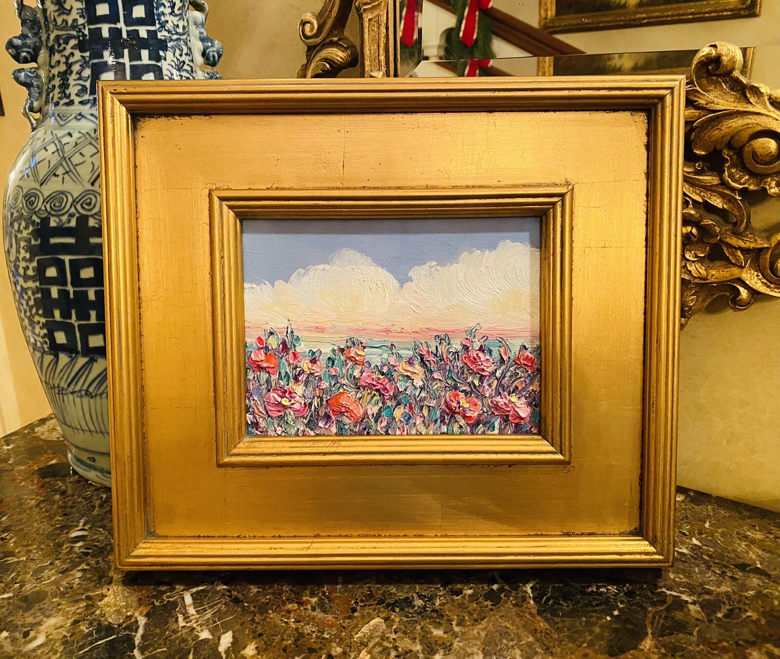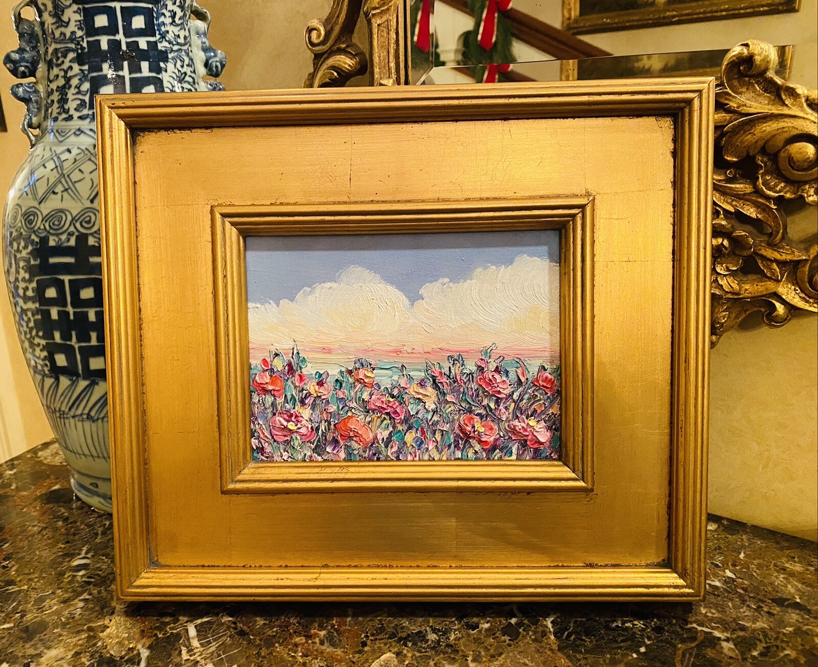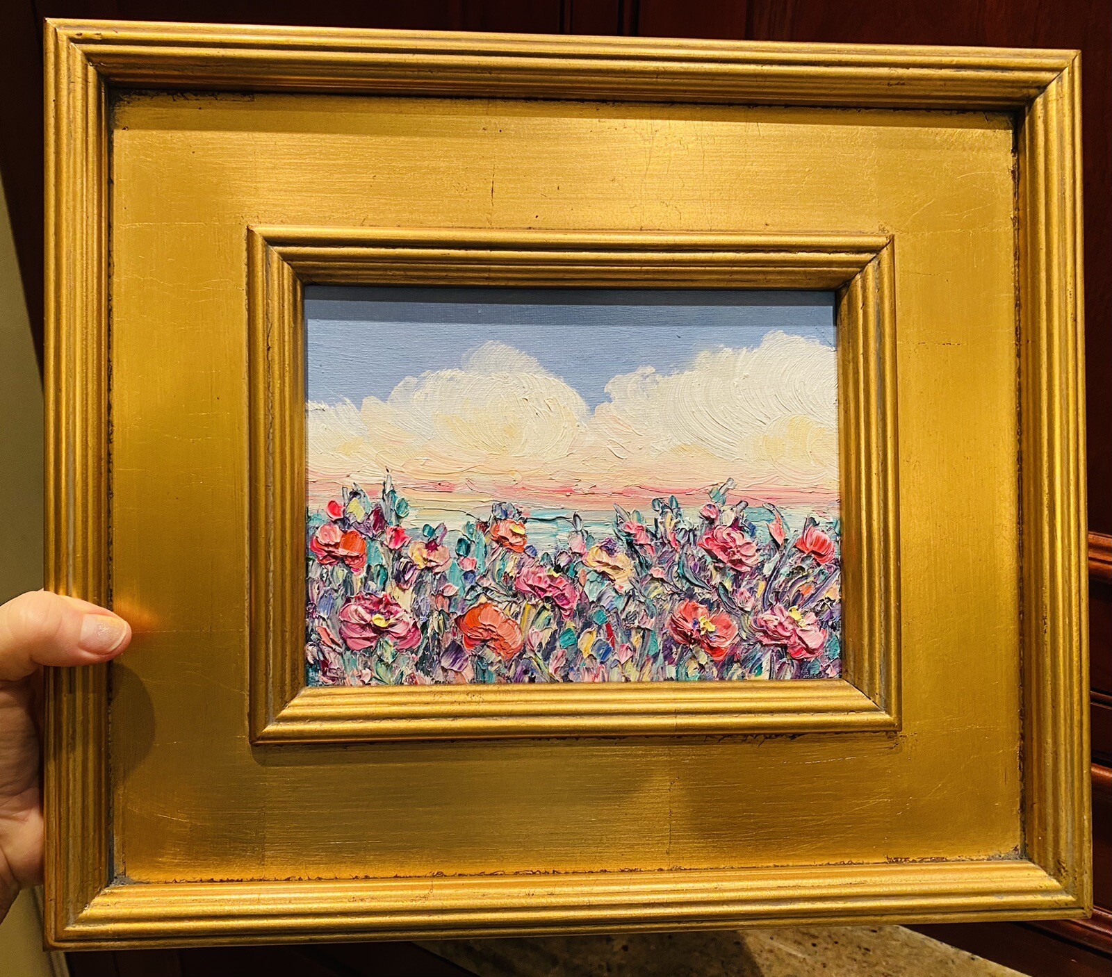“Abstract Landscape Impasto", Original Oil Painting by artist Sarah Kadlic. Abstract rendering of colorful textured fields of flowers with mountains in the distance. Lots of movement this shimmering oil. Thick, colorful texture design is her signature style. Painted brush and palette knife. Completed with finest materials on one Canvas panel, sized 5” high by 7” wide. Framed in a stunning Gilt gold wood frame taking the size of the piece to 11” x13”. An original painting, signed by artist, not print or reproduction of any kind.