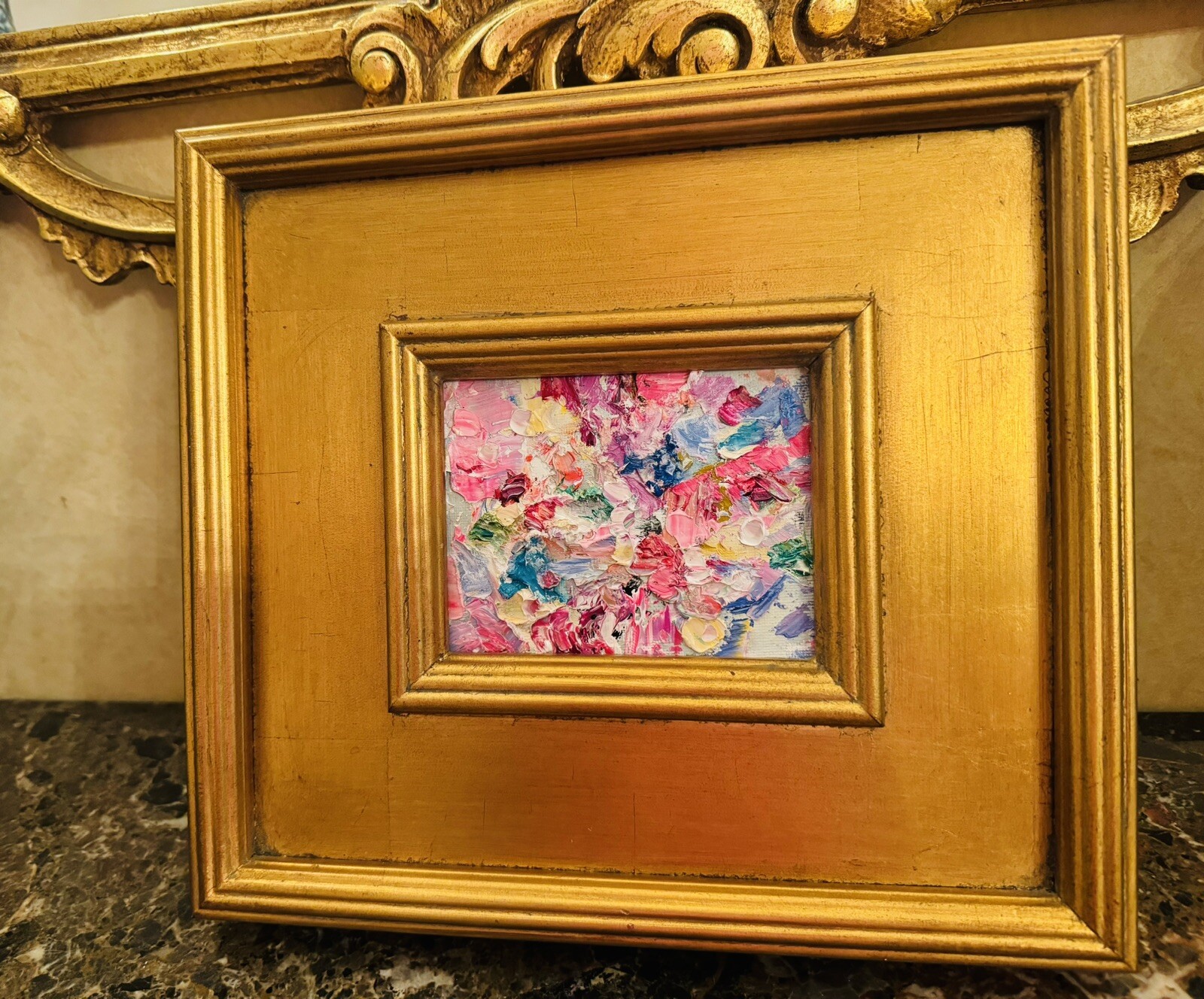 “Abstract Landscape Impasto” Original Oil Painting by artist Sarah Kadlic. Abstract rendering of colorful impasto striations with lots of movement this shimmering oil. Thick, colorful texture design is her signature style. Painted brush and palette knife. Completed with finest materials on one Canvas panel, sized 4" high by 5” wide. Framed in a stunning Gilt gold wood frame taking the size of the piece to 10”x11". An original painting, signed by artist, not print or reproduction of any kind.