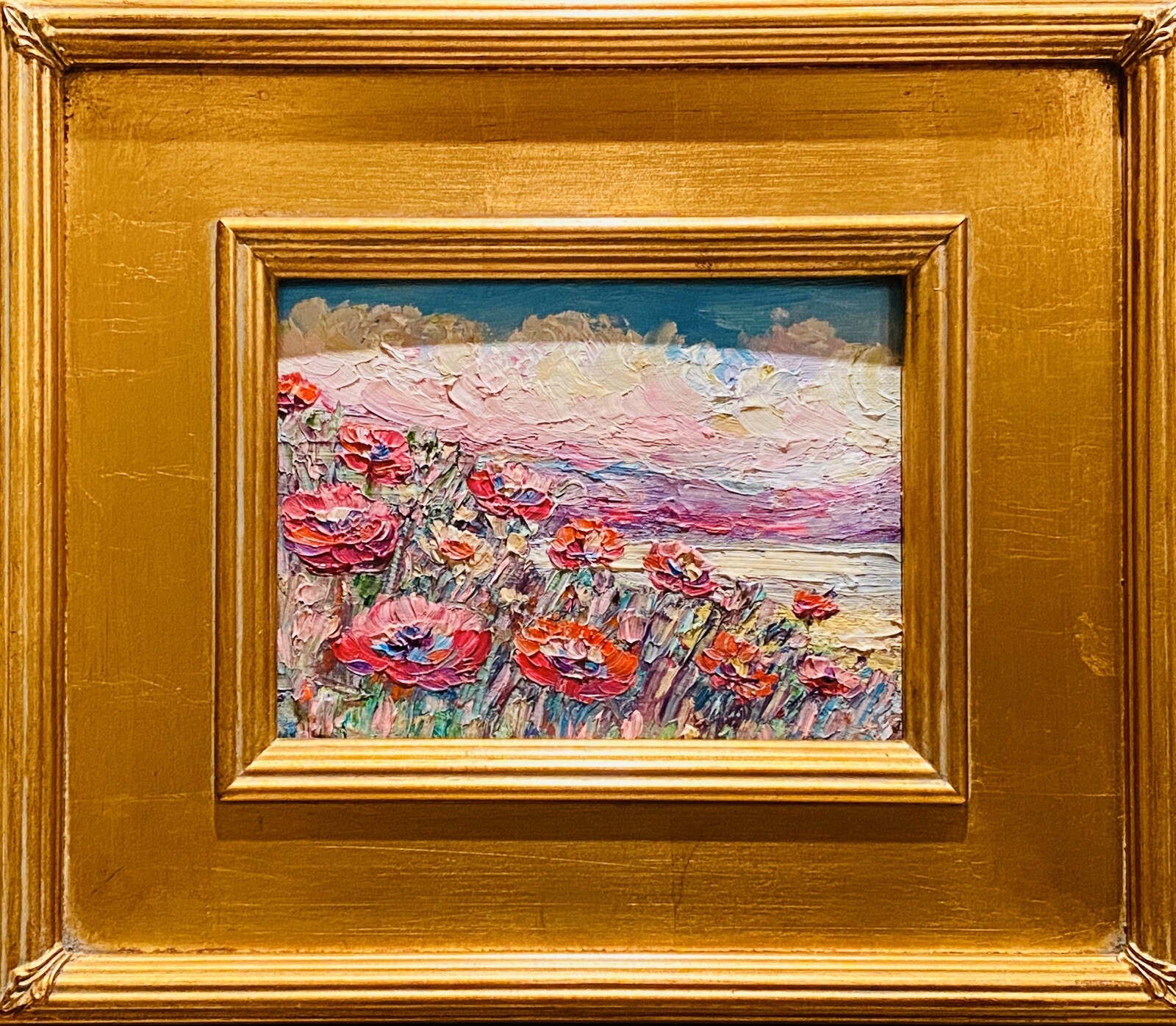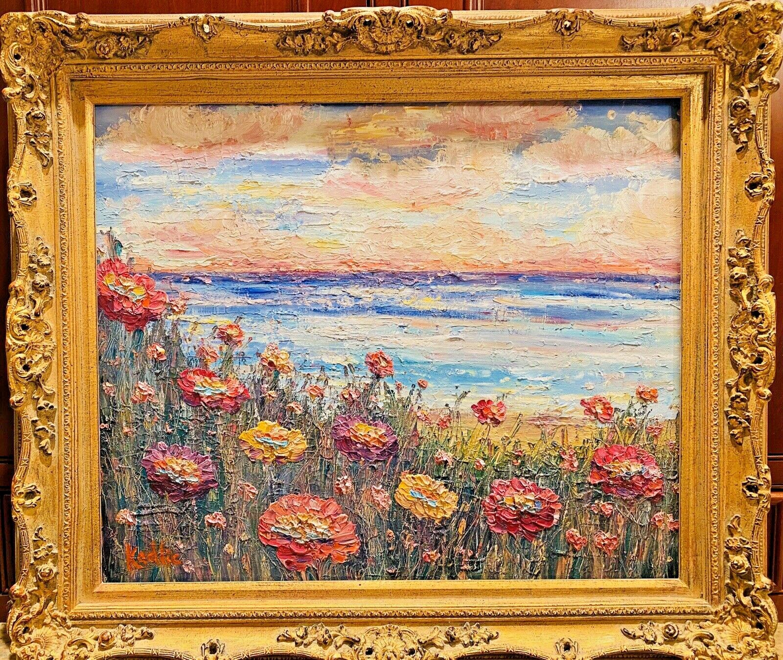 "Impressionist Floral Seascape", Original Oil Painting by artist Sarah Kadlic. Abstract rendering of colorful flowers against a seascape of water and sunset clouds... shades of color abound... with lots of chunky impasto and texture this shimmering oil. Thick, colorful texture design is her signature style. Painted brush and palette knife. Completed with finest materials on one stretched Gallery Wrapped canvas sized 24" wide by 20" high. Framed in a custom chunky solid wood gilt leaf frame that extends the piece by 4" on all sides. An original painting, signed by artist, not print or reproduction of any kind.