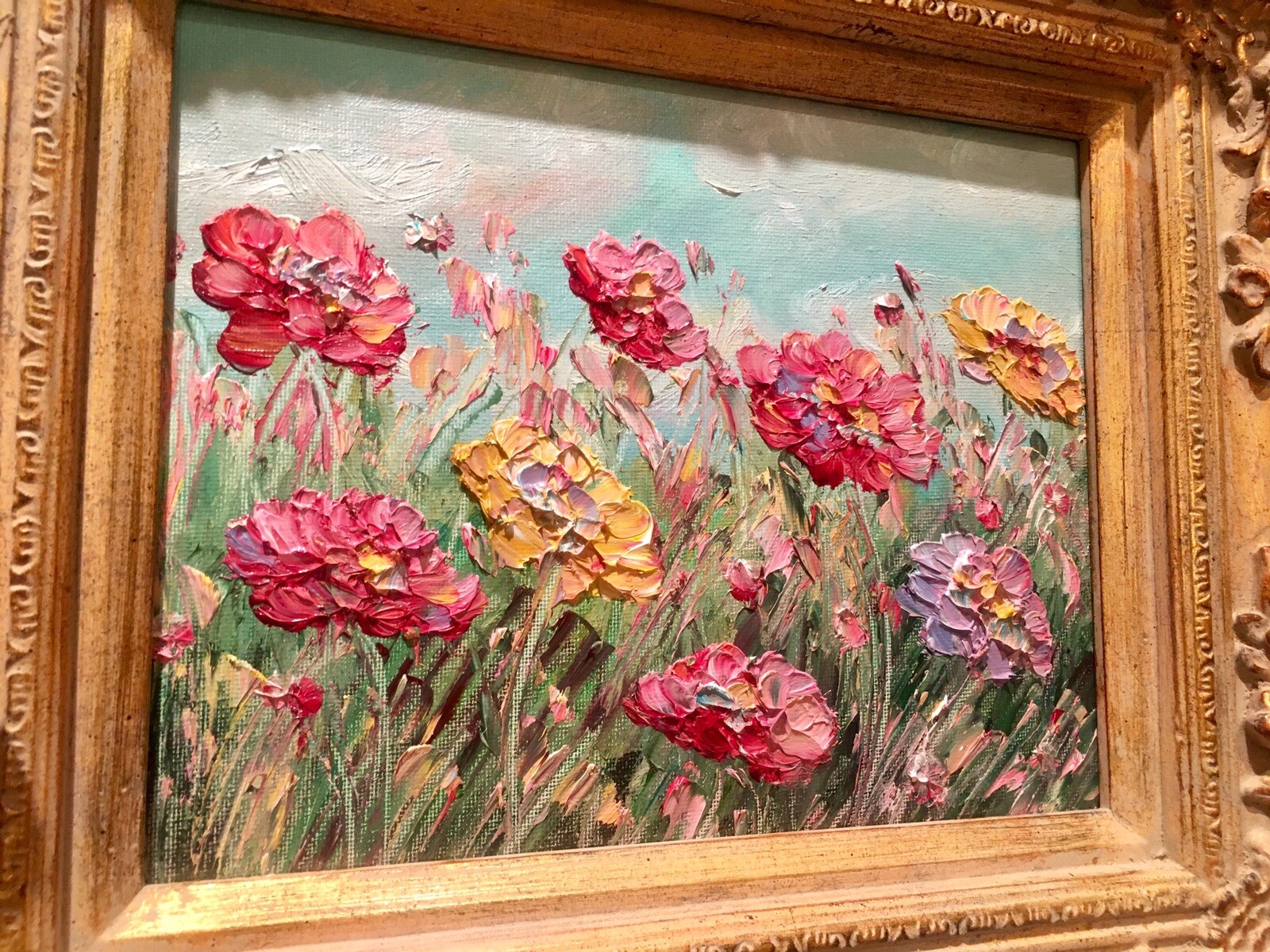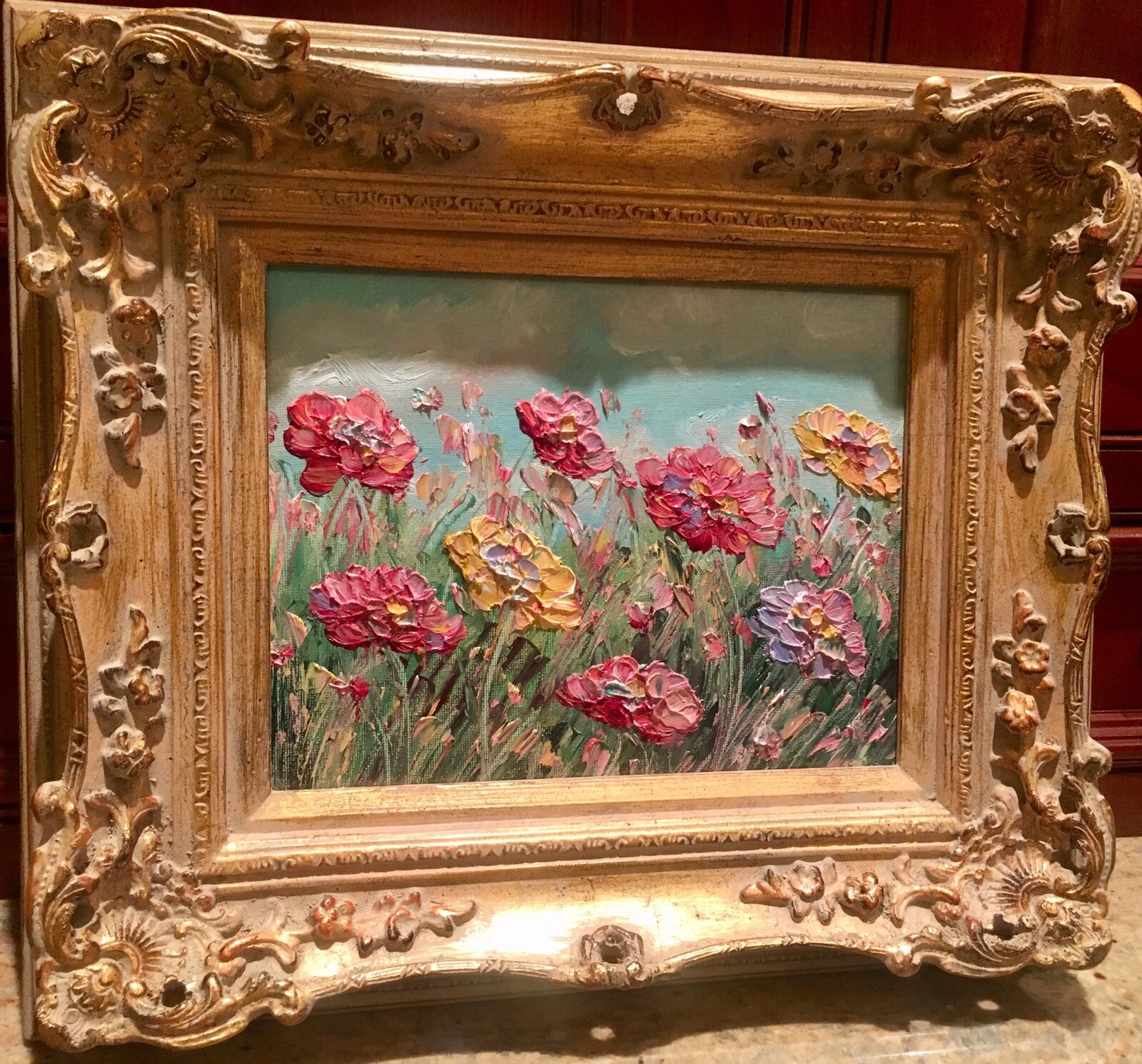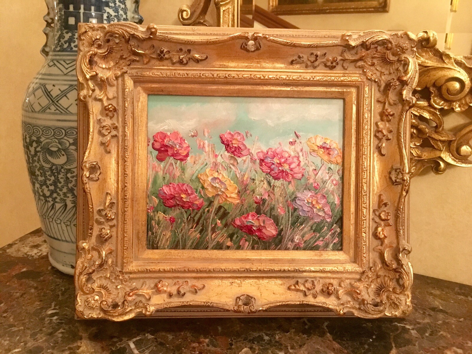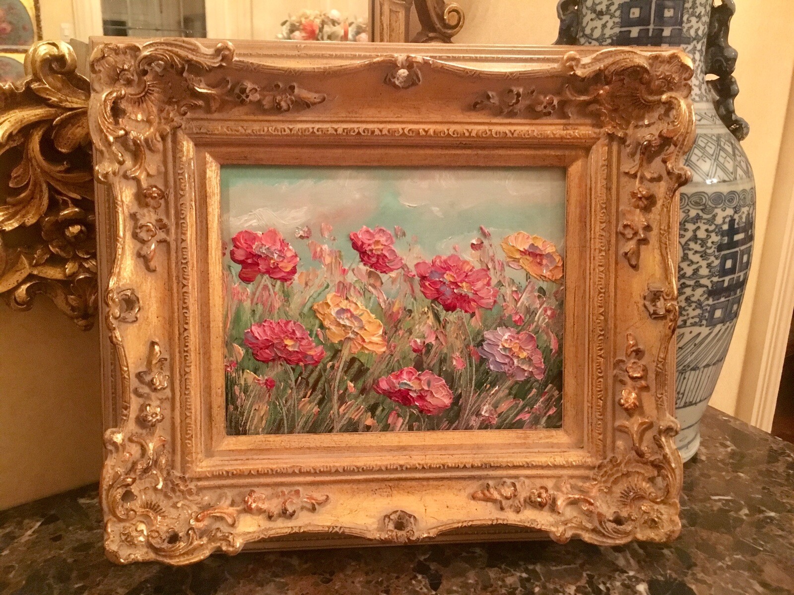 "Abstract Wildflowers Floral Landscape”, Original Oil Painting by artist Sarah Kadlic. Abstract rendering of a field of wild flowers against sweeping skies with lots of movement this shimmering oil. Thick, colorful texture design is her signature style. Painted brush and palette knife. Completed with finest materials on one Canvas panel, sized 8" high by 10" wide. Framed in a stunning European Carved French Frame with Gilt highlights. An original painting, signed by artist, not print or reproduction of any kind.