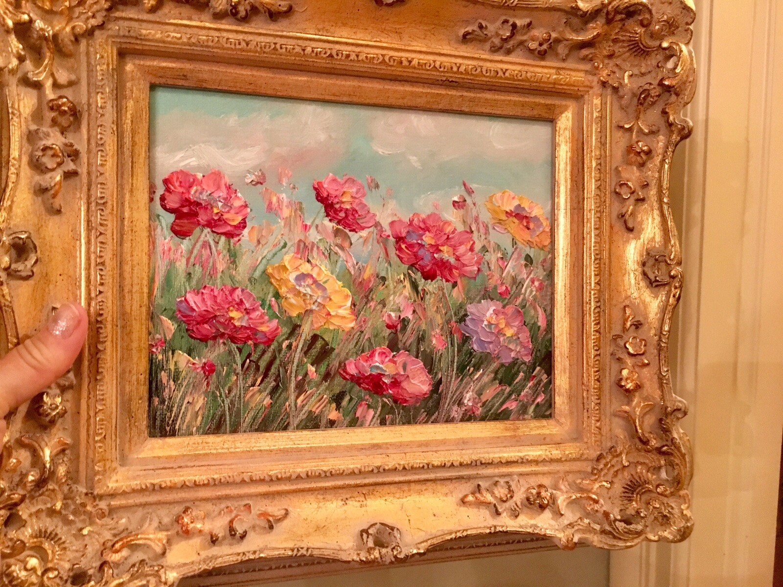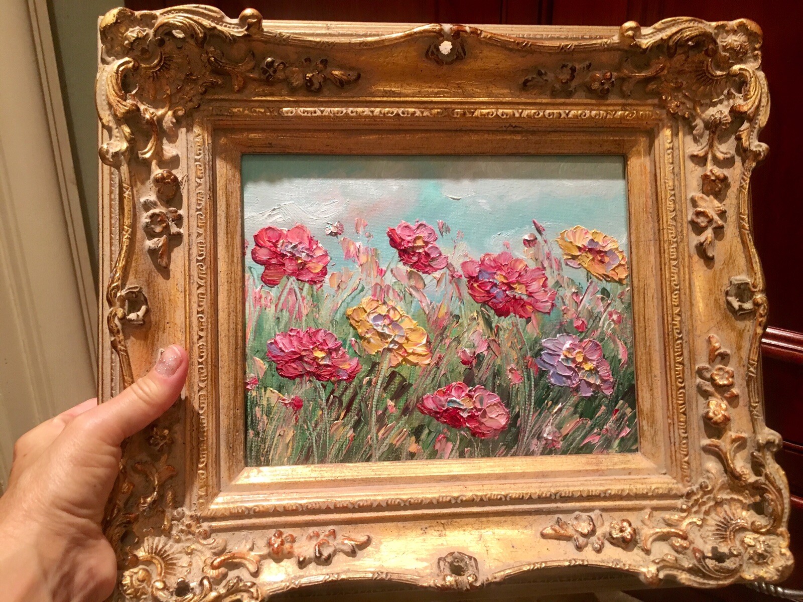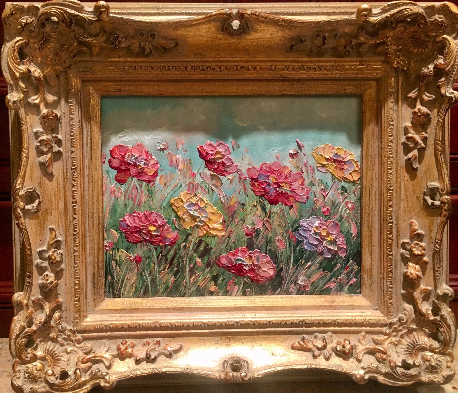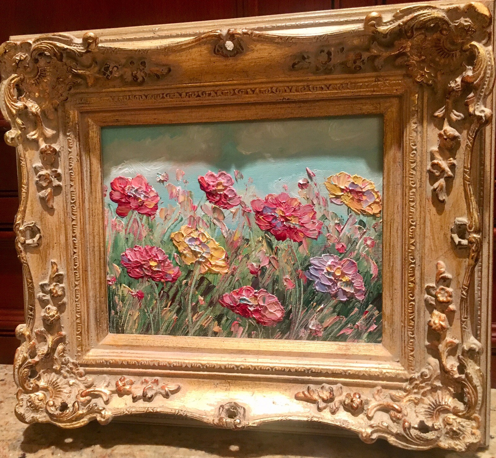 "Abstract Wildflowers Floral Landscape”, Original Oil Painting by artist Sarah Kadlic. Abstract rendering of a field of wild flowers against sweeping skies with lots of movement this shimmering oil. Thick, colorful texture design is her signature style. Painted brush and palette knife. Completed with finest materials on one Canvas panel, sized 8" high by 10" wide. Framed in a stunning European Carved French Frame with Gilt highlights. An original painting, signed by artist, not print or reproduction of any kind.