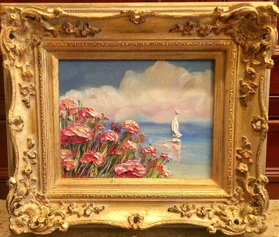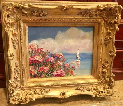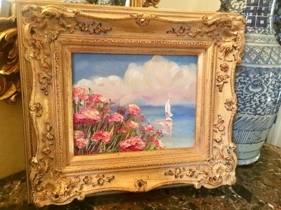 KADLIC French Pink Poppies Seascape Sailboats Gilt Gold Wood Frame 8x10?