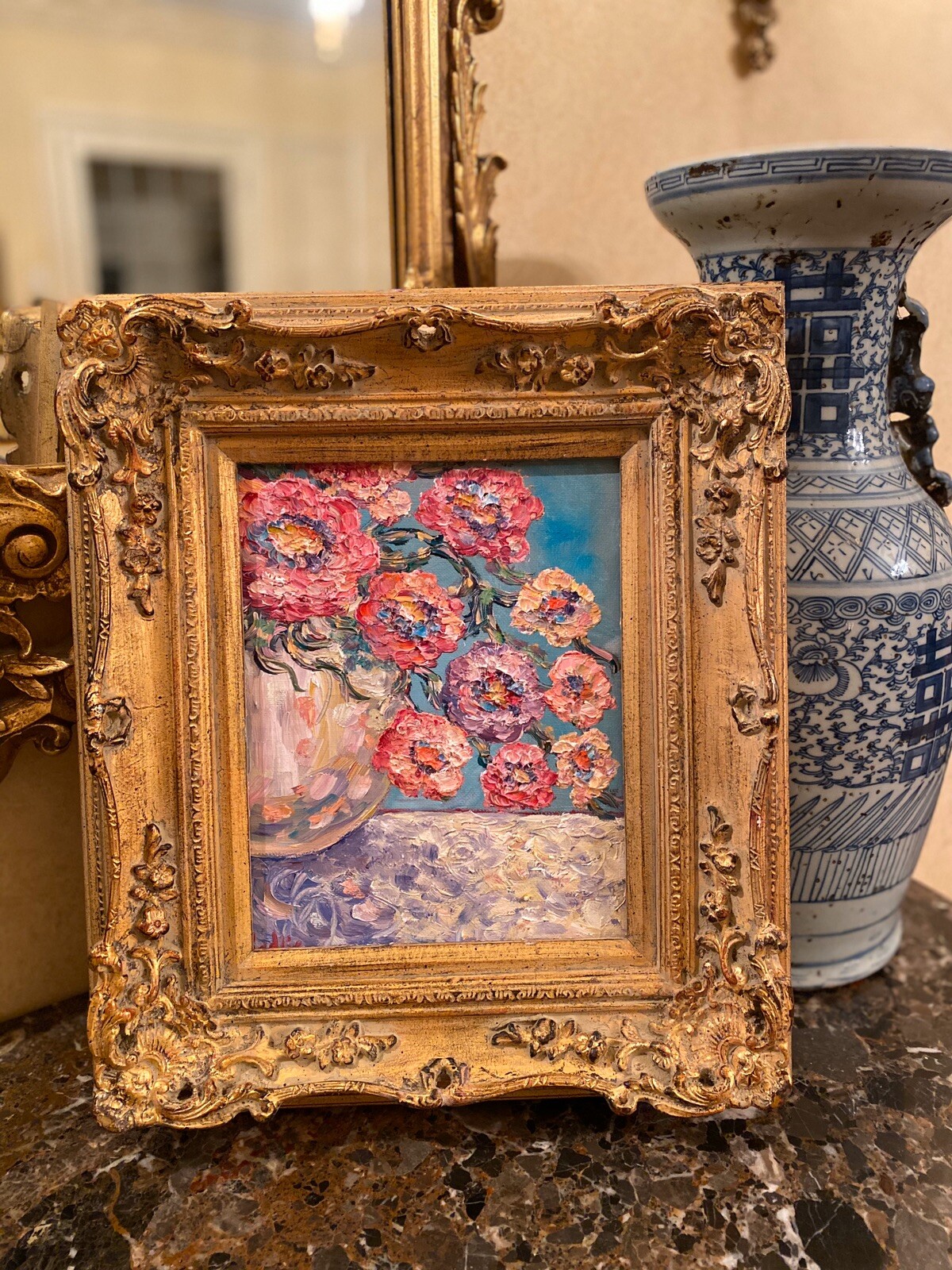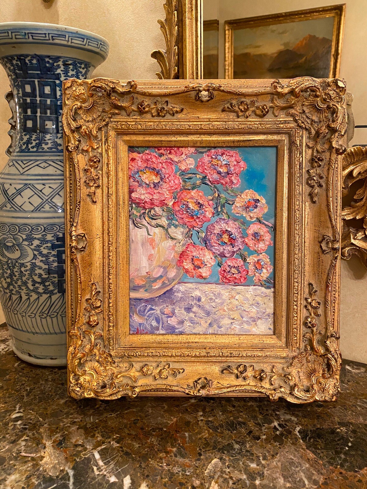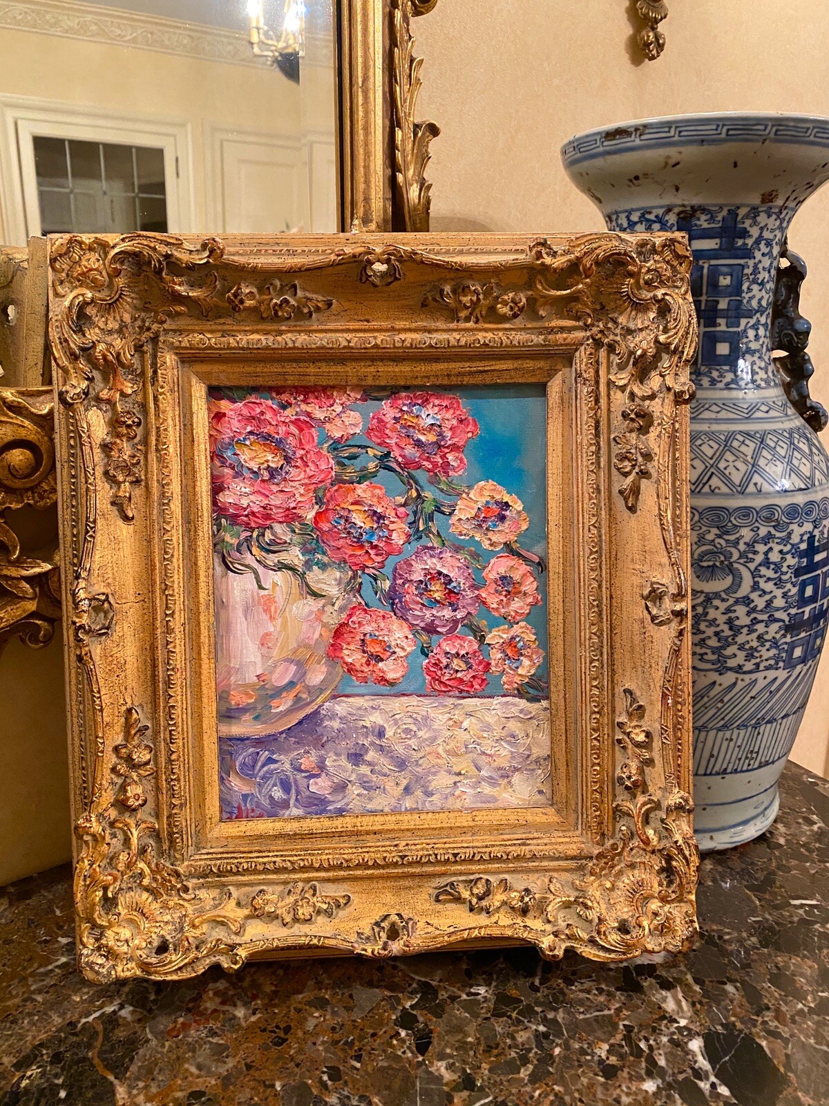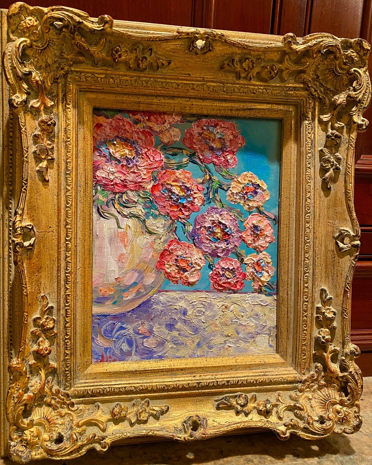 "Abstract Floral Still Life II”, Original Oil Painting by artist Sarah Kadlic. Abstract rendering of a field of wild flowers by the sea against sweeping skies with lots of movement this shimmering oil. Thick, colorful texture design is her signature style. Painted brush and palette knife. Completed with finest materials on one Canvas panel, sized 8" high by 10" wide. Framed in a stunning European Carved French Frame with Gilt highlights. An original painting, signed by artist, not print or reproduction of any kind.