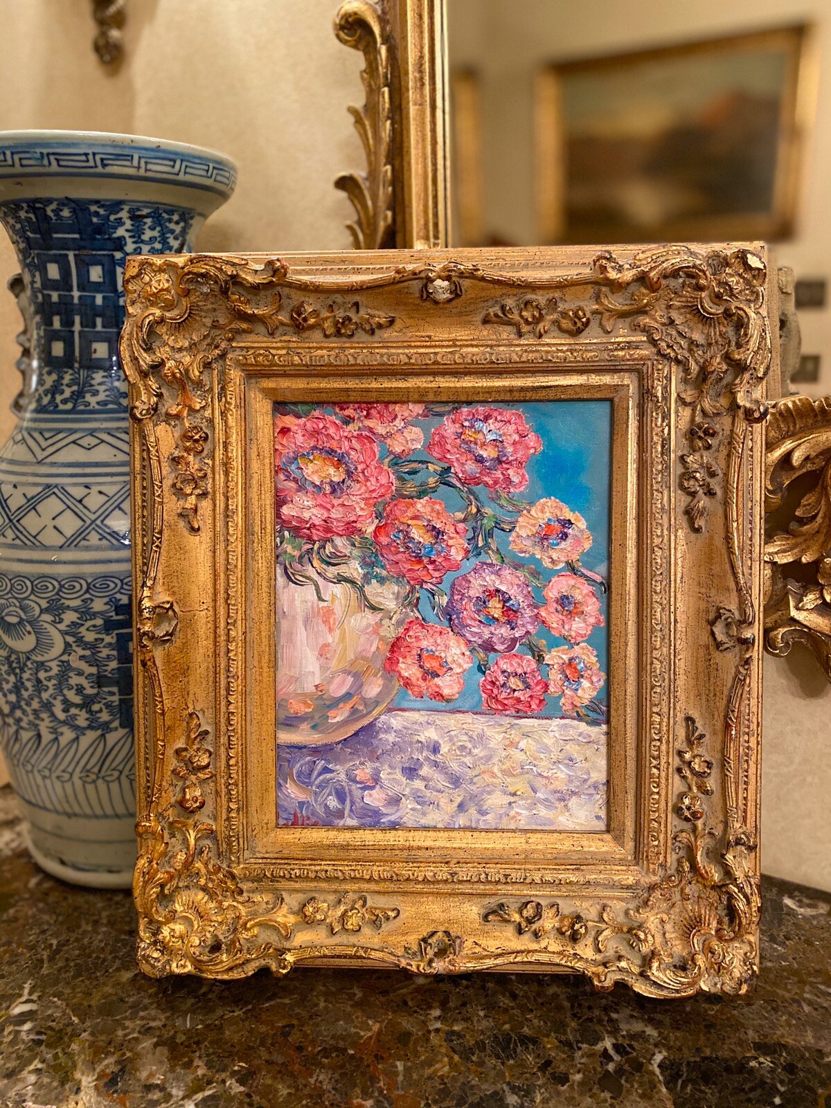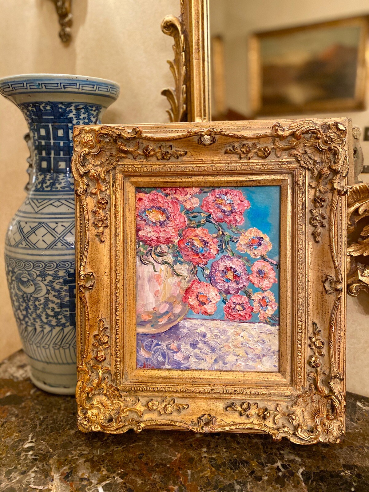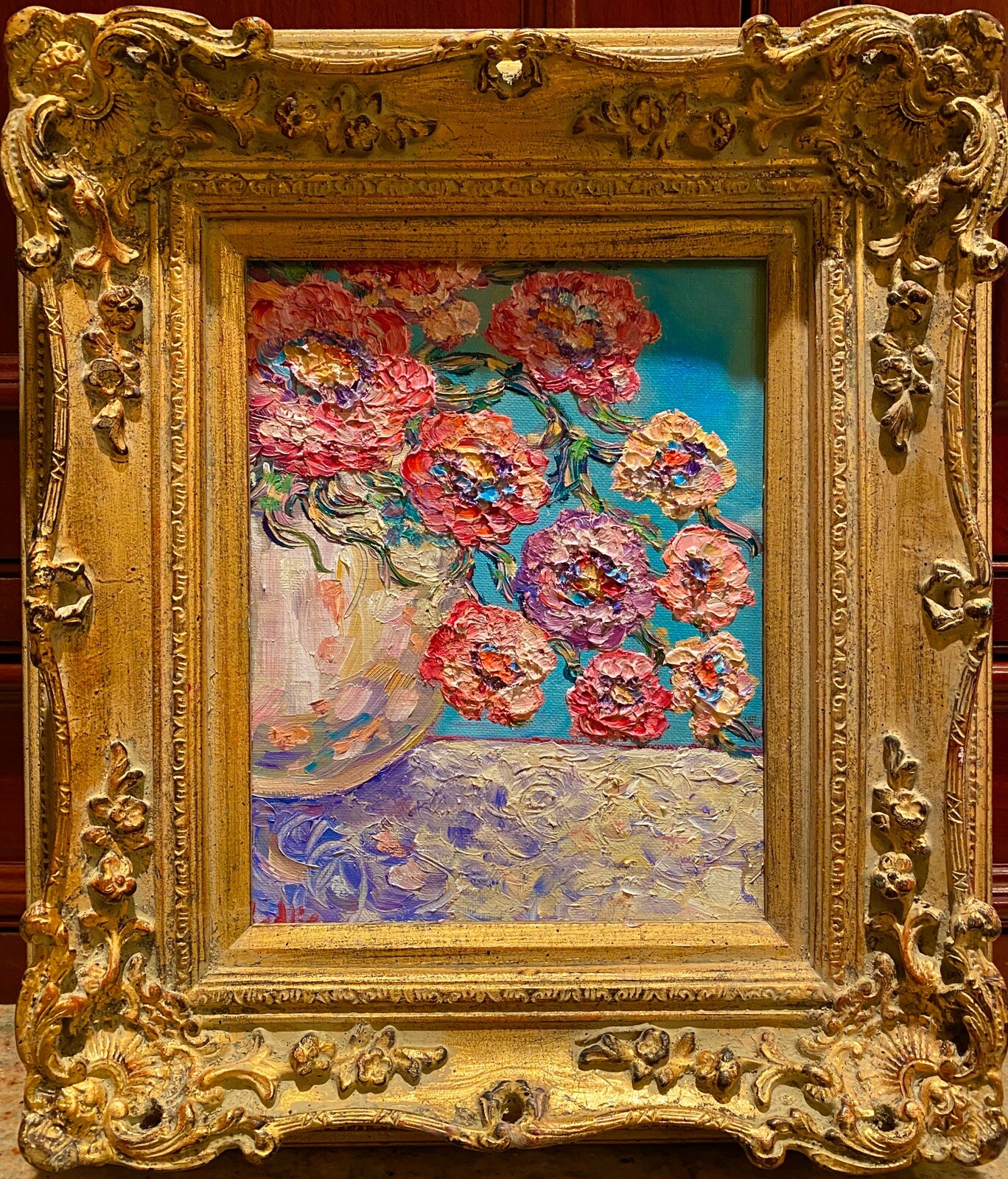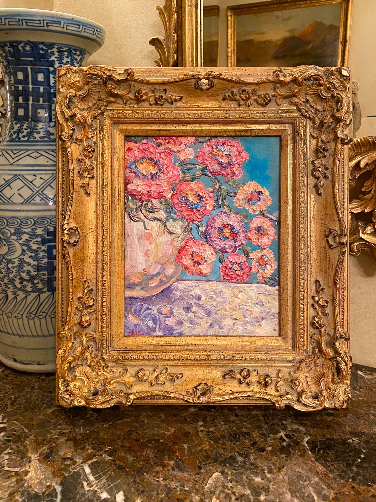 "Abstract Floral Still Life II”, Original Oil Painting by artist Sarah Kadlic. Abstract rendering of a field of wild flowers by the sea against sweeping skies with lots of movement this shimmering oil. Thick, colorful texture design is her signature style. Painted brush and palette knife. Completed with finest materials on one Canvas panel, sized 8" high by 10" wide. Framed in a stunning European Carved French Frame with Gilt highlights. An original painting, signed by artist, not print or reproduction of any kind.