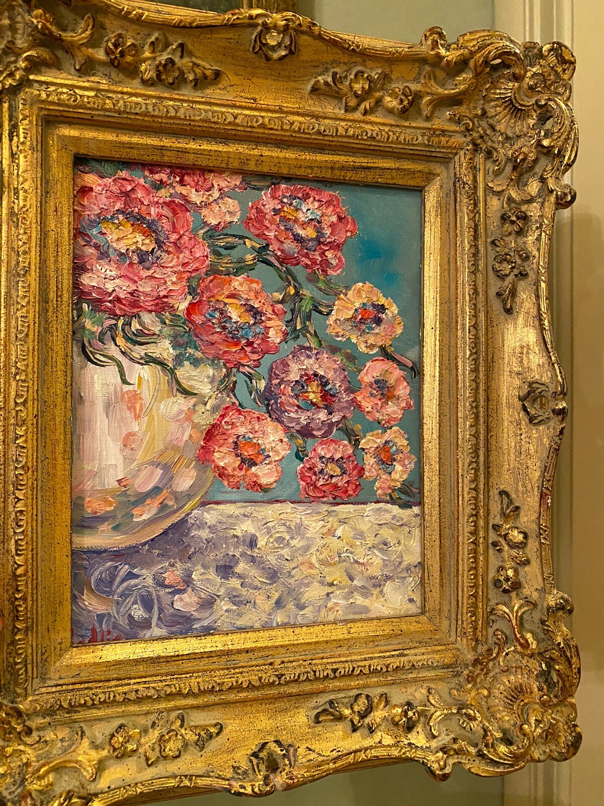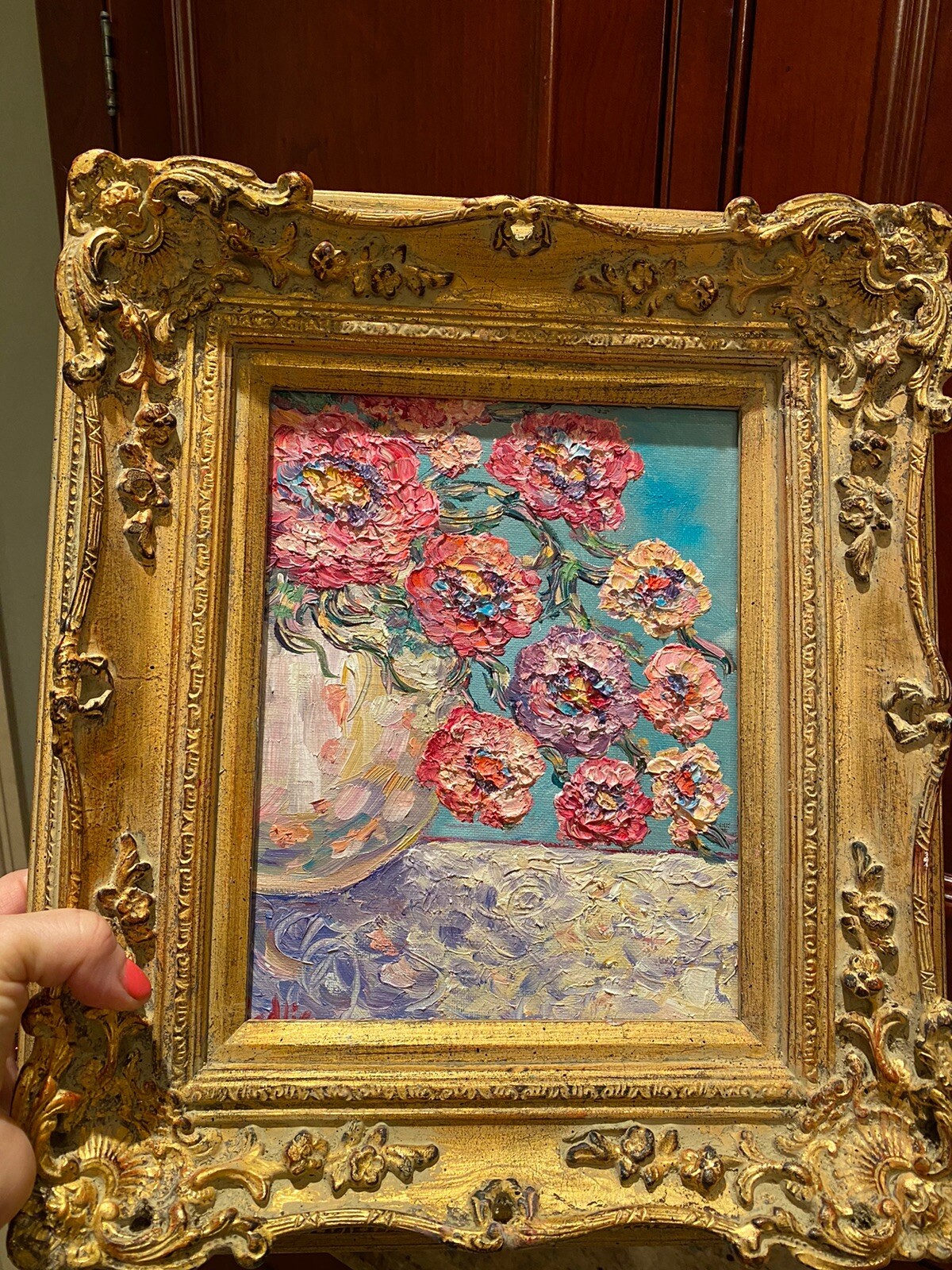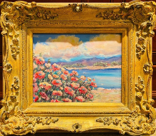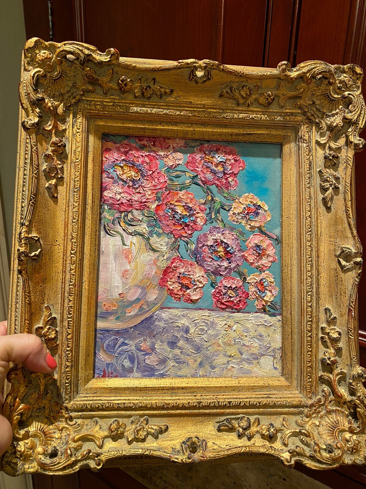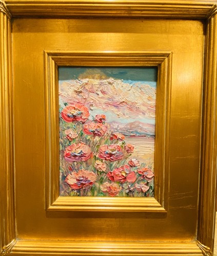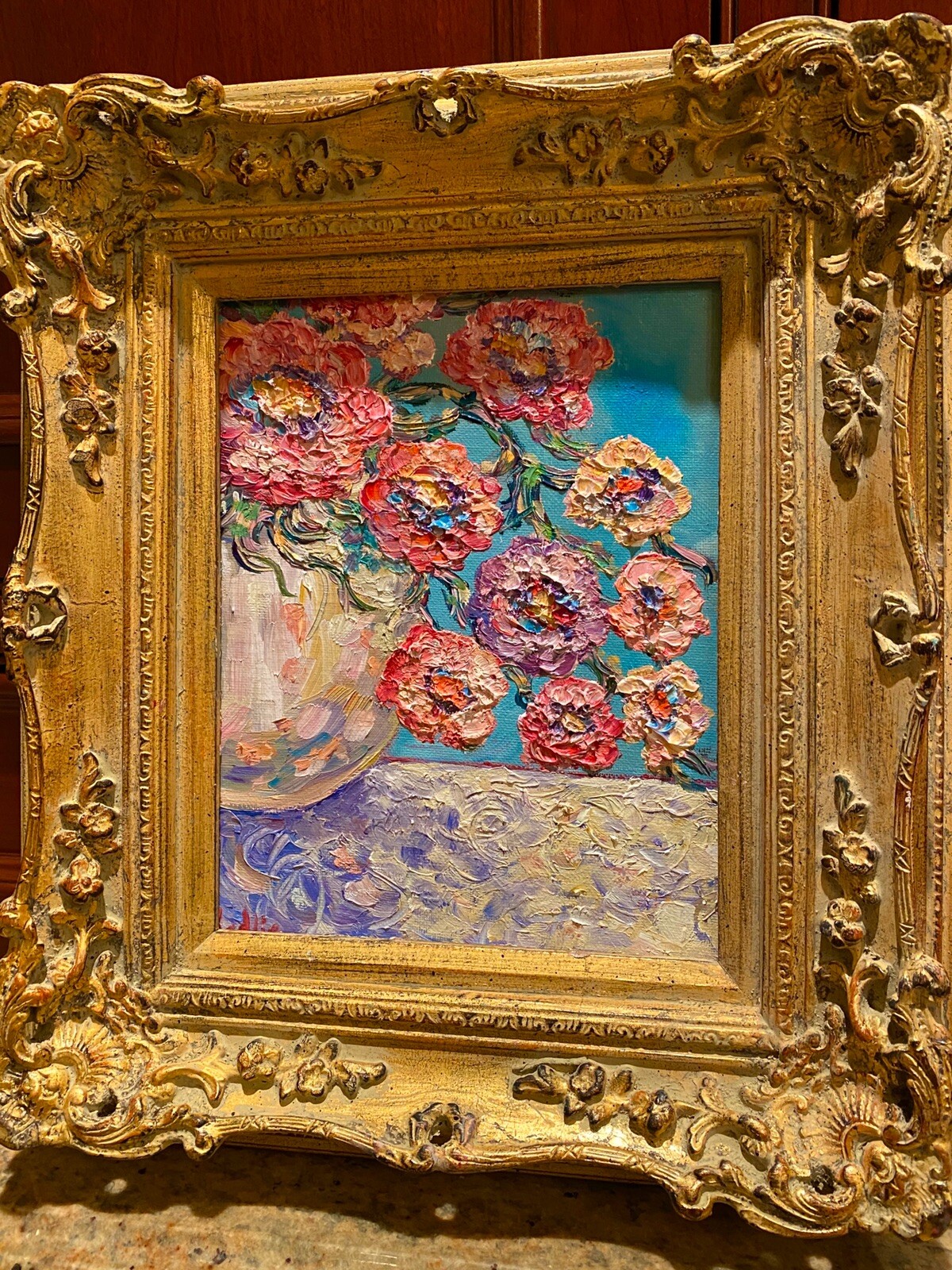 "Abstract Floral Still Life II”, Original Oil Painting by artist Sarah Kadlic. Abstract rendering of a field of wild flowers by the sea against sweeping skies with lots of movement this shimmering oil. Thick, colorful texture design is her signature style. Painted brush and palette knife. Completed with finest materials on one Canvas panel, sized 8" high by 10" wide. Framed in a stunning European Carved French Frame with Gilt highlights. An original painting, signed by artist, not print or reproduction of any kind.