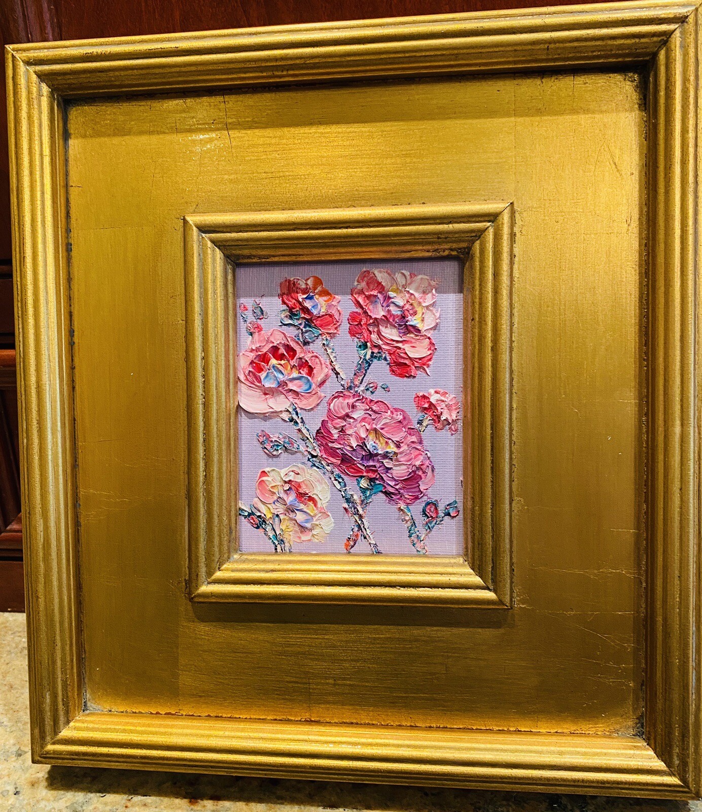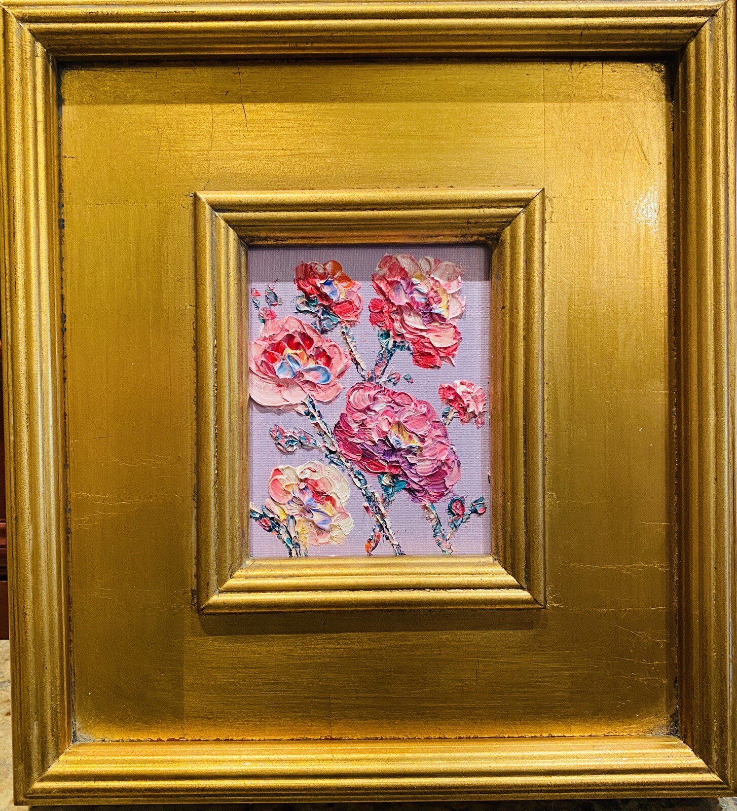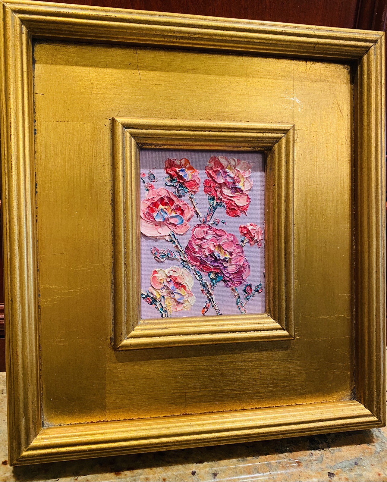 “Impressionist Wildflowers ”, Original Oil Painting by artist Sarah Kadlic. Abstract Impressionist garden wildflowers with lots of color movement in this shimmering oil. Thick, colorful texture design is her signature style. Painted brush and palette knife. Completed with finest materials on one Canvas panel, sized 4" high by 5" wide. Framed in a stunning ornate carved Wood Frame with Gilt highlights that takes the piece to 10”x11". An original painting, signed by artist, not print or reproduction of any kind.