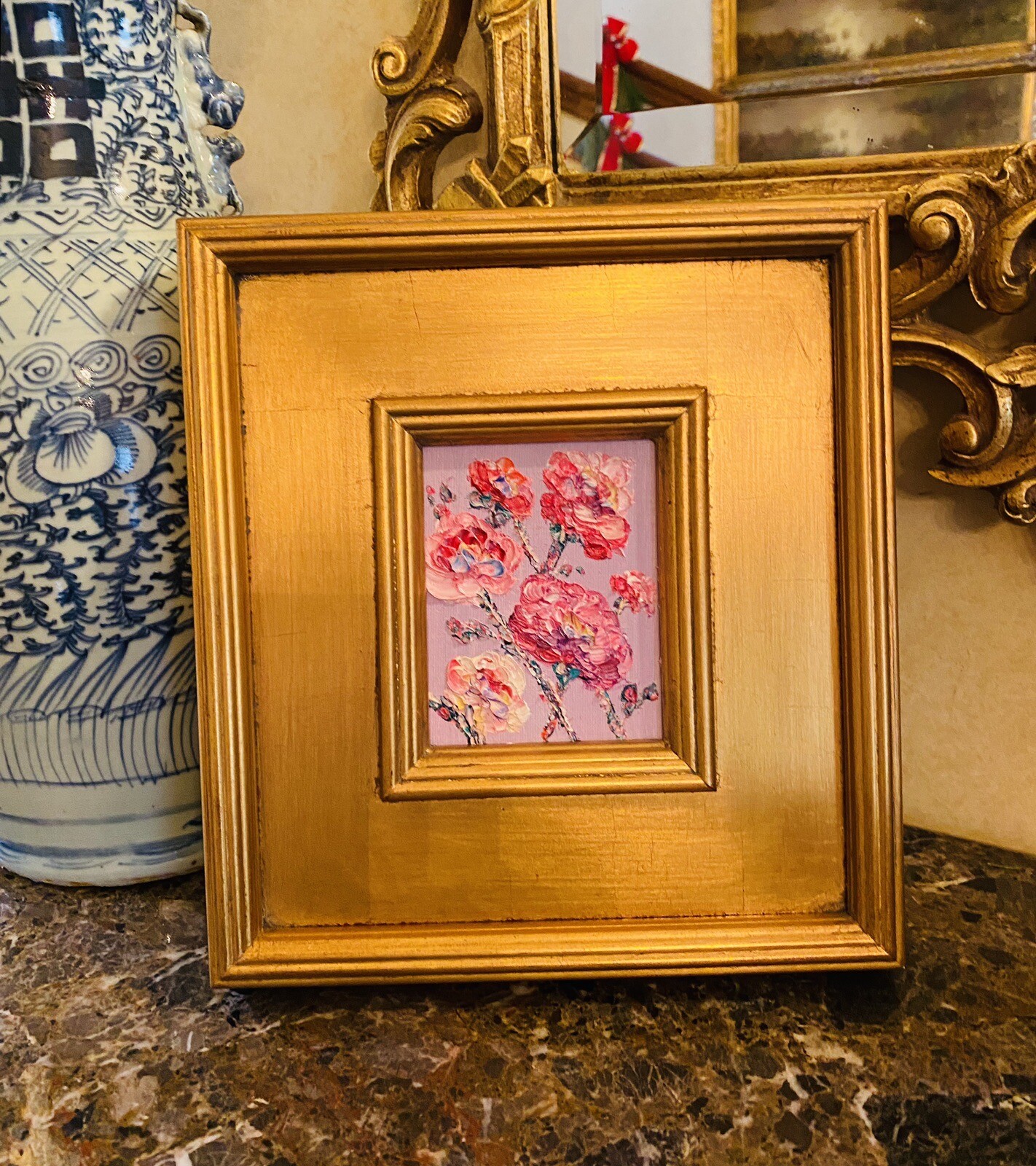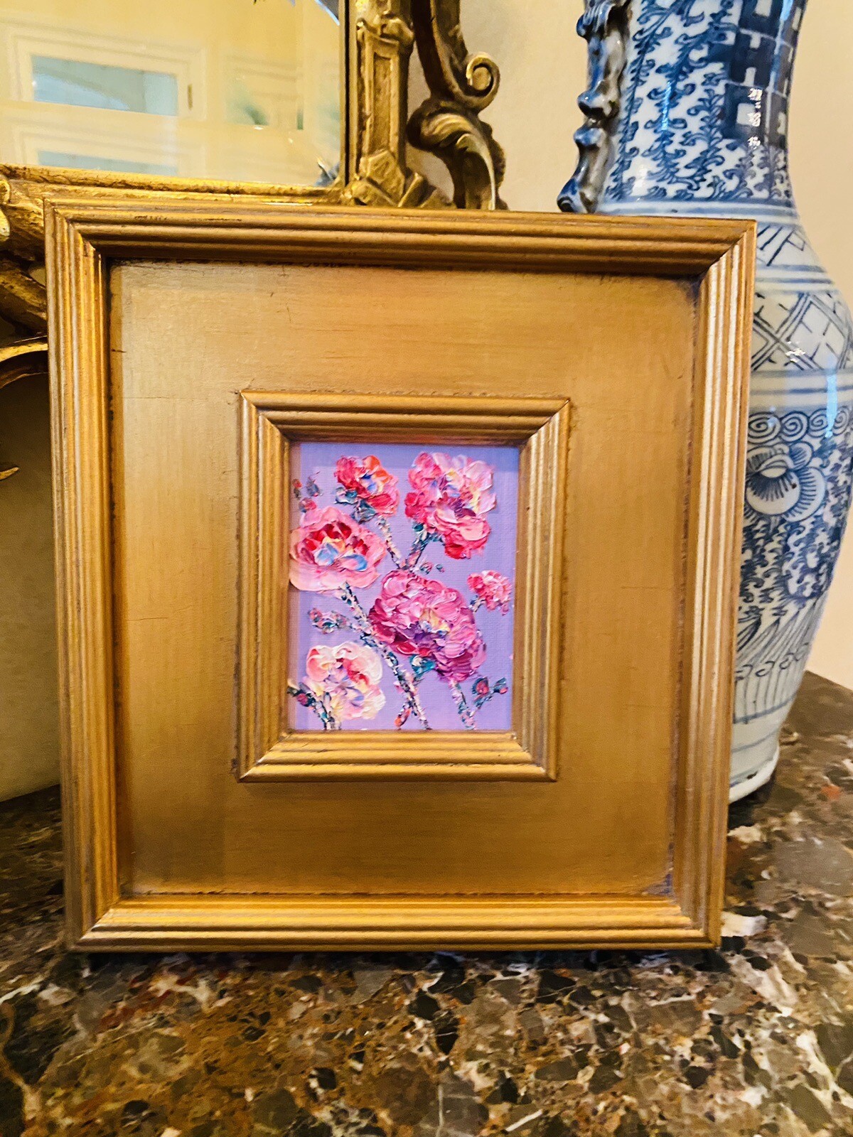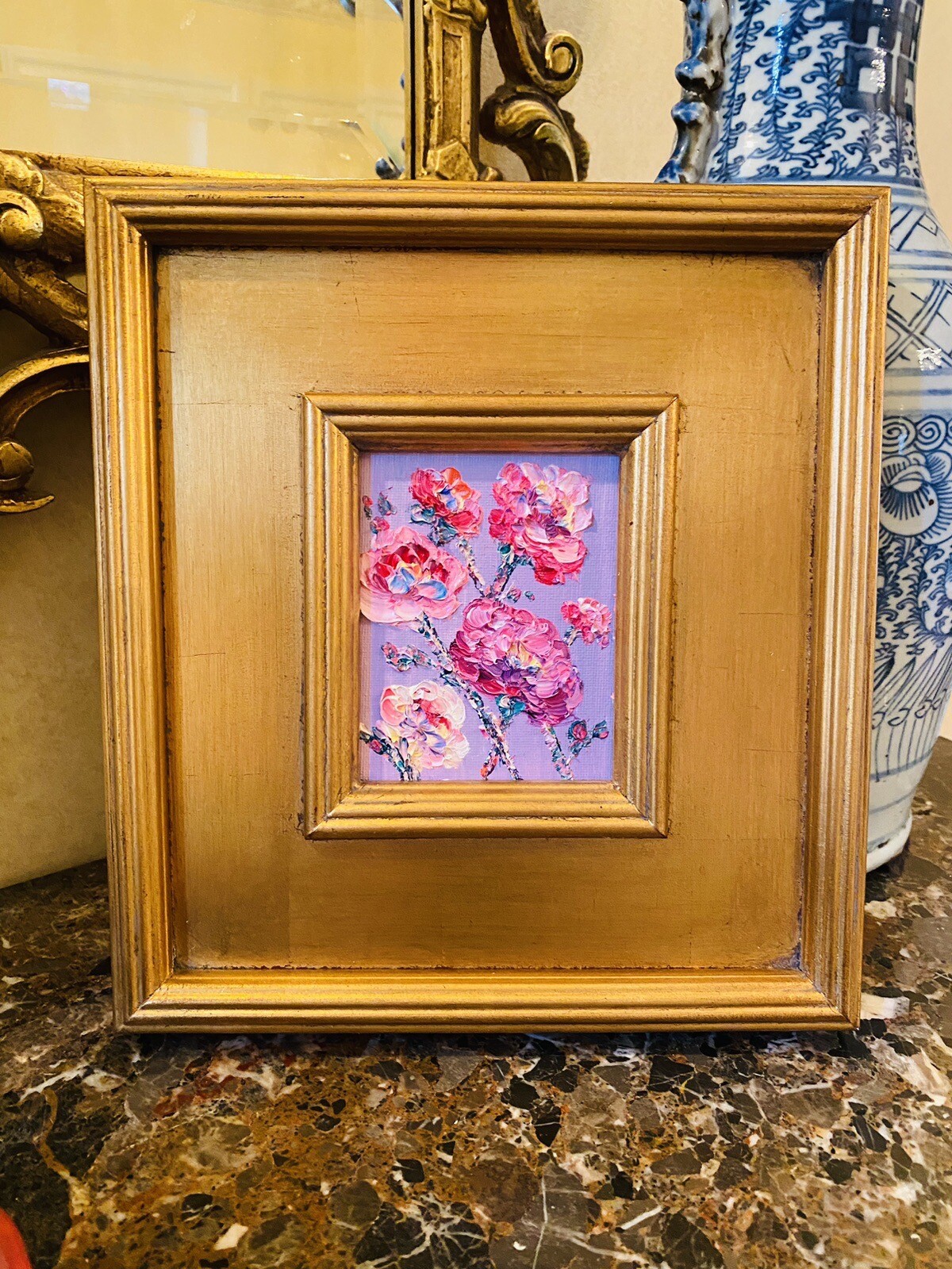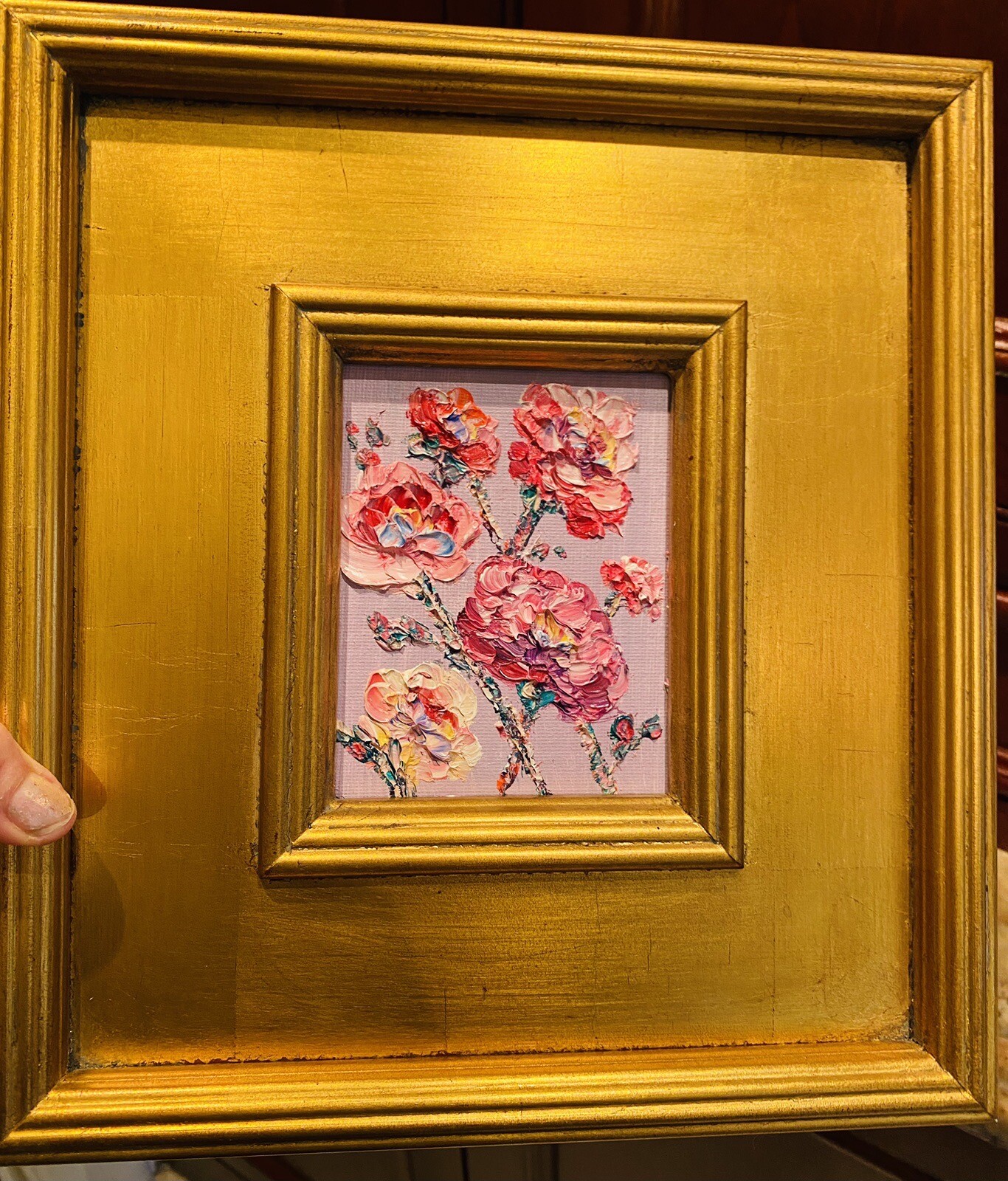 “Impressionist Wildflowers ”, Original Oil Painting by artist Sarah Kadlic. Abstract Impressionist garden wildflowers with lots of color movement in this shimmering oil. Thick, colorful texture design is her signature style. Painted brush and palette knife. Completed with finest materials on one Canvas panel, sized 4" high by 5" wide. Framed in a stunning ornate carved Wood Frame with Gilt highlights that takes the piece to 10”x11". An original painting, signed by artist, not print or reproduction of any kind.
