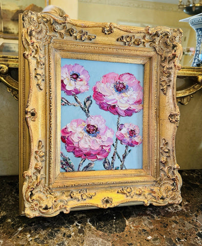 “Impressionist Wildflowers ”, Original Oil Painting by artist Sarah Kadlic. Abstract Impressionist garden wildflowers with lots of color movement in this shimmering oil. Thick, colorful texture design is her signature style. Painted brush and palette knife. Completed with finest materials on one Canvas panel, sized 8" high by 10" wide. Framed in a stunning ornate carved Wood Frame with Gilt highlights that takes the piece to 13”x15". An original painting, signed by artist, not print or reproduction of any kind.