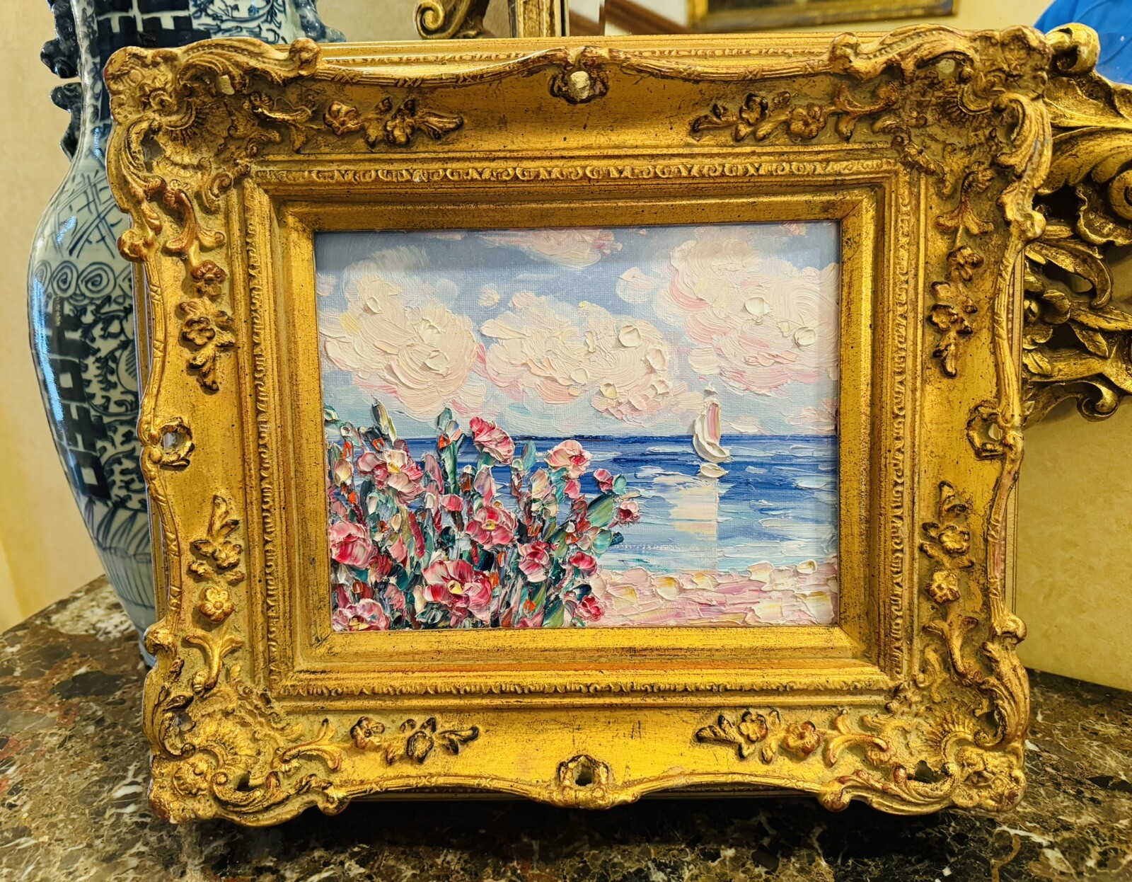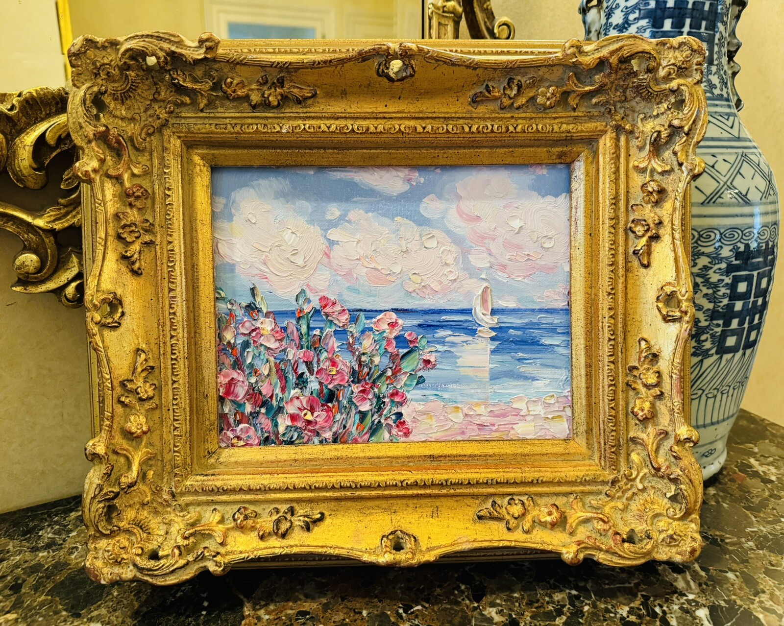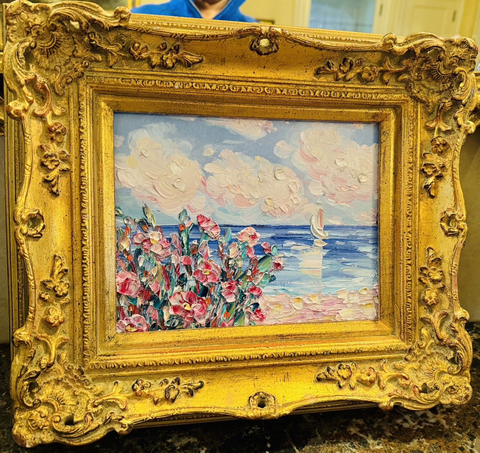 “Impressionist Wildflowers Seascape ”, Original Oil Painting by artist Sarah Kadlic. Abstract Impressionist wildflowers against a seascape with sailboat with lots of color movement in this shimmering oil. Thick, colorful texture design is her signature style. Painted brush and palette knife. Completed with finest materials on one Canvas panel, sized 8" high by 10" wide. Framed in a stunning ornate carved Wood Frame with Gilt highlights that takes the piece to 13”x15". An original painting, signed by artist, not print or reproduction of any kind.