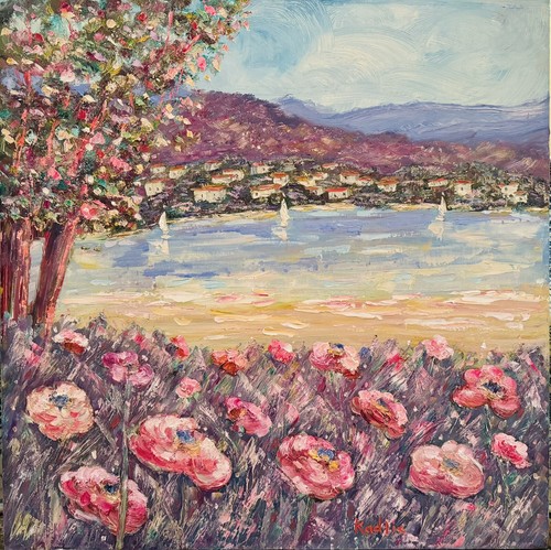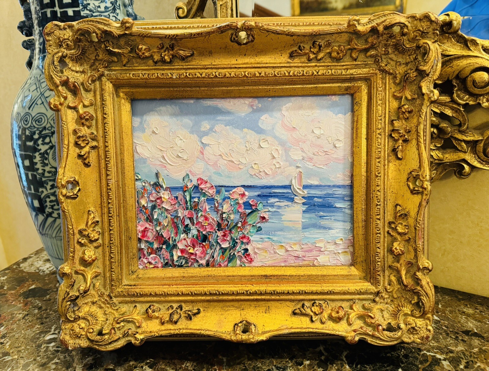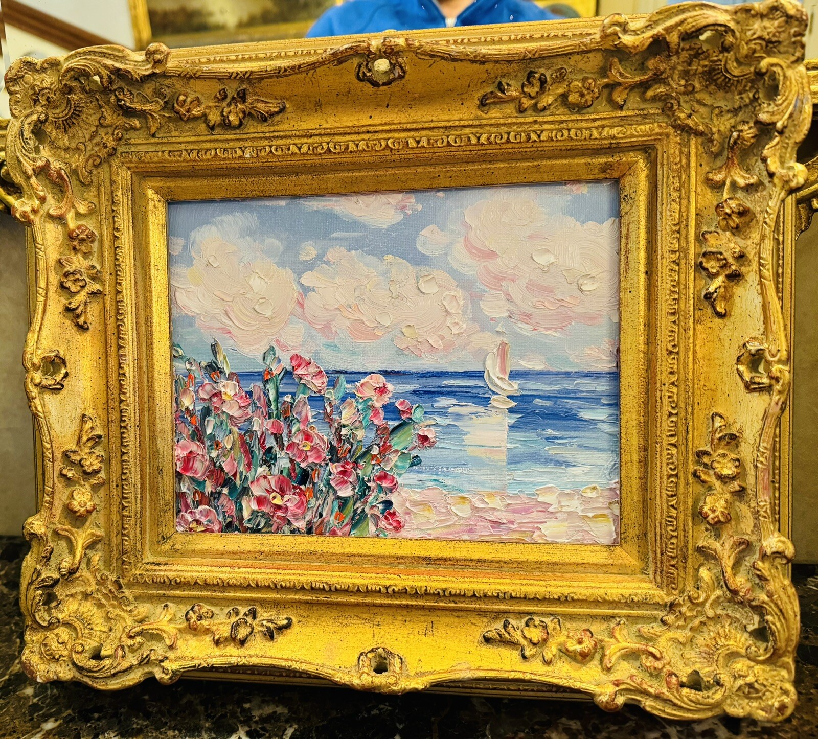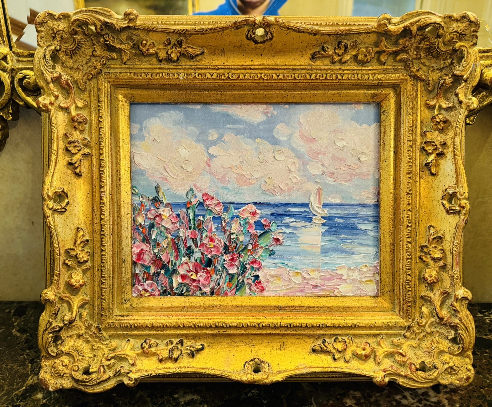“Impressionist Wildflowers Seascape ”, Original Oil Painting by artist Sarah Kadlic. Abstract Impressionist wildflowers against a seascape with sailboat with lots of color movement in this shimmering oil. Thick, colorful texture design is her signature style. Painted brush and palette knife. Completed with finest materials on one Canvas panel, sized 8" high by 10" wide. Framed in a stunning ornate carved Wood Frame with Gilt highlights that takes the piece to 13”x15". An original painting, signed by artist, not print or reproduction of any kind.