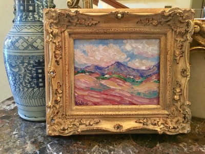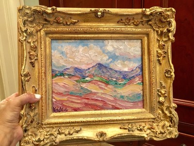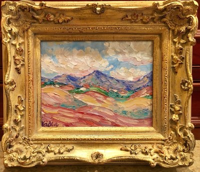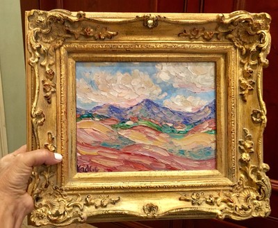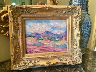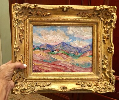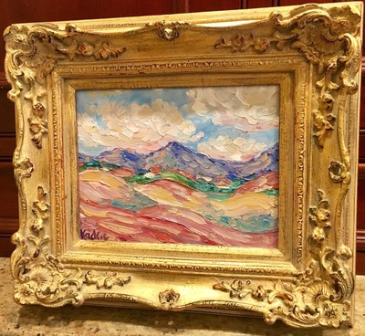 "Tuscany Italy Country Landscape", Original Oil Painting by artist Sarah Kadlic. Abstract impasto rendering of a Tuscan hillside view with mountains and sweeping skies with lots of movement this shimmering oil. Thick, colorful texture design is her signature style. Painted brush and palette knife. Completed with finest materials on one Canvas panel, sized 8" high by 10" wide. Framed in a stunning European Carved French Frame with Gilt highlights. An original painting, signed by artist, not print or reproduction of any kind.