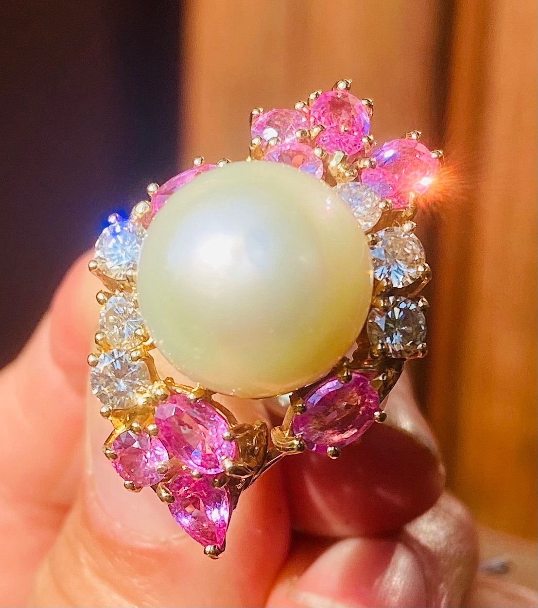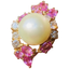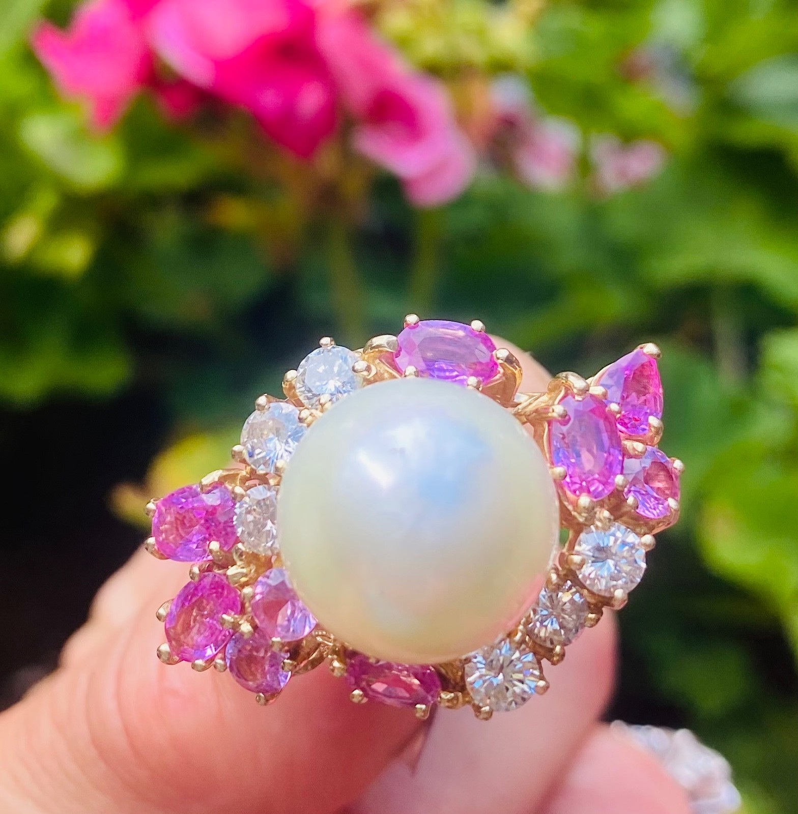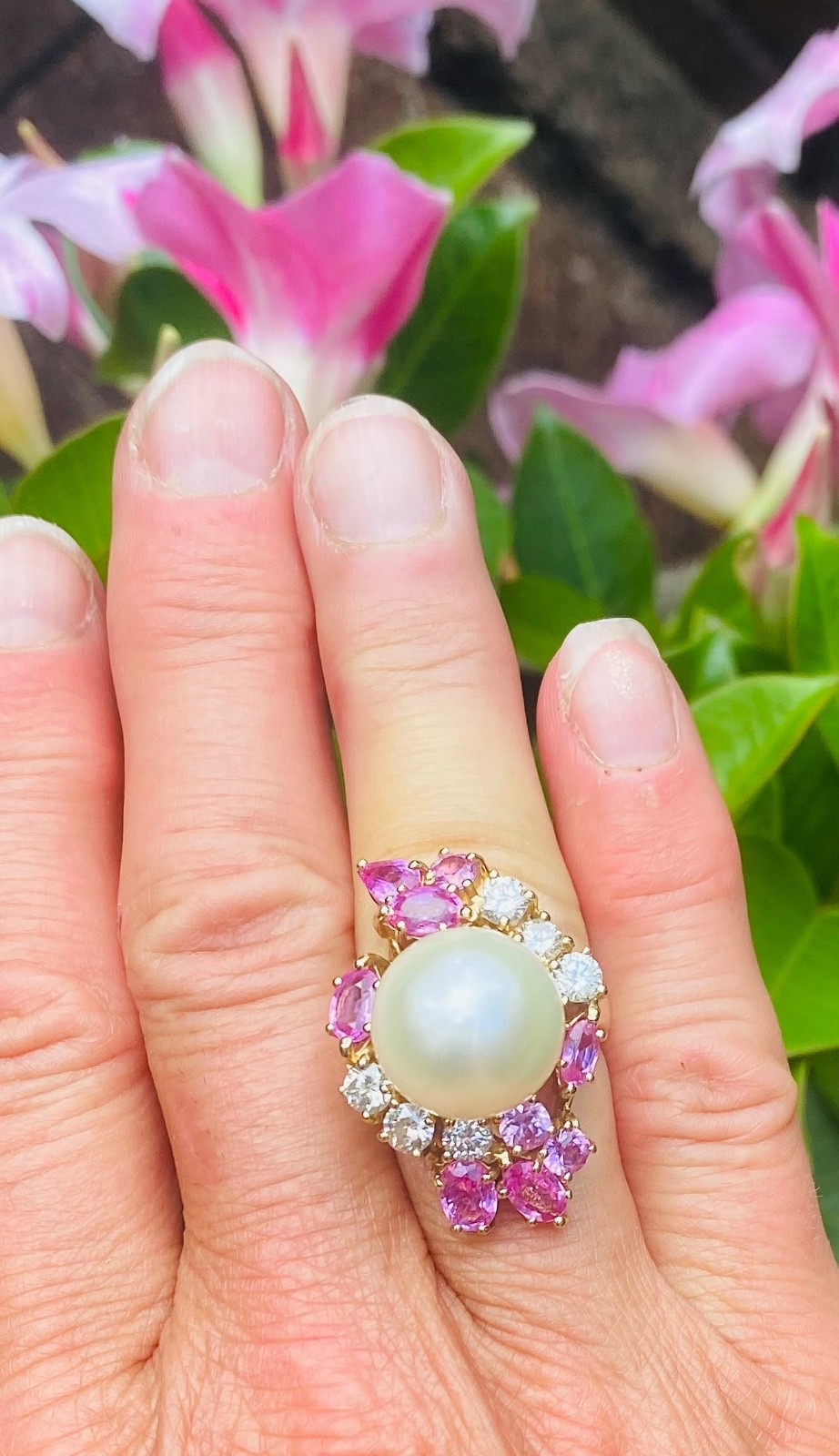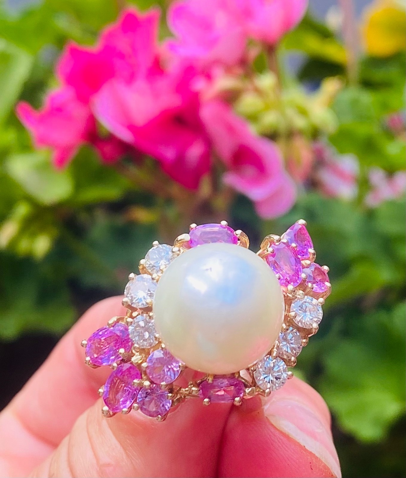 Large Vintage 14k Gold Diamond Pink Sapphire Pearl Statement Ring