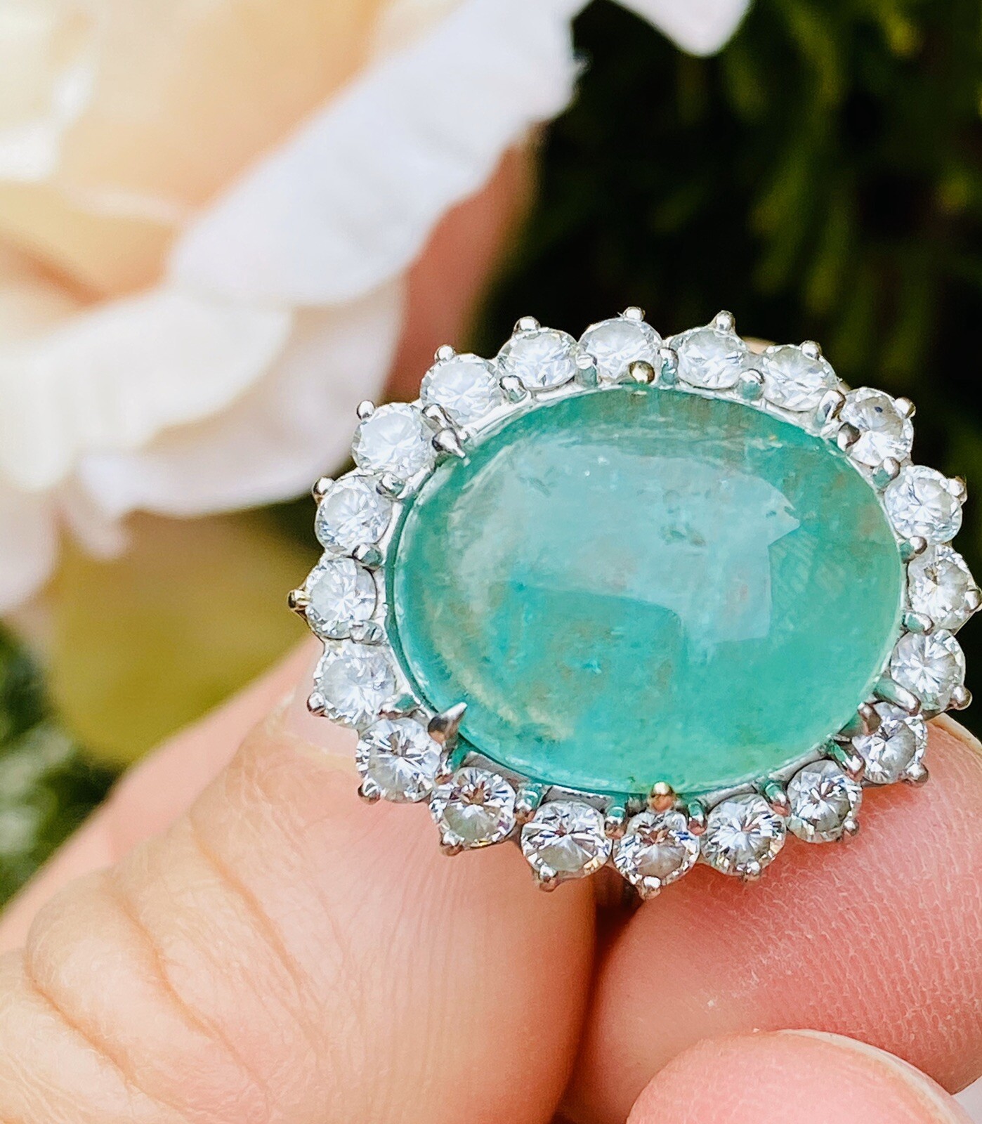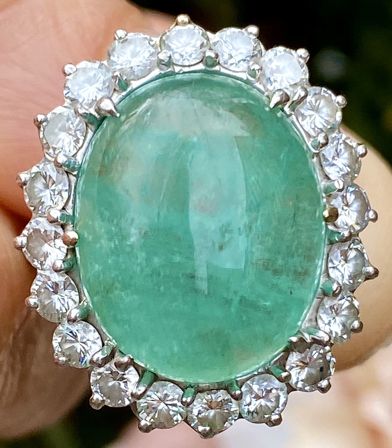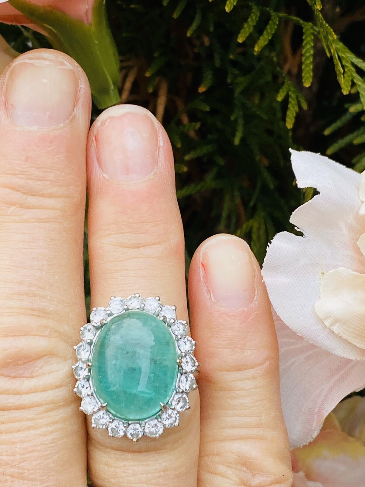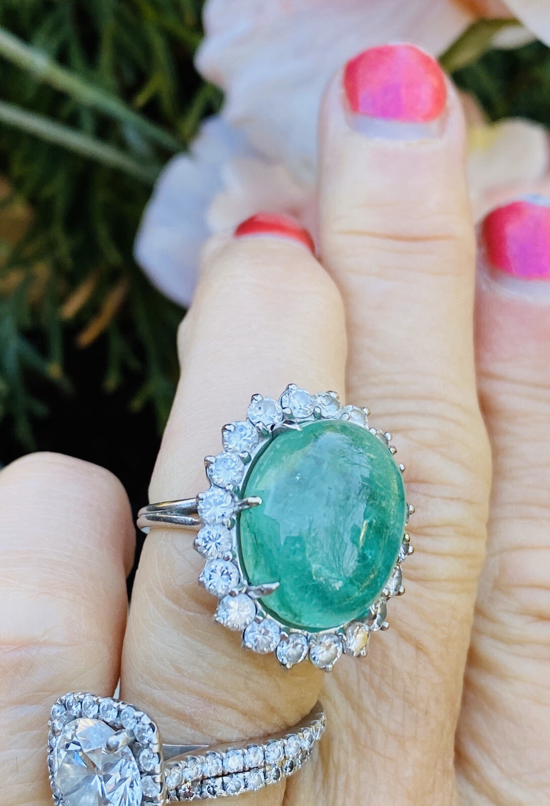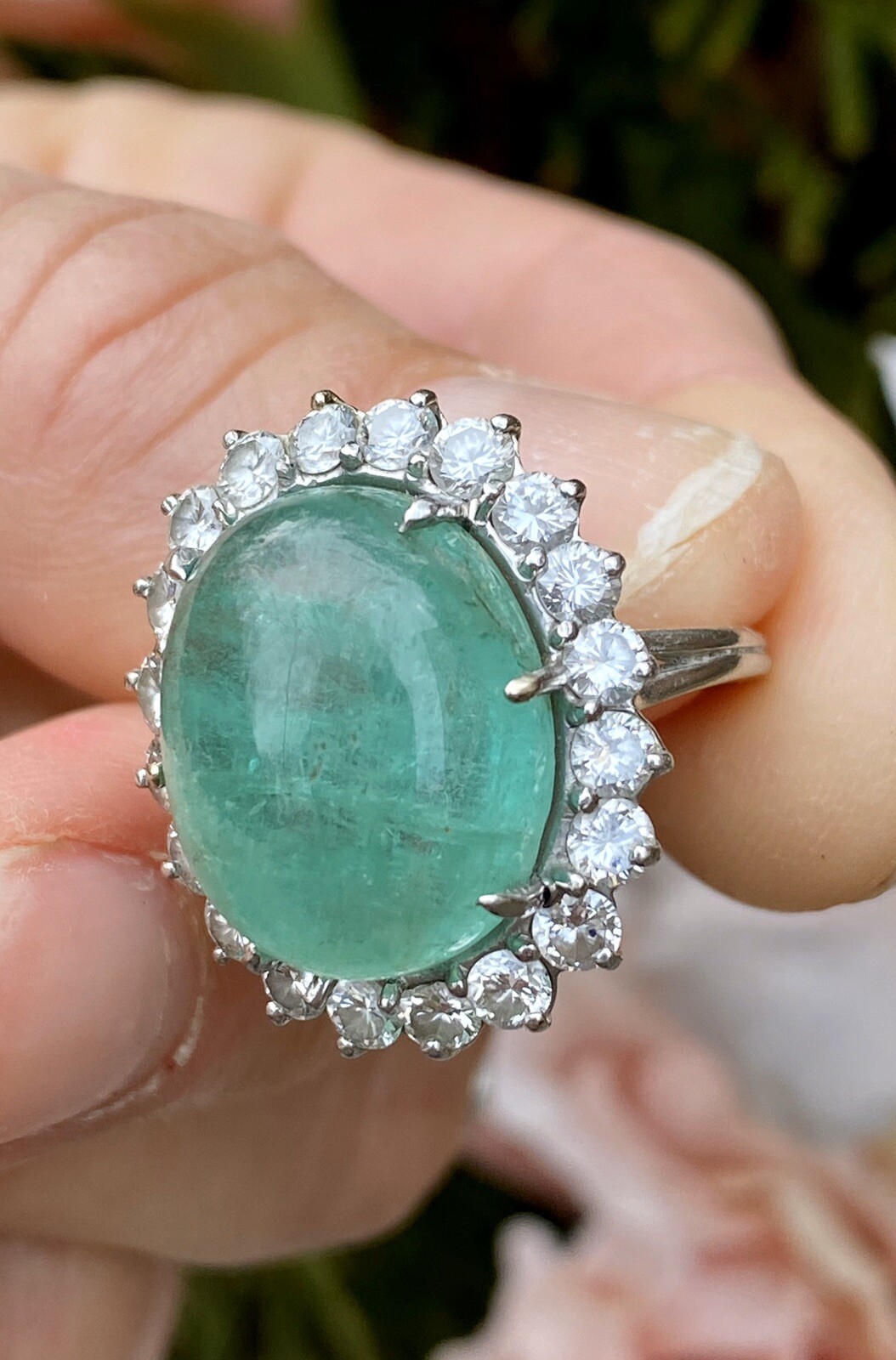 Large Vintage 1950s 10ct Emerald Cabachon VS Diamond Halo Platinum Cocktail Ring